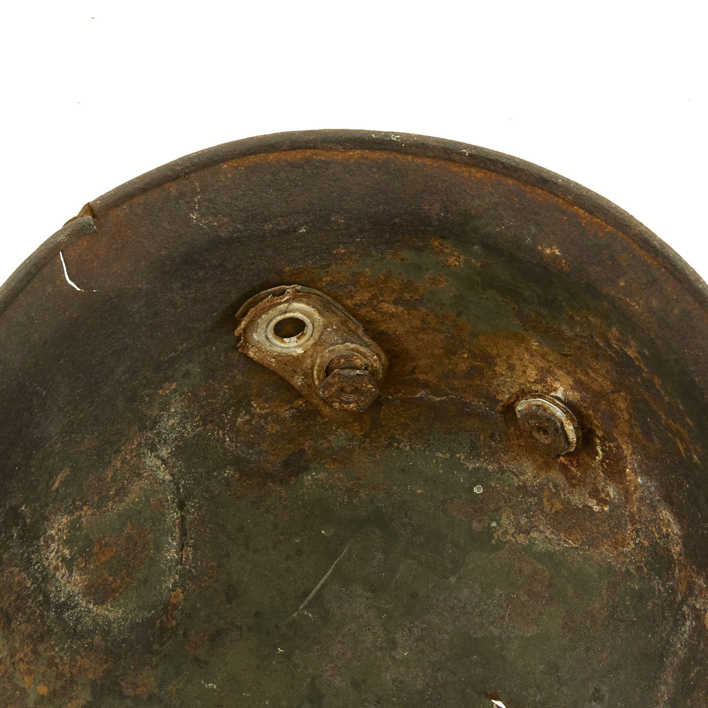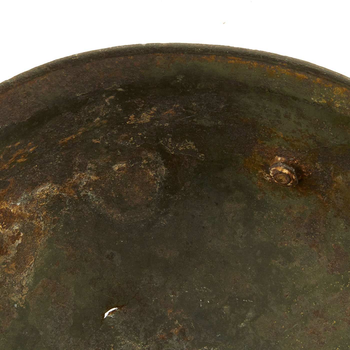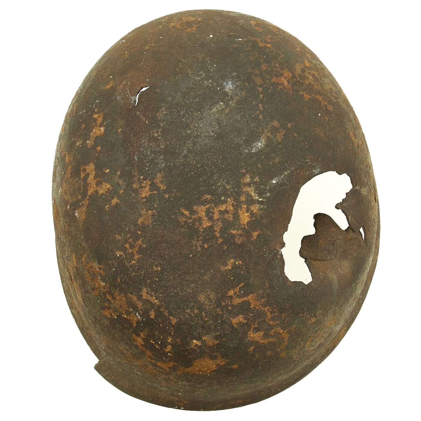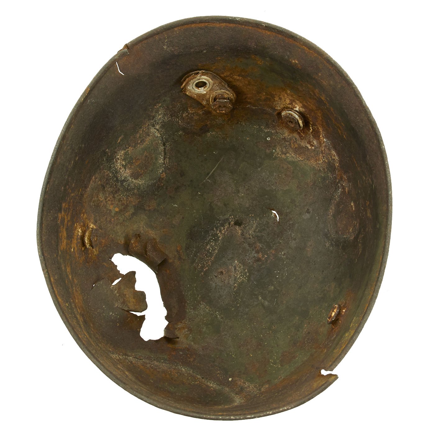 Original Item: One of a Kind. This is a genuine "Battlefield Pickup" example of a German WWII M38 Luftwaffe Fallschirmjäger (Paratrooper) Helmet. It was recovered some time after the war in Lichtenvoorde, a small town in the eastern Netherlands. The helmet had lain for some time undisturbed, so all of the original rigging and liner are completely absent, and it is now just a shell. Amazingly, there is still some of the original paint present, mostly on the inside of the helmet, but overall it is quite rusty, and looks every bit of its age.