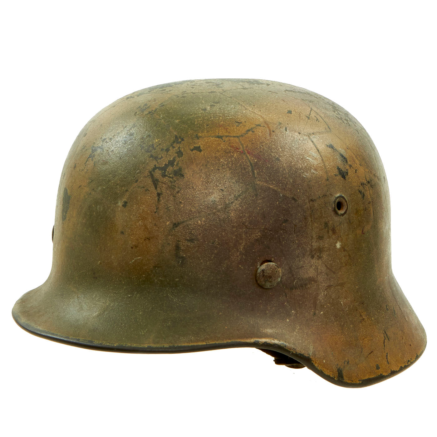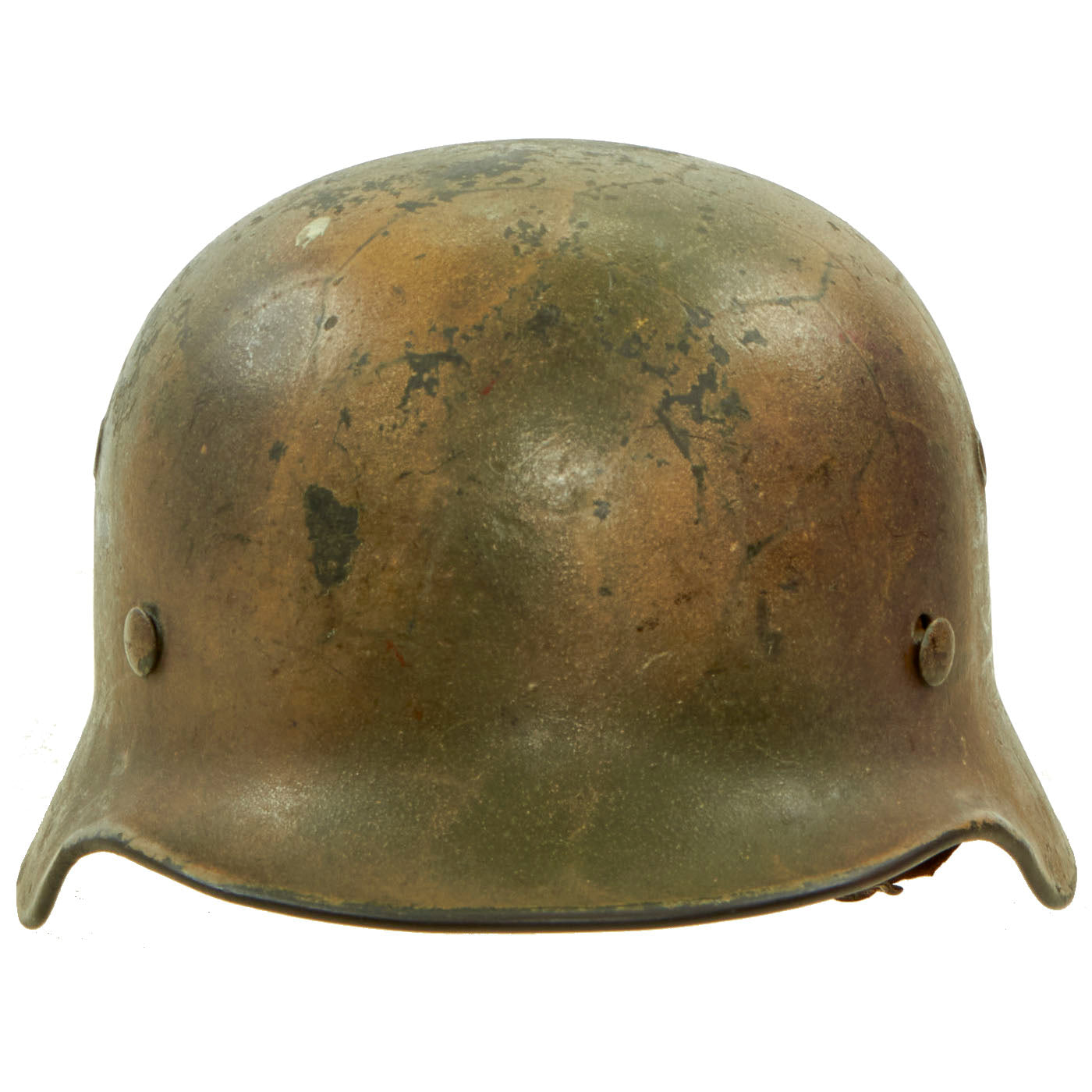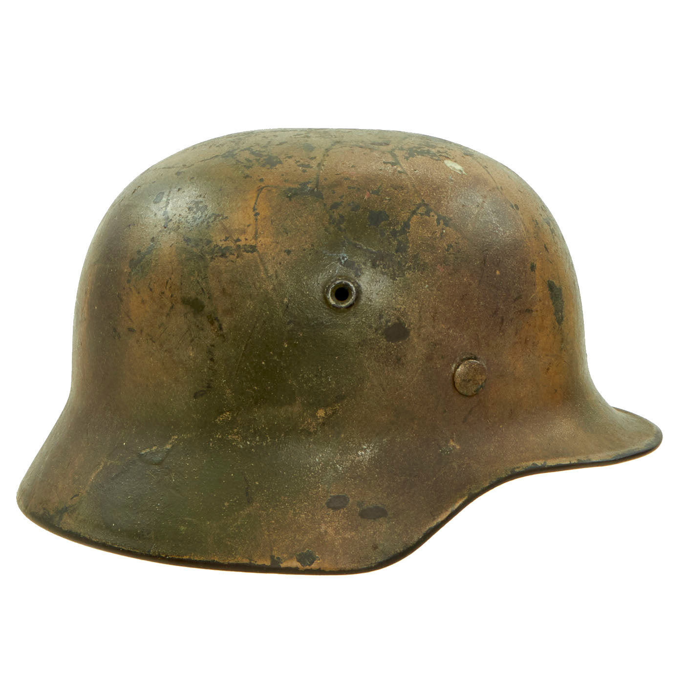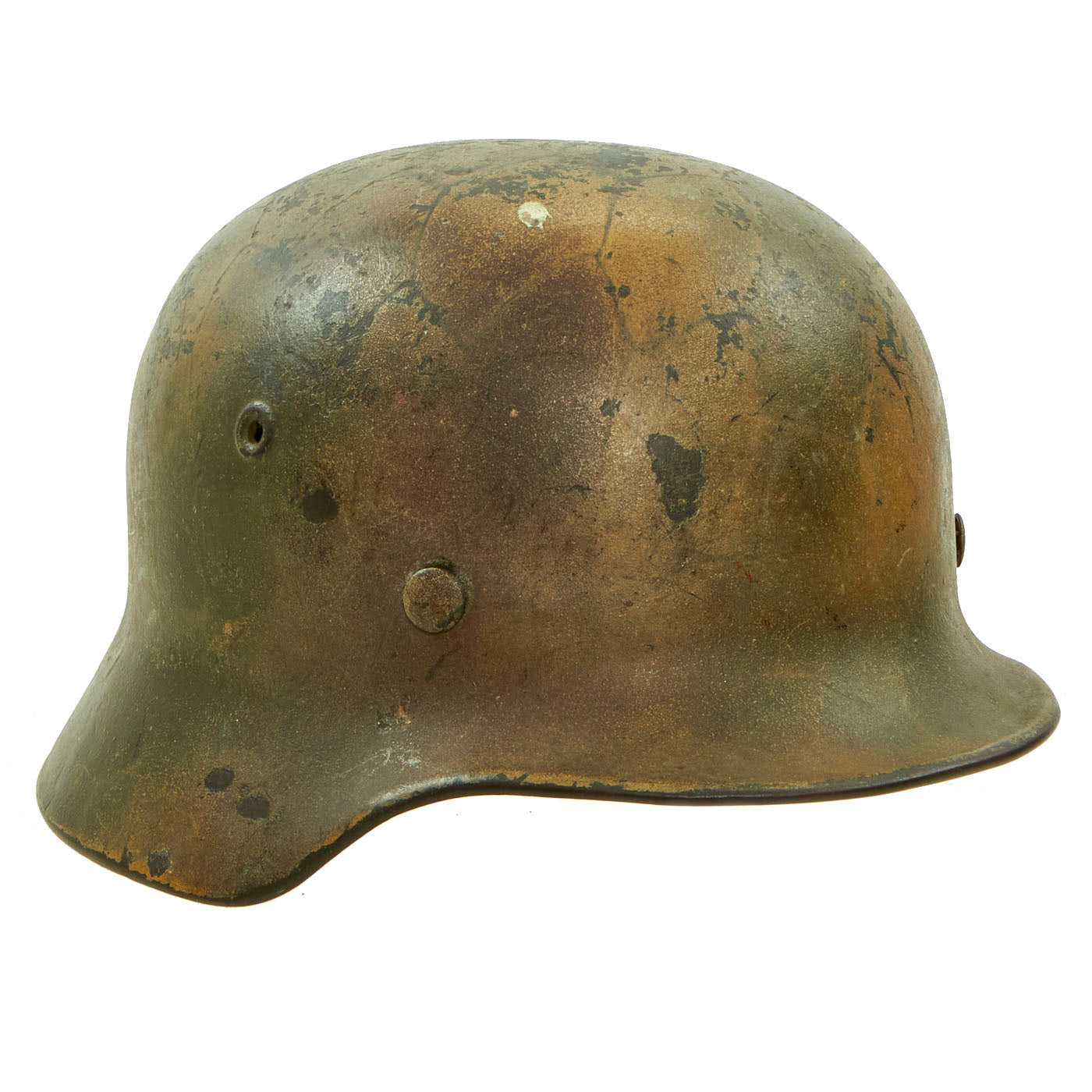 Original Item: One-of-a-kind. This is what we all look for and can never find! An incredible 100% authentic Normandy Camouflage Model 1940 German Helmet! To make things even better, this helmet originally had chicken wire on the outside, which was used to help secure foliage and increase the camouflage profile. This was then removed, leaving a lovely pattern in the paint.