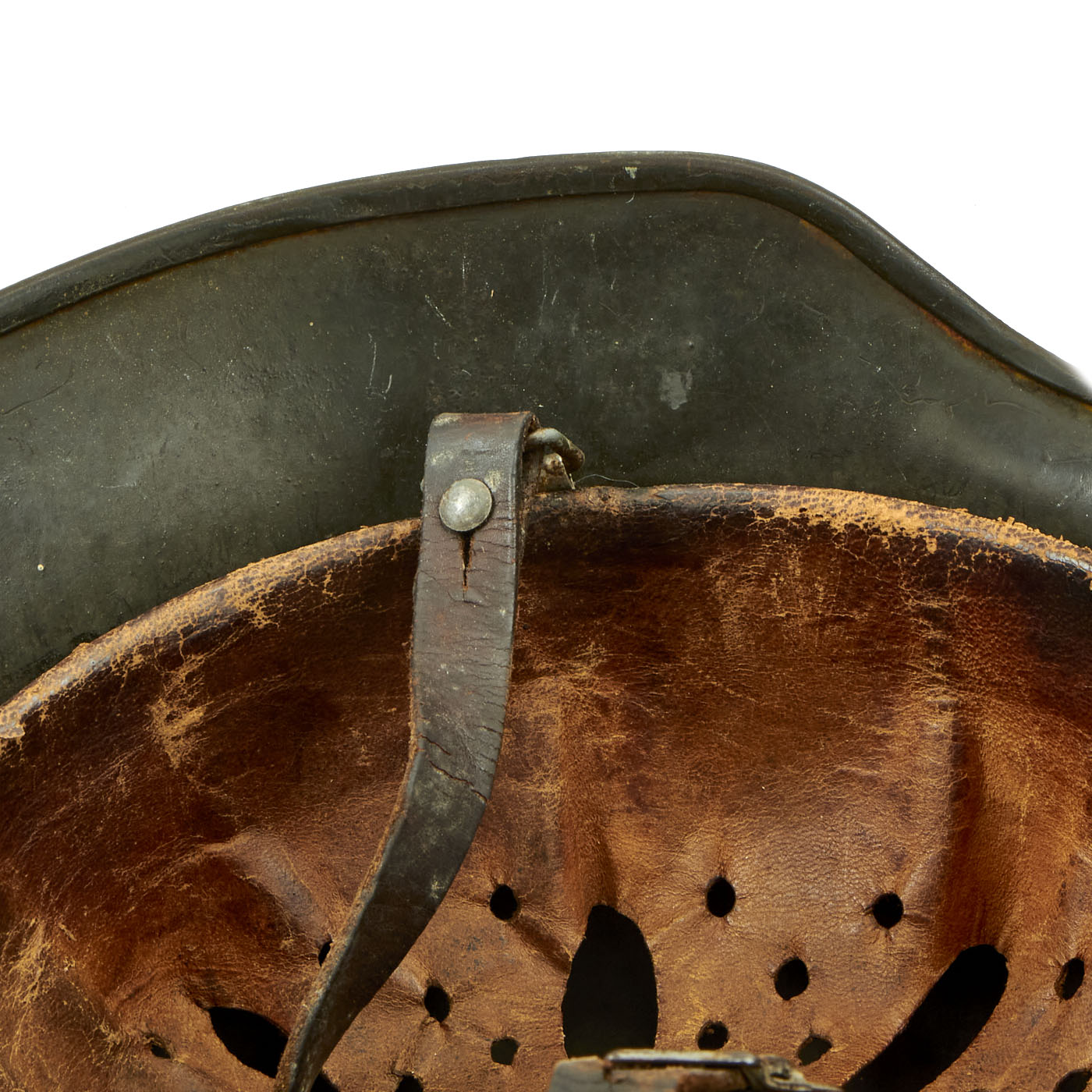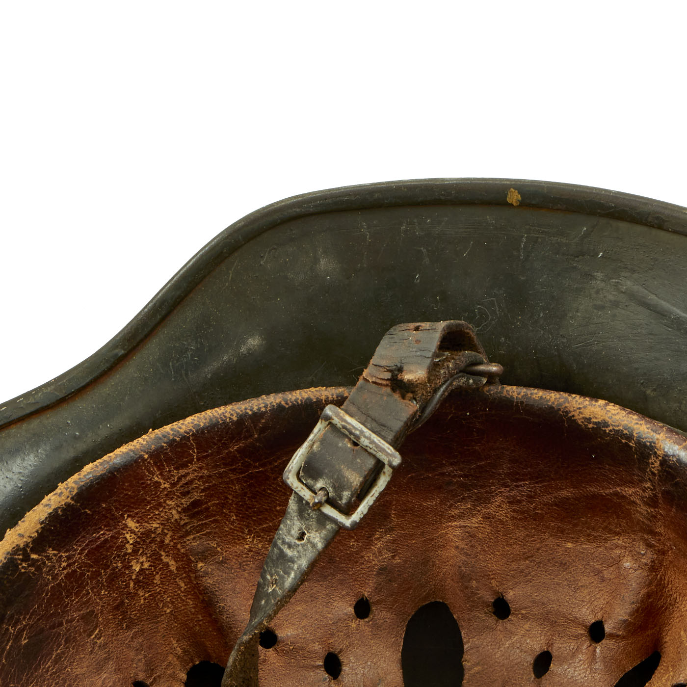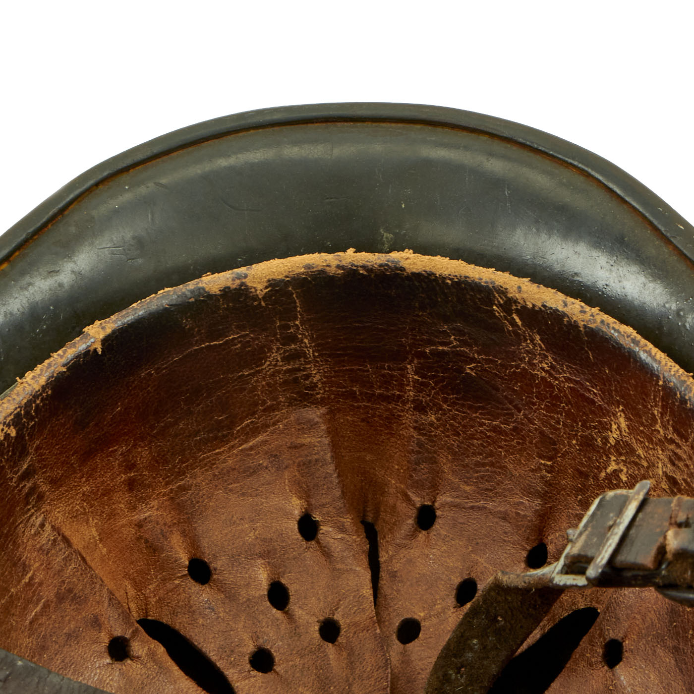 All three liner retaining pins are intact and retain the camouflage paint well, though they have gotten a bit loose over the years.. The interior of the helmet still has the original M31 leather liner with all eight of its fingers intact. The liner does show some flaking around the rim, as is often seen, and has darkened around the edge due to sweat and oil. The original top tie looks to have been replaced at some point. The mid war galvanized steel liner is marked on the left outer side with 62 nA / 54, indicating that the liner is a size 54, intended for a 62 shell. The right side displays the full manufacture information, as well as a date: