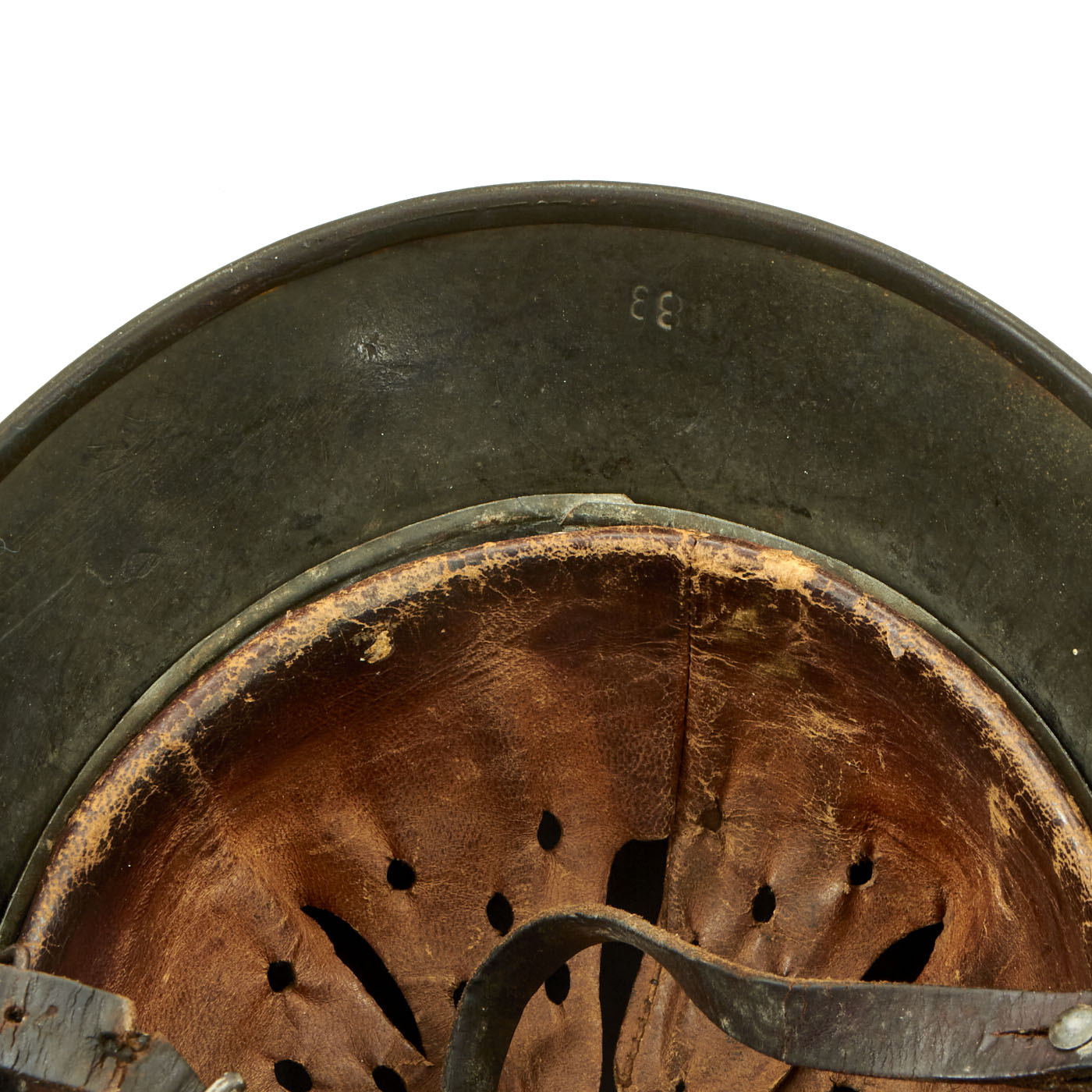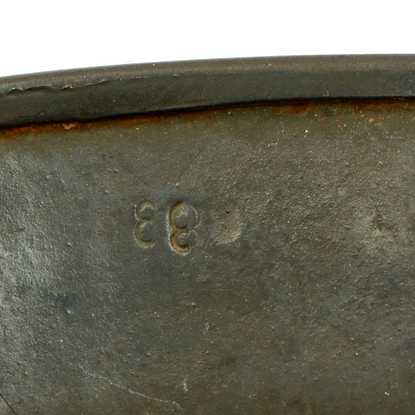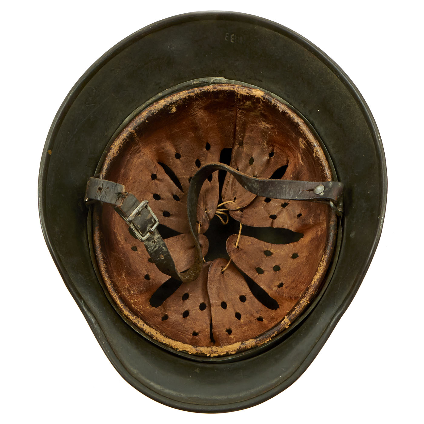 All three liner retaining pins are intact and retain the camouflage paint well, though they have gotten a bit loose over the years.. The interior of the helmet still has the original M31 leather liner with all eight of its fingers intact. The liner does show some flaking around the rim, as is often seen, and has darkened around the edge due to sweat and oil. The original top tie looks to have been replaced at some point. The mid war galvanized steel liner is marked on the left outer side with 62 nA / 54, indicating that the liner is a size 54, intended for a 62 shell. The right side displays the full manufacture information, as well as a date: