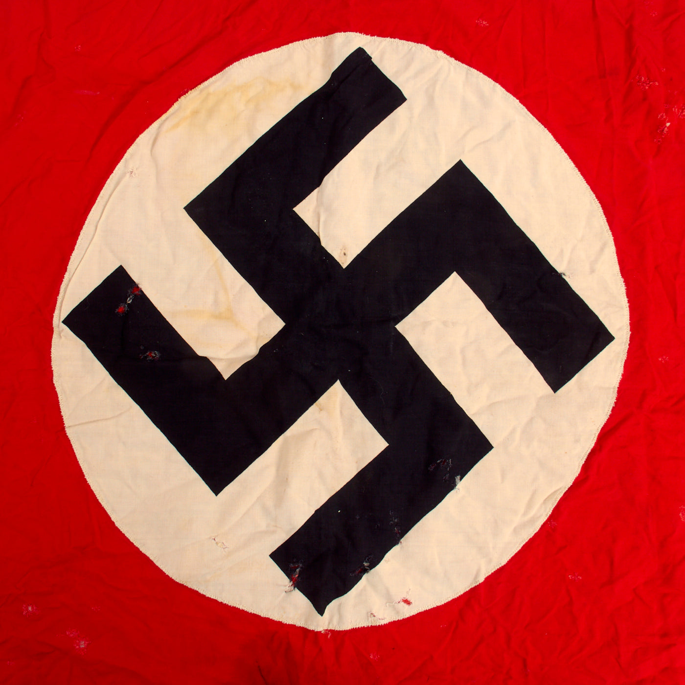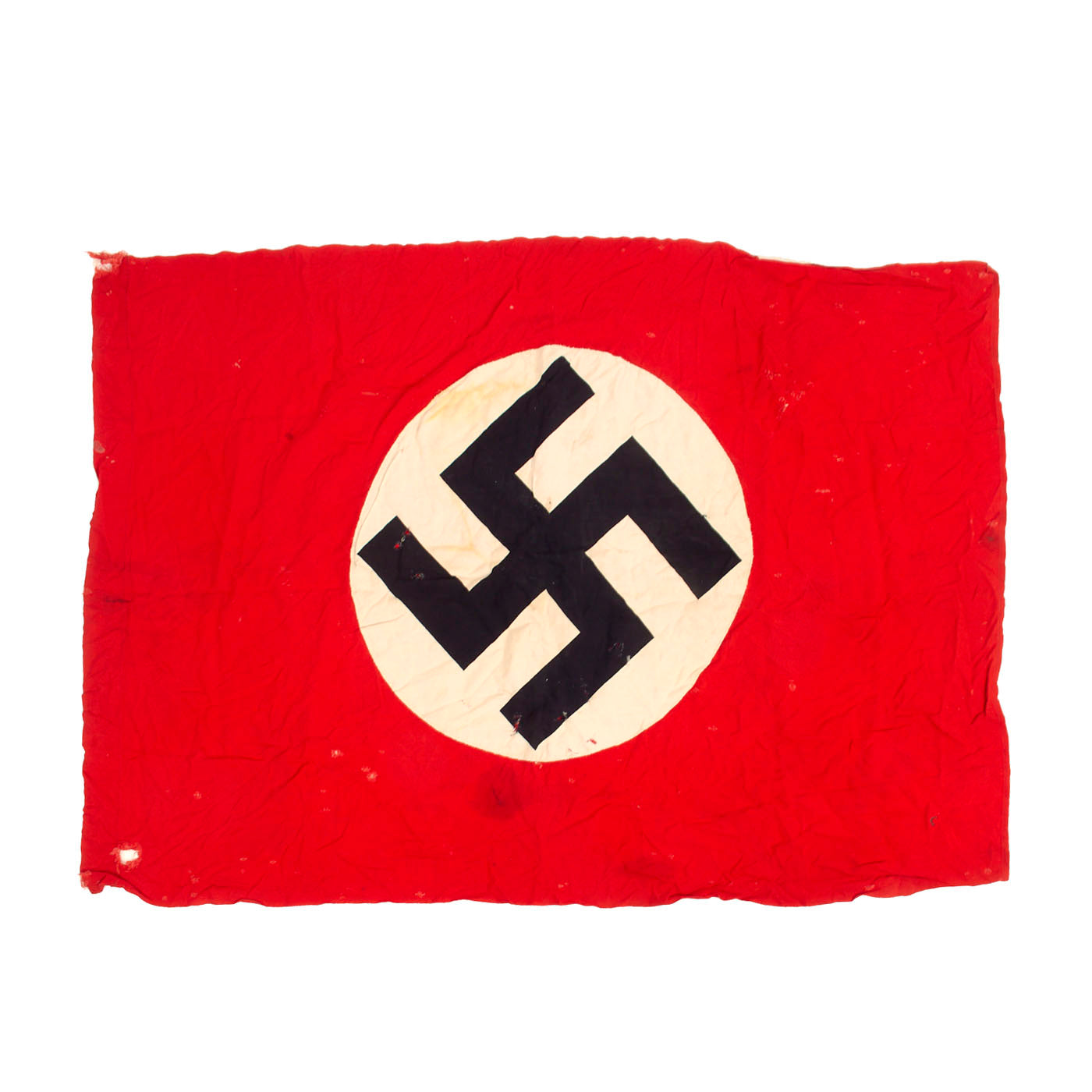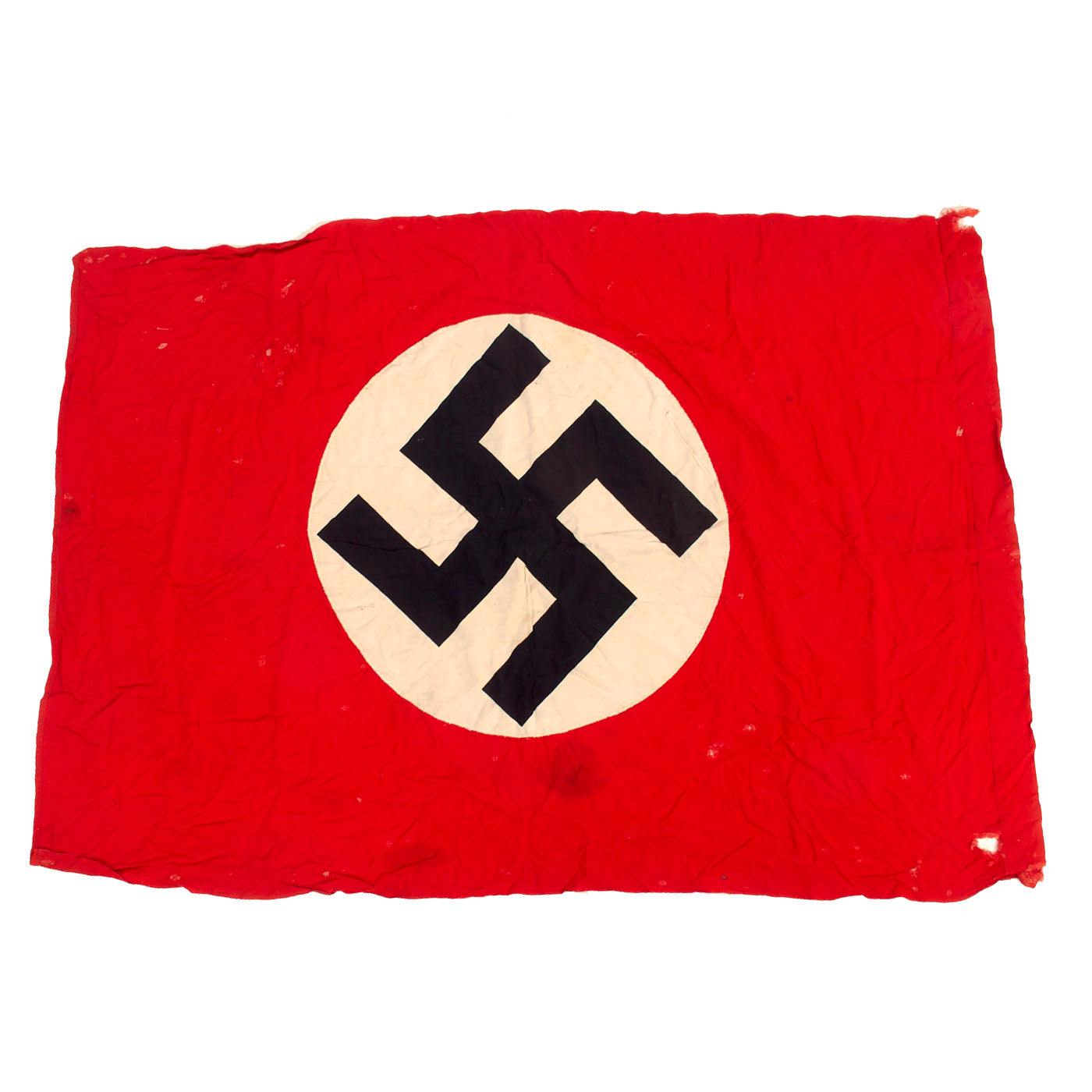 Original Item: Only One Available. This is a very nice WWII German National Socialist Political Flag or possibly banner (Nationalflagge/Parteiflagge 1933-45), which measures a very displayable 29" x 42". These could be hung vertically or horizontally, and were displayed on buildings, on podiums during speeches, or sometimes even hung up at camps. It looks to be of all cotton construction with a two piece red field, and is double sided, with a single piece cotton white circle with a sewn on black Swas (Hook Cross) on each side.
