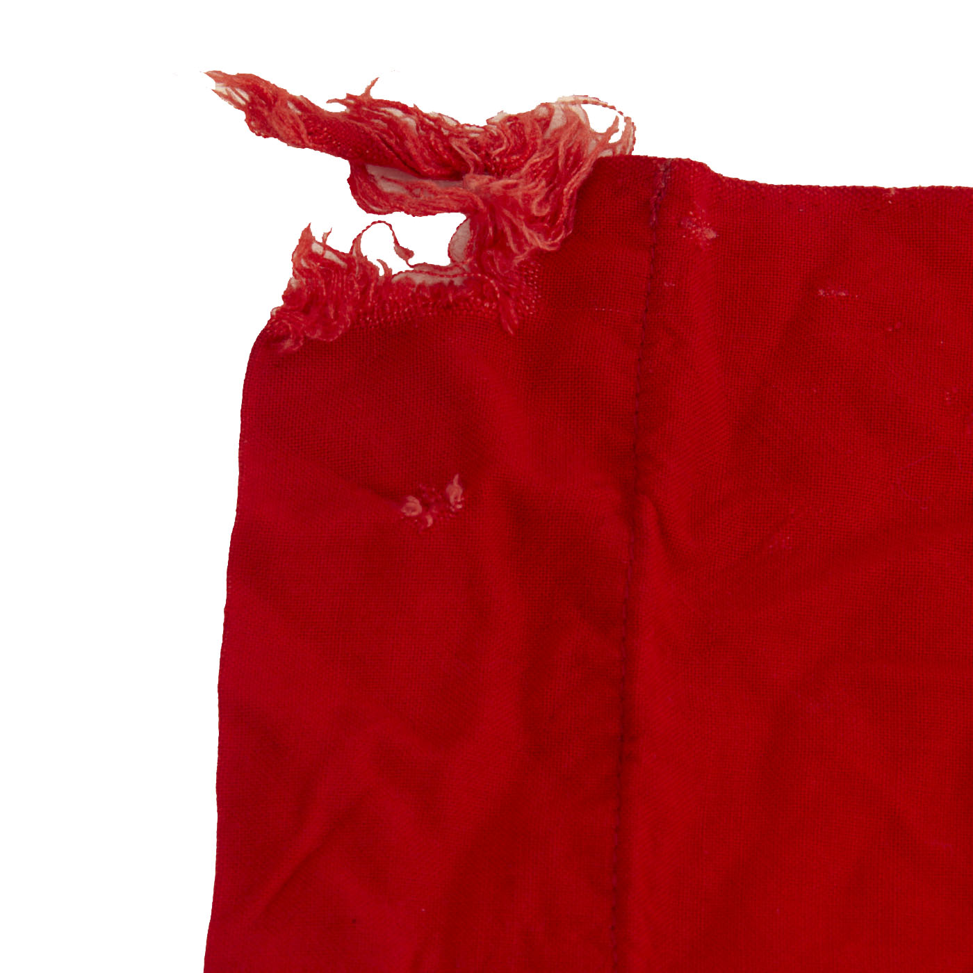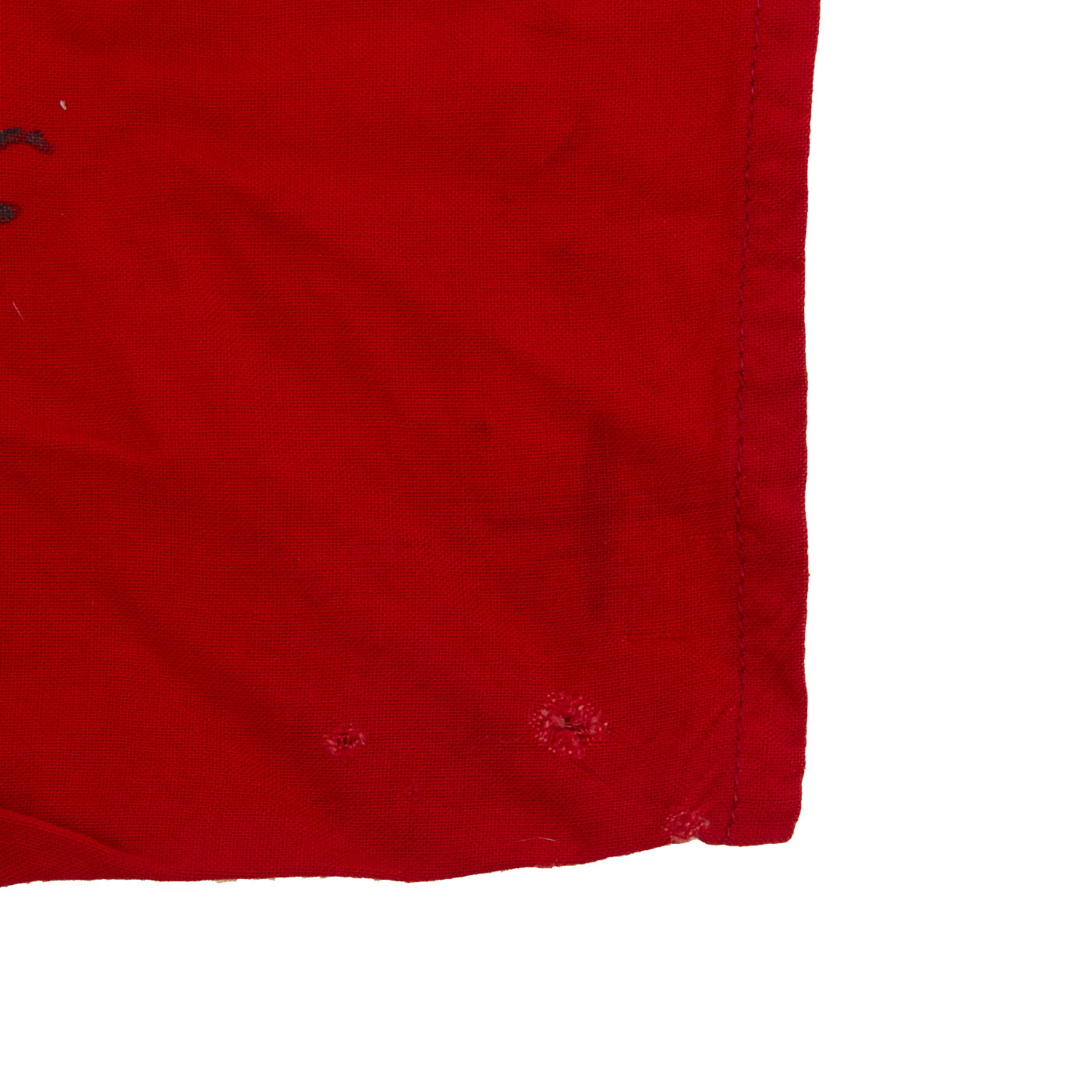 One of the narrow sides has a hemmed sleeve for a pole, and this flag is in very good condition, though it definitely does show wear from service. There are some small holes and pulling on the red field, and the central white circles show stains in addition to some small holes. There are also tears on both ends of the hanging sleeve. We often get these looking like they had spent the war folded in a drawer, but not this example!