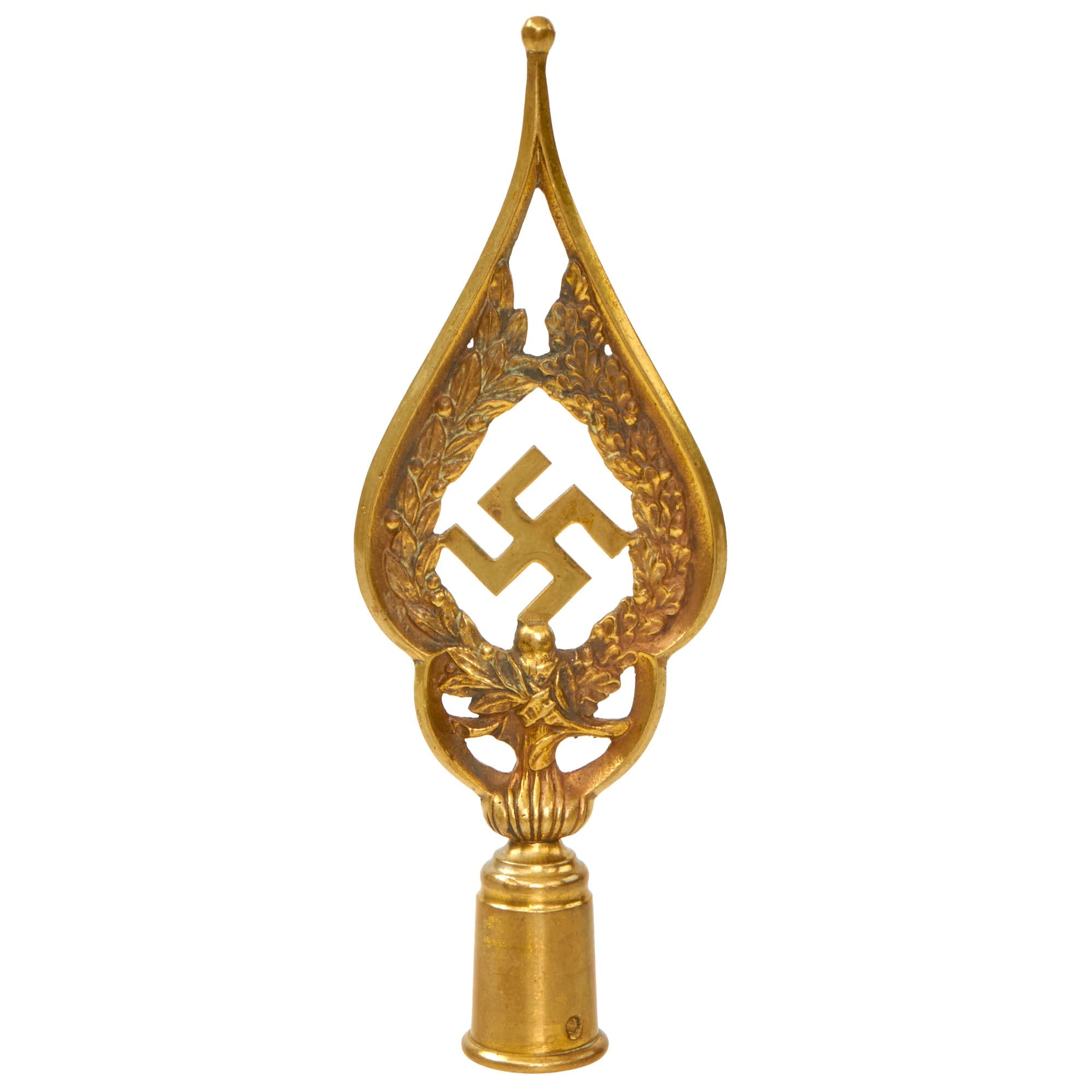 The finial measures 10 ¼” long, and 3 ⅝” wide. The design is very iconic, with a half laurel leaf and half oak leaf wreath encompassing the central swas (hook cross), as seen on many German WWII medals. It includes the original pole top socket, which were often lost, as this design can be disassembled.