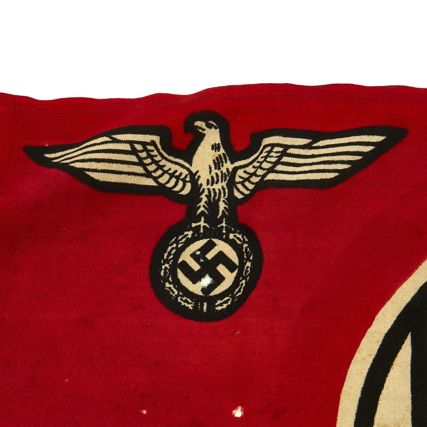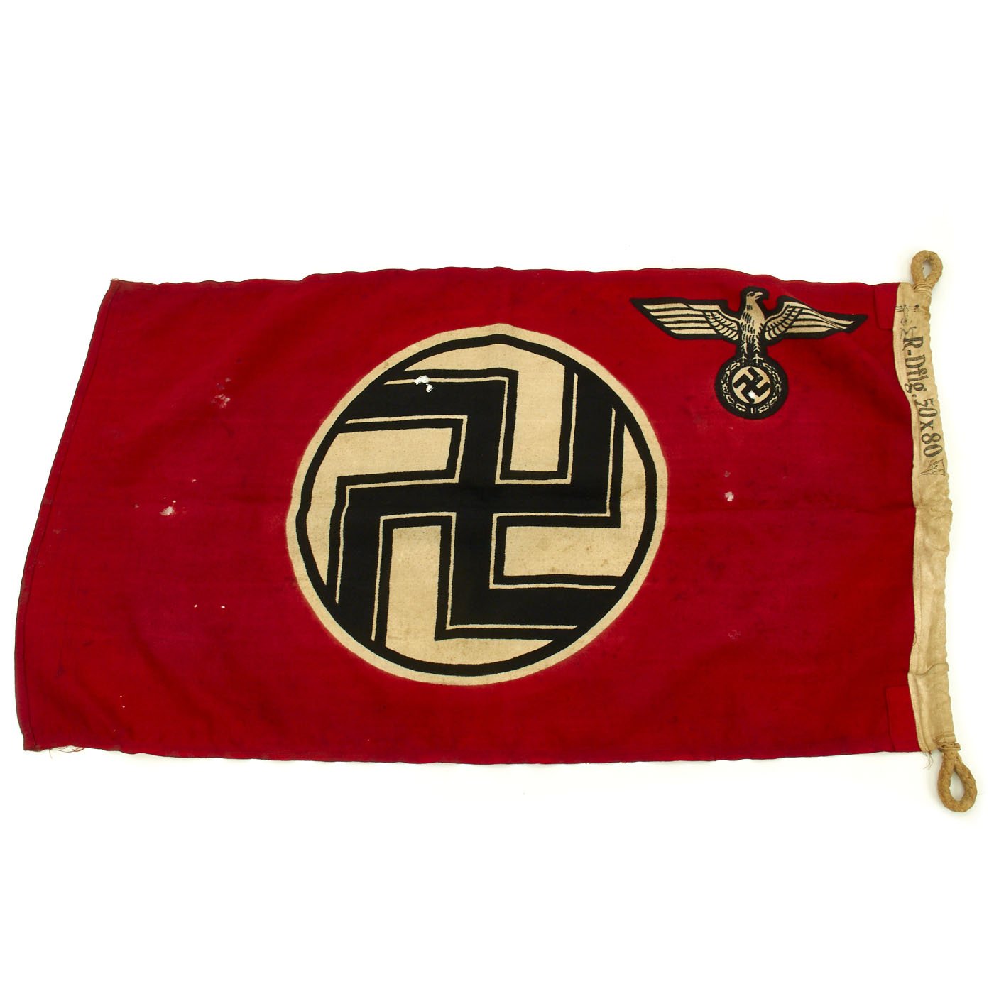 Original Item: Only One Available. This is an very good condition example of a WWII German NSDAP Reichsdienstflagge (State Service Flag). This small size example measures 50cm (19.7") x 80cm (31.5"), and is constructed of printed wool. It has an embellished Swas (swas) in the center of the field, with the German Reichsadler (National Eagle) in the upper left corner or canton. It has a thick halyard sewn into the header, with loops at either end.