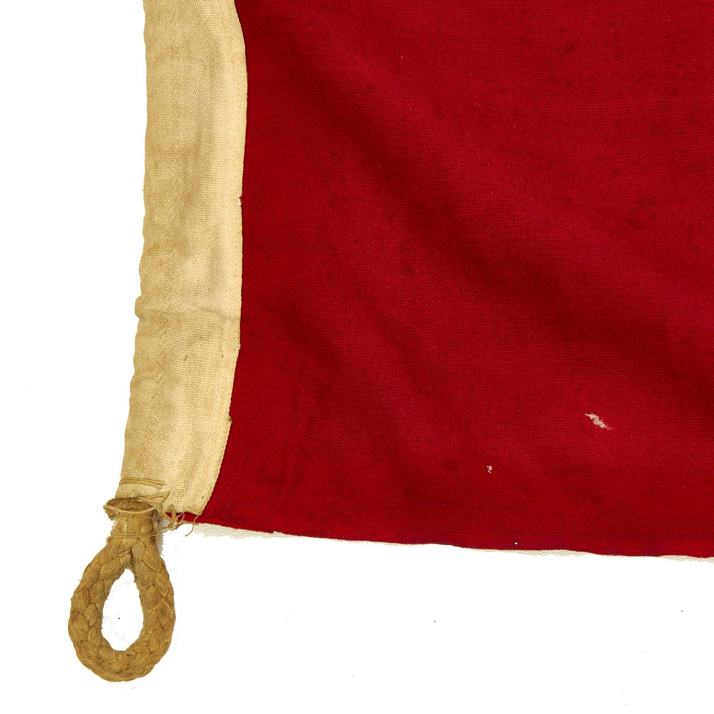 The header is marked with the Reichsadler / M proof, indicating that it was issued to the German Kriegsmarine Navy. The flag may have been used for small launches when being used for negotiations and diplomacy. Next to this it is marked R-Dflg. 50 x 80, indicating it is a 50 x 80 cm State Service flag. There is a W F / T in a Triangle maker mark next to this.