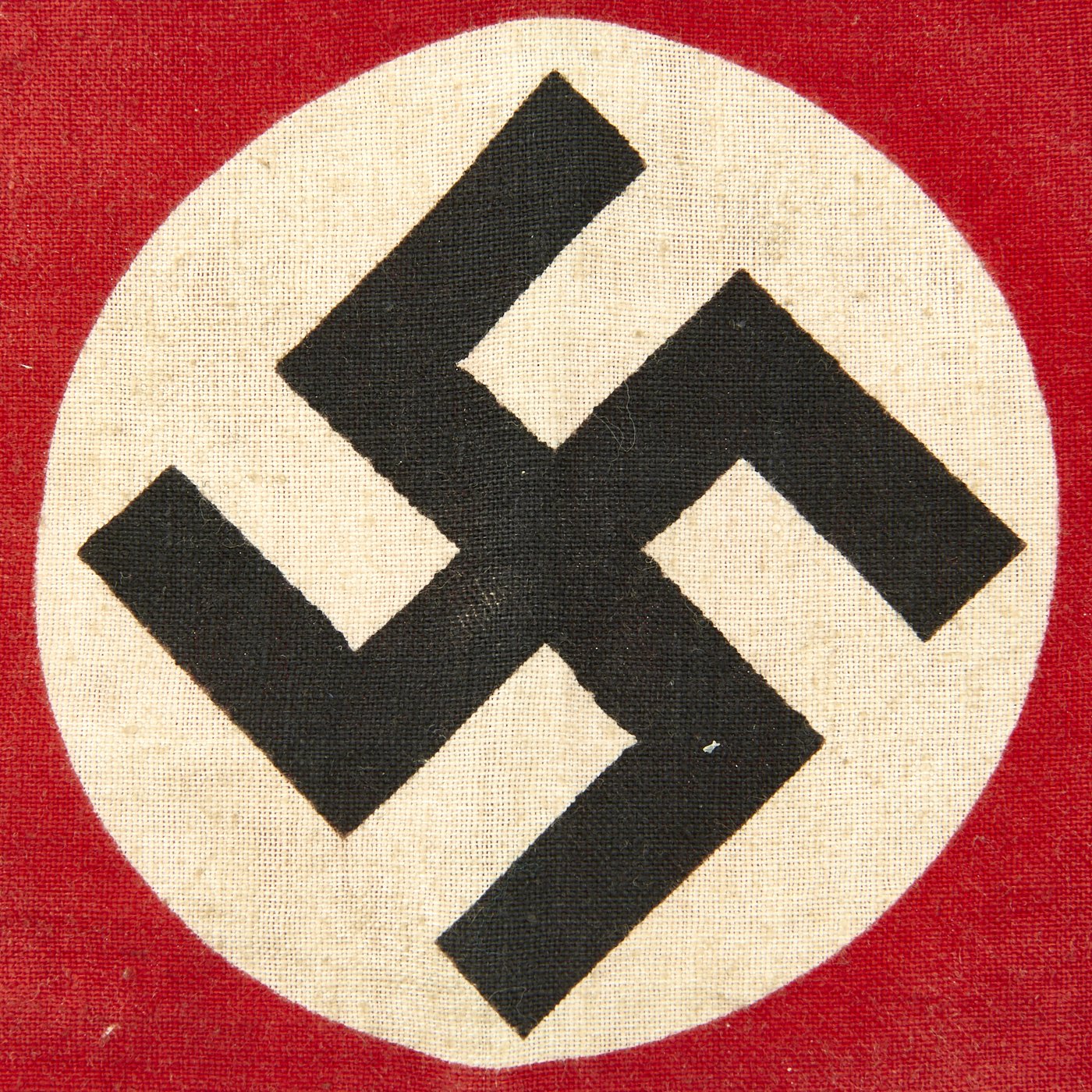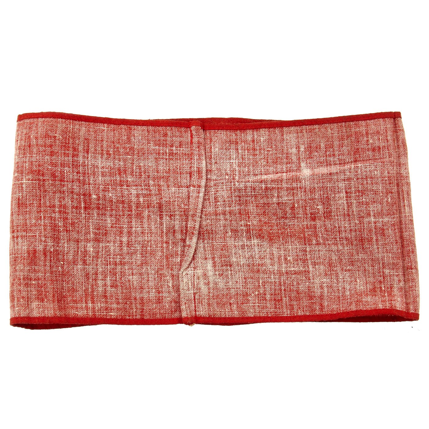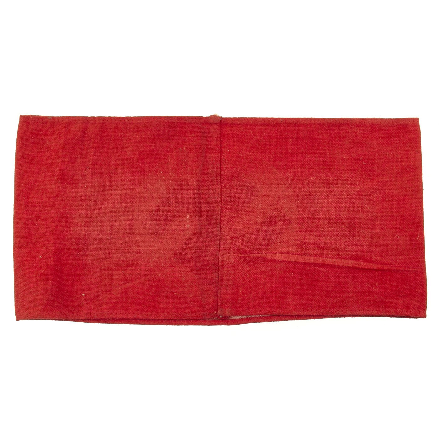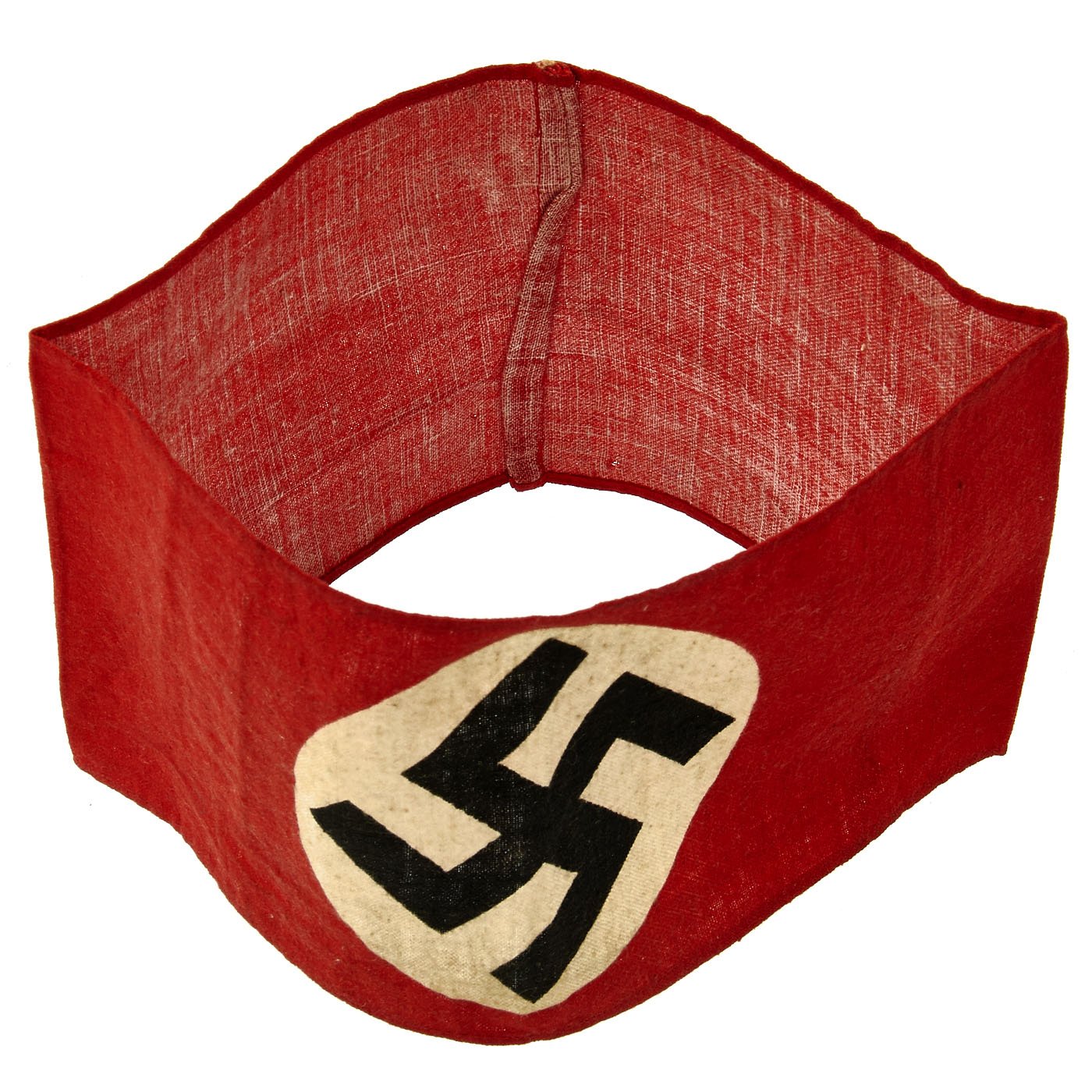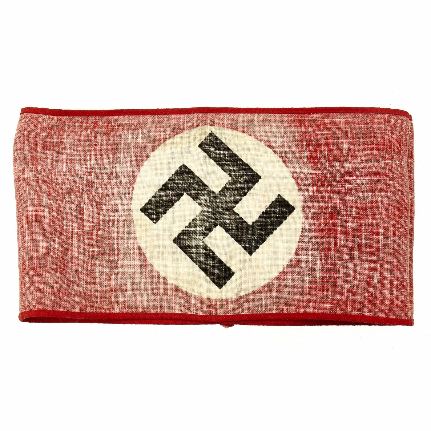 This standard armband was worn by members, and was also worn by many service members and other personnel during the war. It is in very good lightly used condition, and measures approximately 17" x 4 1/4", with the ends sewn together. It is of simple construction, with a red band and a circular white patch with a dyed Swas (Swas) stitched to the band.