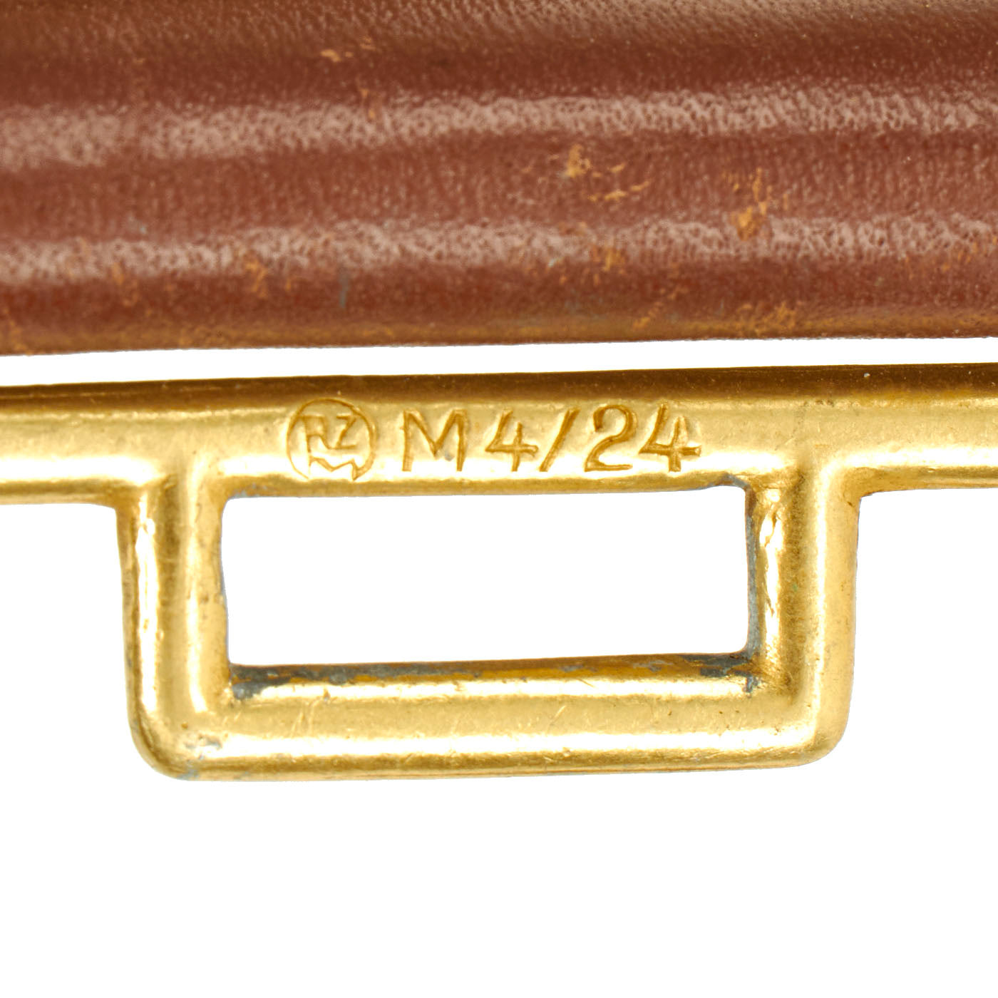 The back of the buckle is marked with an ((RZM)) circle and with the code M4 / 27. The Reichszeugmeisterei, or RZM, was was based at the Brown house in Munich and NSDAP party headquarters in Berlin. The RZM ensured that the manufacturers of military items were consistent in design, quality of materials and other characteristics of the items. It also defined standards of design, manufacturing and quality and published an authoritative color chart for textiles. The M4 in the code stands for buckles, and registrant 27 is Overhoff & Cie., of Lüdenscheid, a German city which had a large number of companies who made buckles, buttons, and other clothing items.