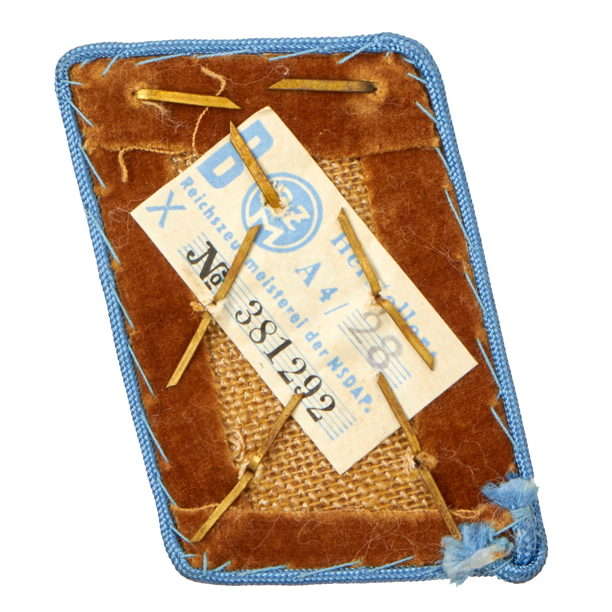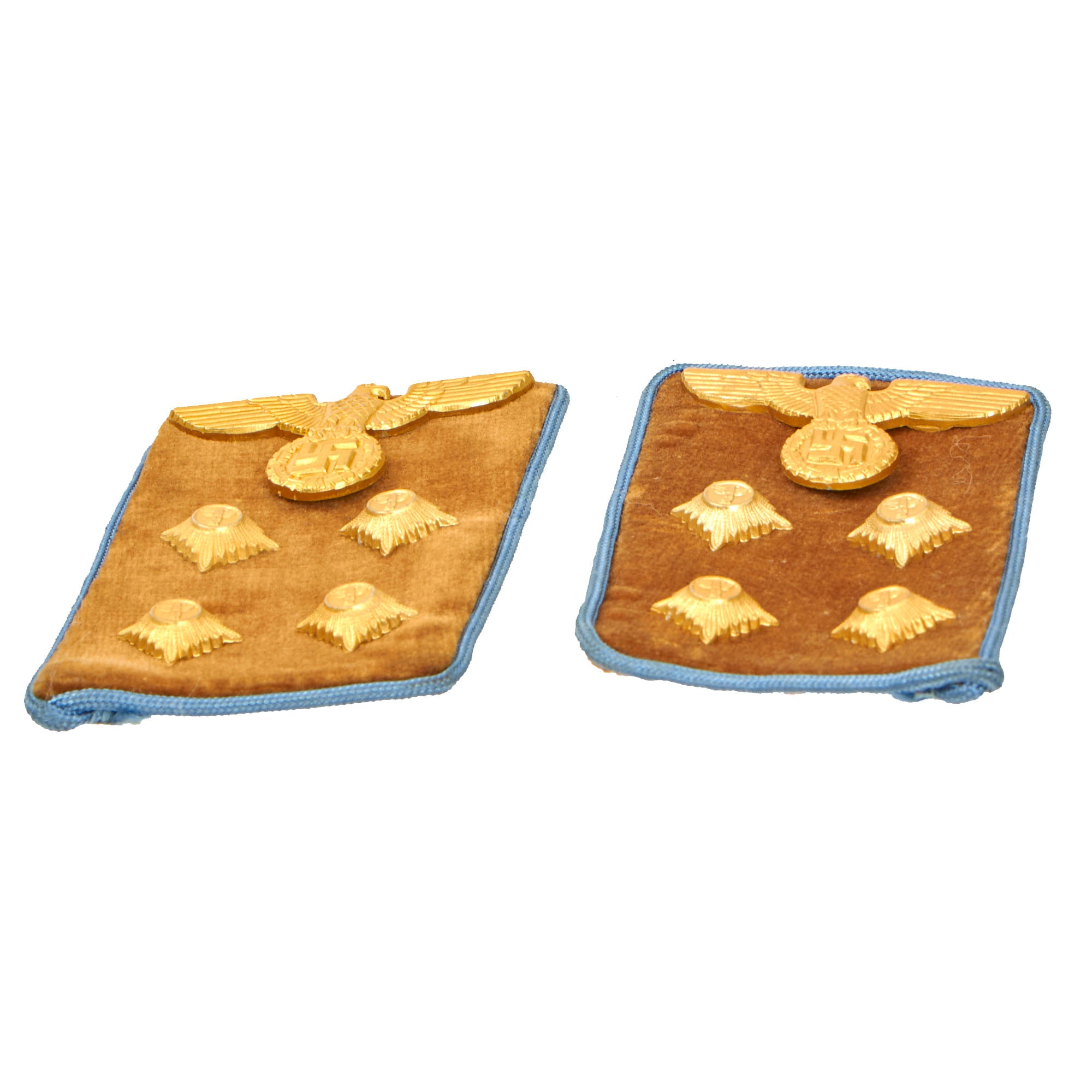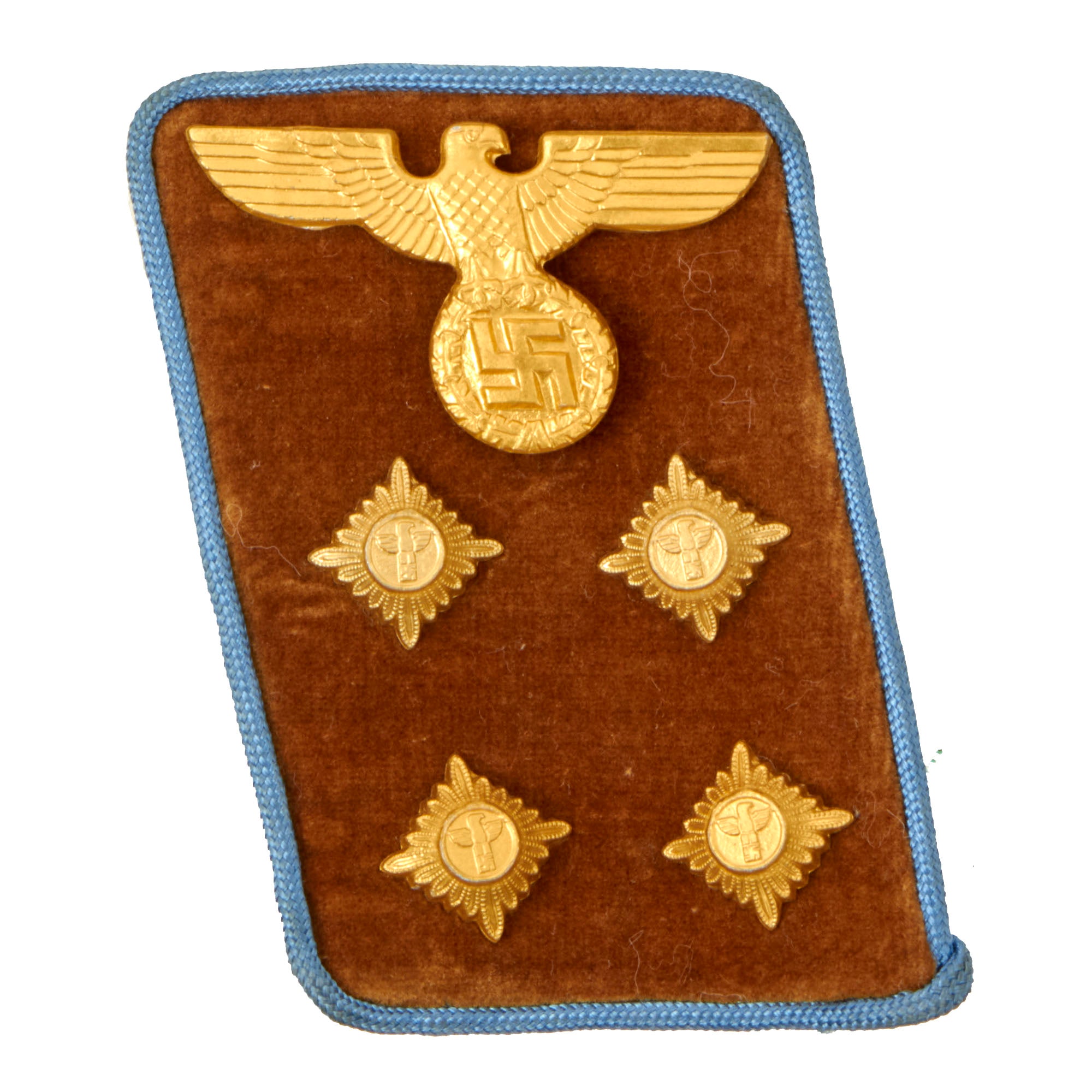 This is a fantastic matched pair (left and right) of 1939-1945 Pattern Kragenspiegelen (Collar tabs), often called "Gorget Patches". These have the correct lacquered buckram internal stiffeners, with the front covered in dark gold plush material. They are are piped in light blue for the Ortsleitung (Local Leadership), with a gold Reichsadler eagle at the top over four gold rank "pips", indicating the rank of Gemeinschaftsleiter, or Community Leader. This was a NSDAP Party political title which existed between the years of 1930 and 1945.