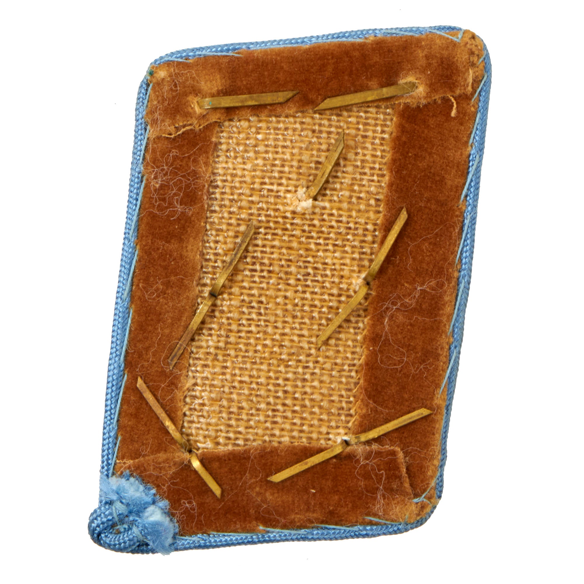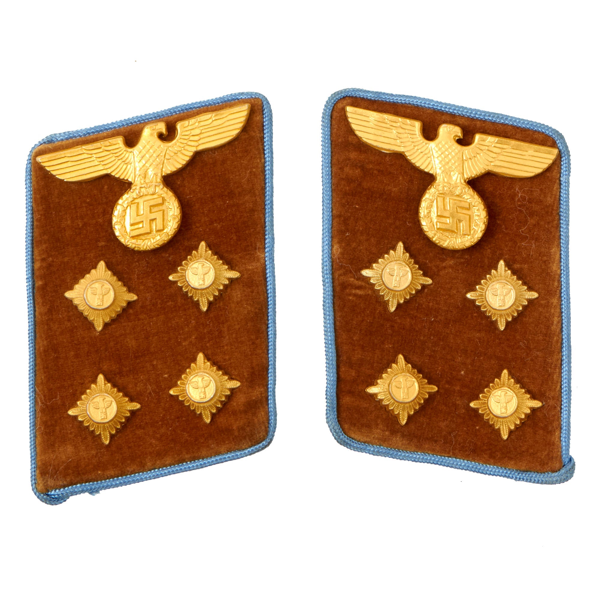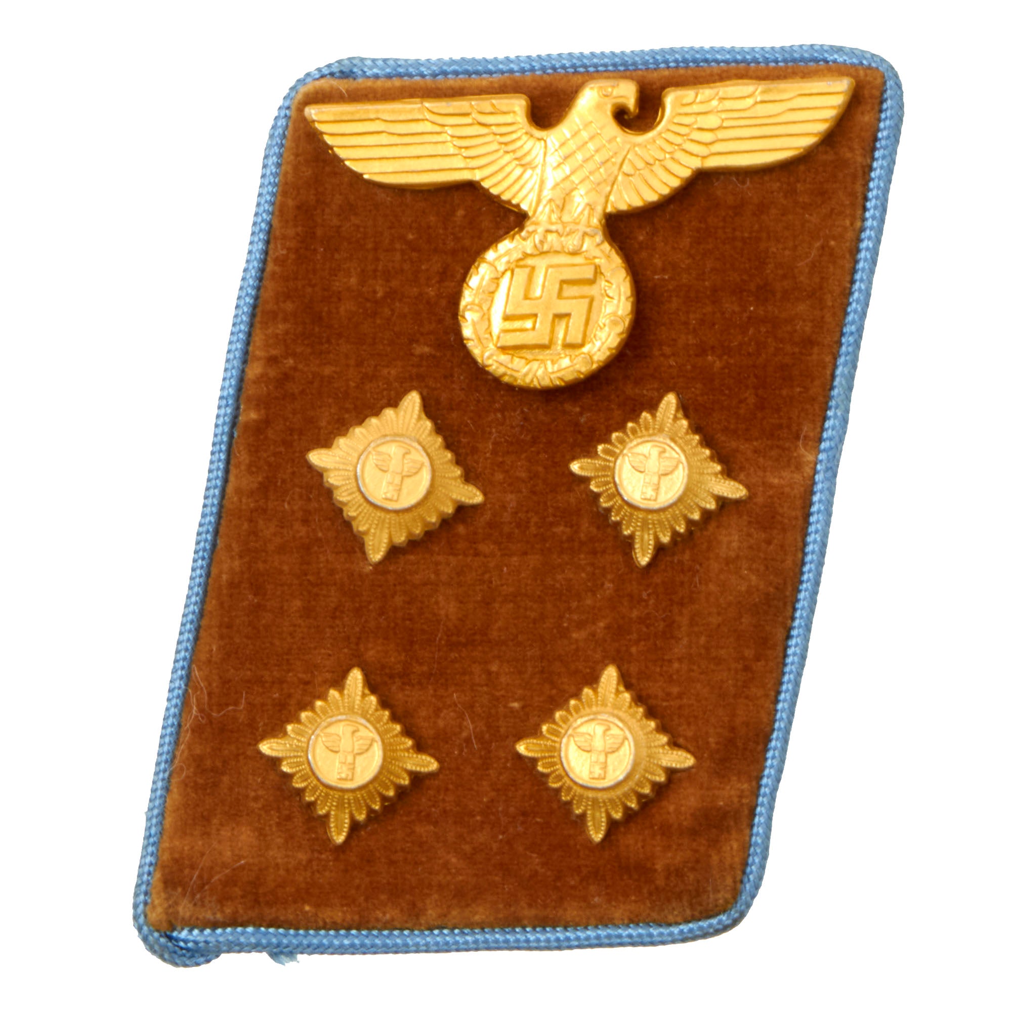 This is a fantastic matched pair (left and right) of 1939-1945 Pattern Kragenspiegelen (Collar tabs), often called "Gorget Patches". These have the correct lacquered buckram internal stiffeners, with the front covered in dark gold plush material. They are are piped in light blue for the Ortsleitung (Local Leadership), with a gold Reichsadler eagle at the top over four gold rank "pips", indicating the rank of Gemeinschaftsleiter, or Community Leader. This was a NSDAP Party political title which existed between the years of 1930 and 1945.