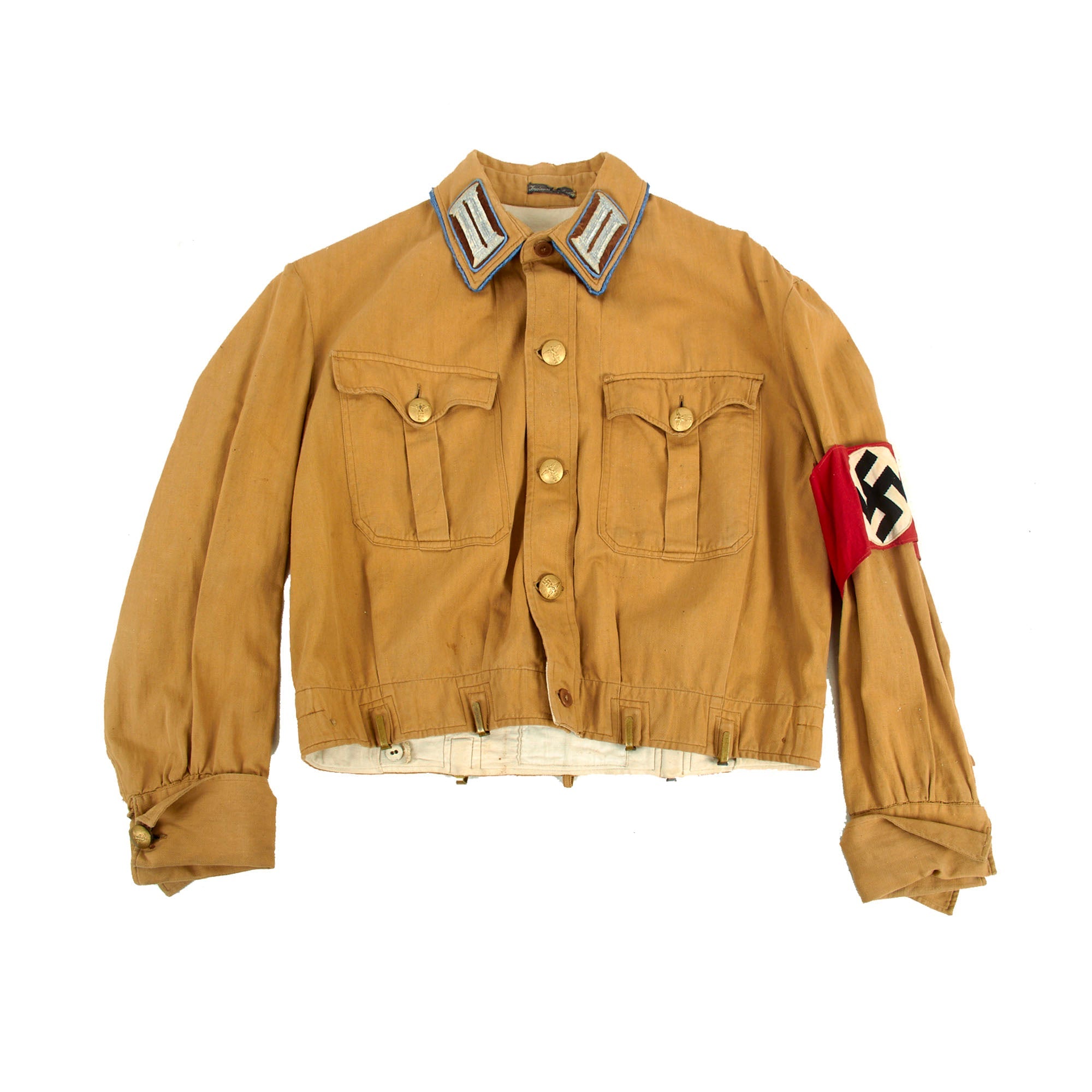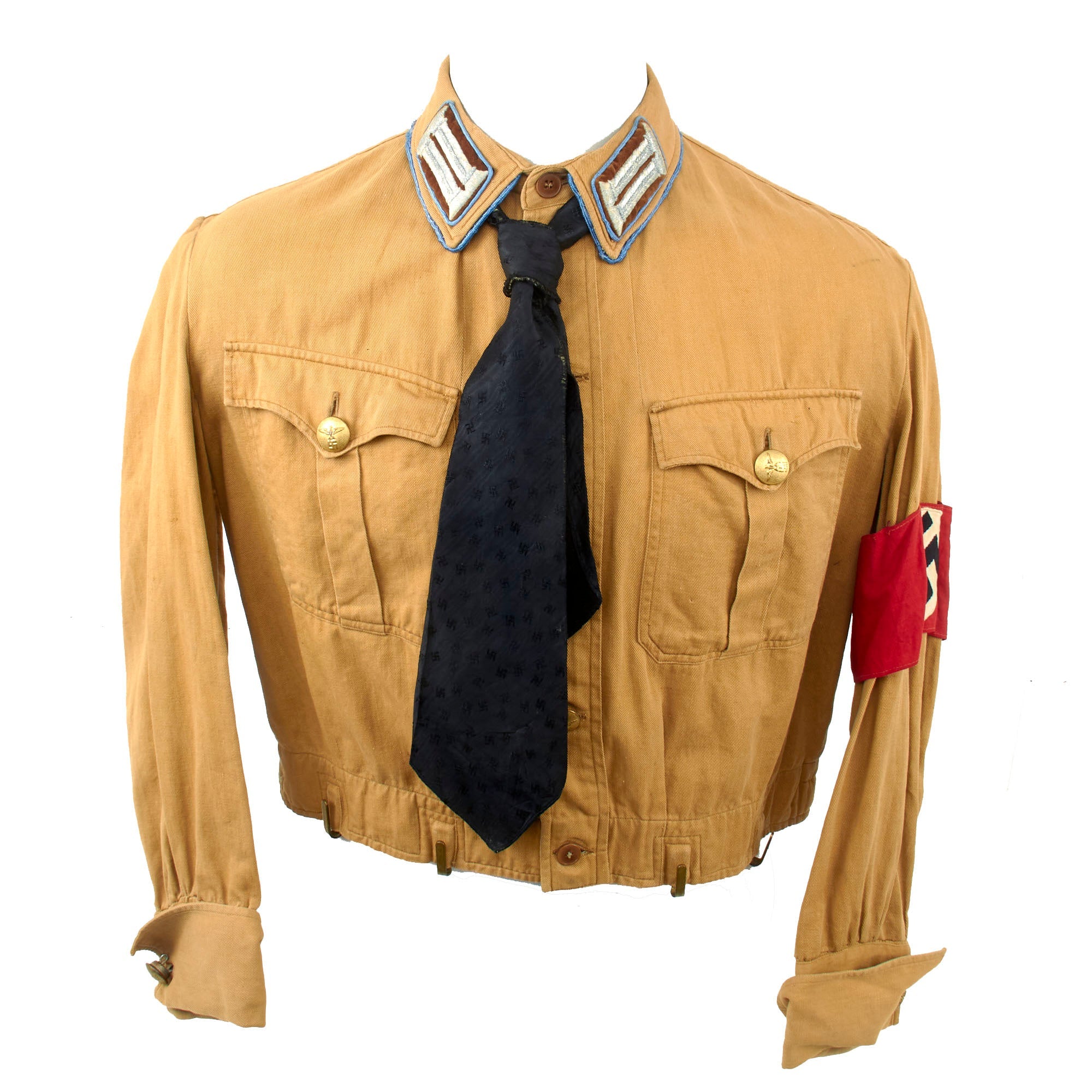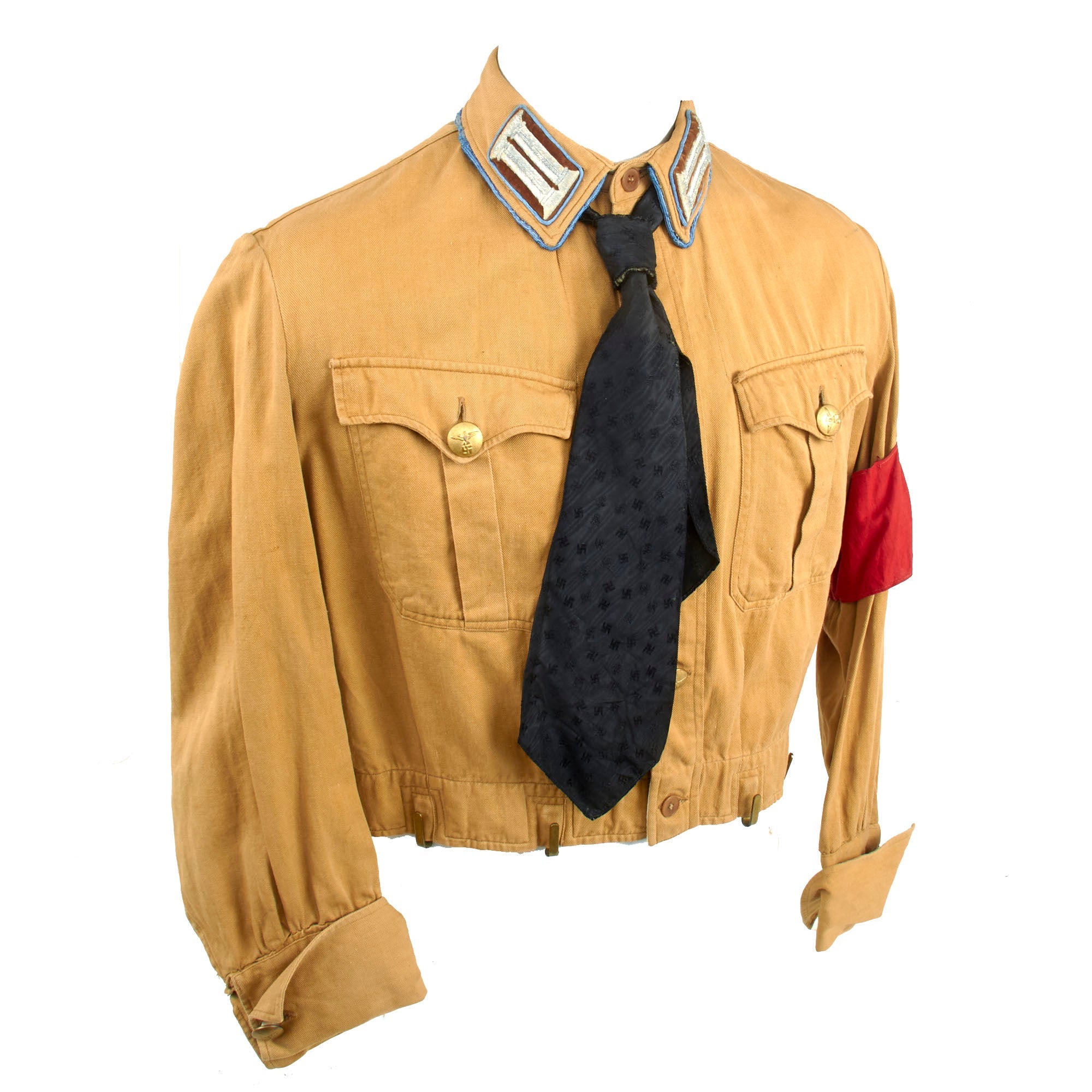 The shirt has all the correct insignia for the period, including a multi-piece NSDAP / SA armelbinde (armband) on the left sleeve, which is tack stitched in place with red thread. The collar is equipped with 1933-1939 Pattern Kragenspiegel (Collar Tabs), which have gold plush backgrounds with silver bullion hand embroidered "litzen" devices on them, indicating the NSDAP rank of Amtsleiter (Office Leader). The collar tabs are piped around the edges in blue, and there is also piping around the entire edge of the collar, indicating that the wearer was part of the Ortsleitung (Local Leadership) of the NSDAP.