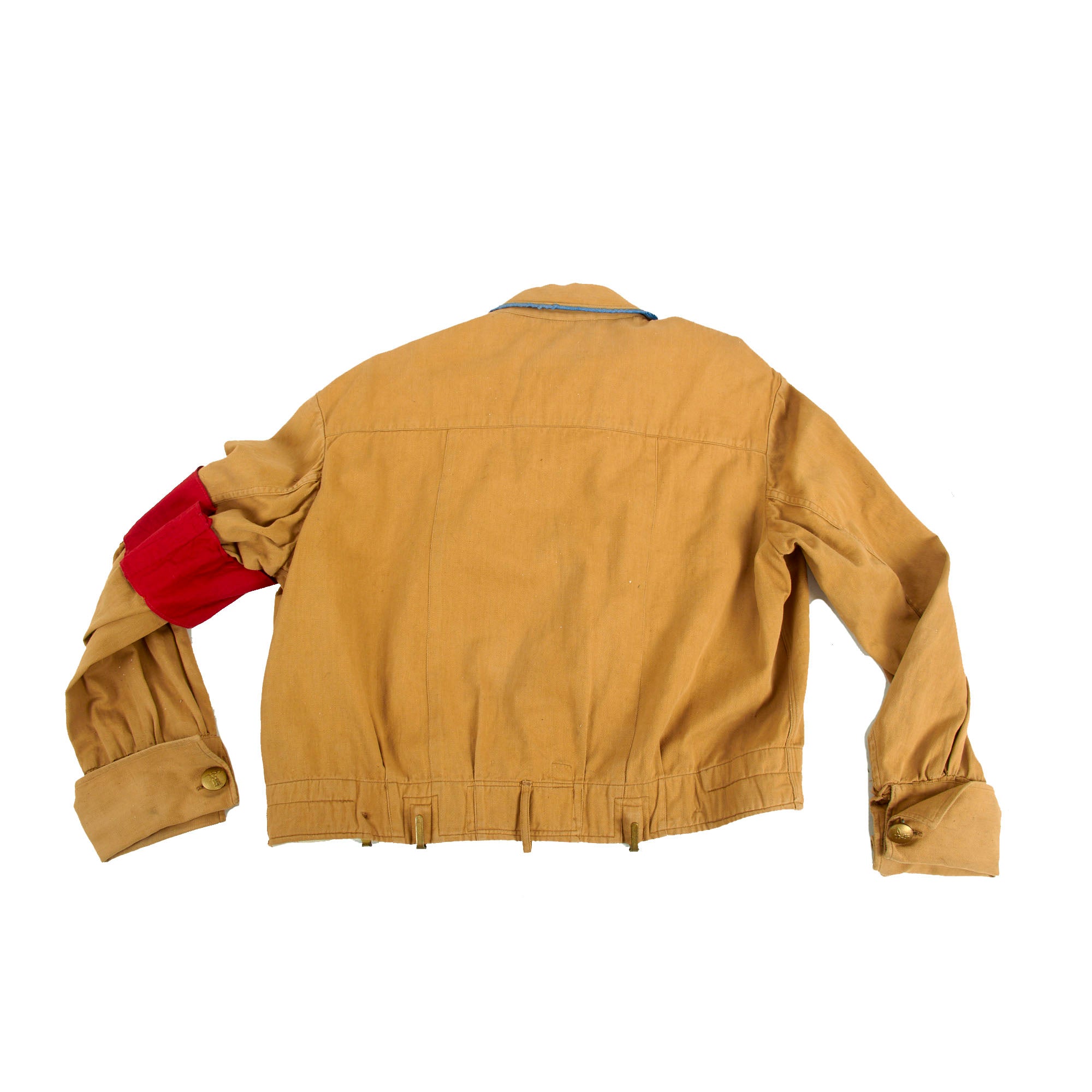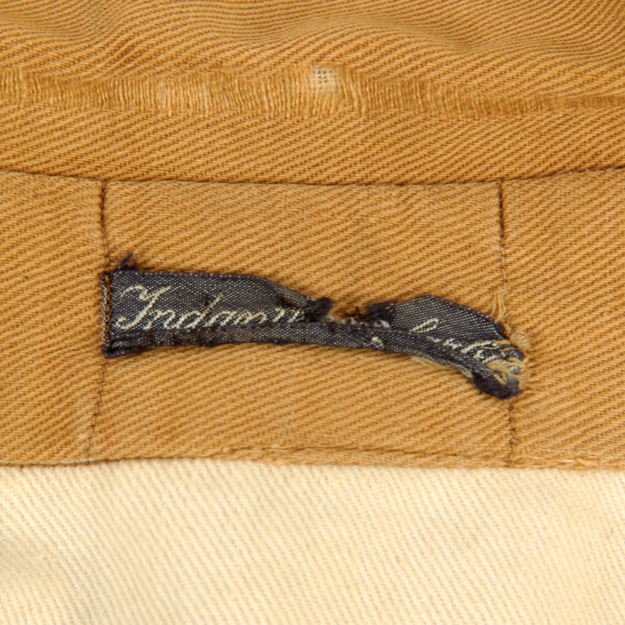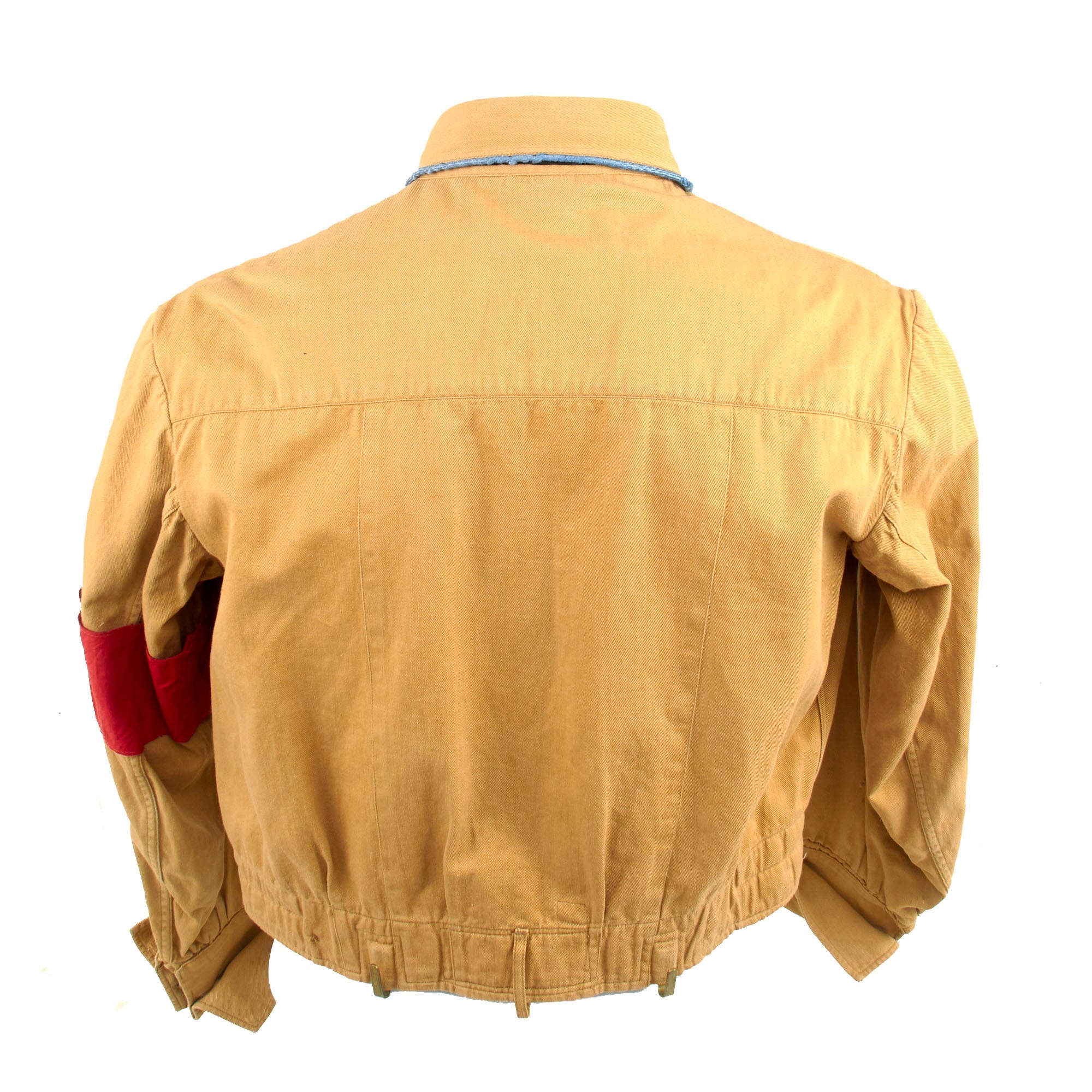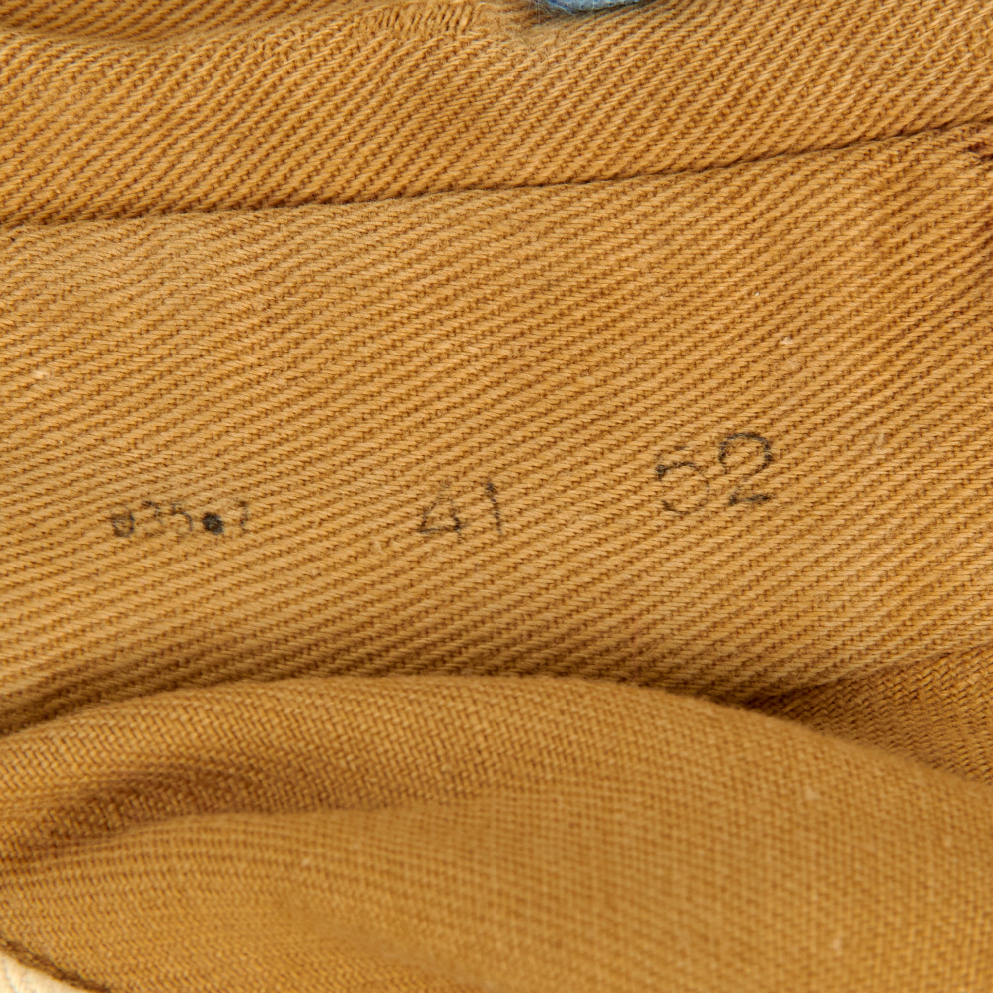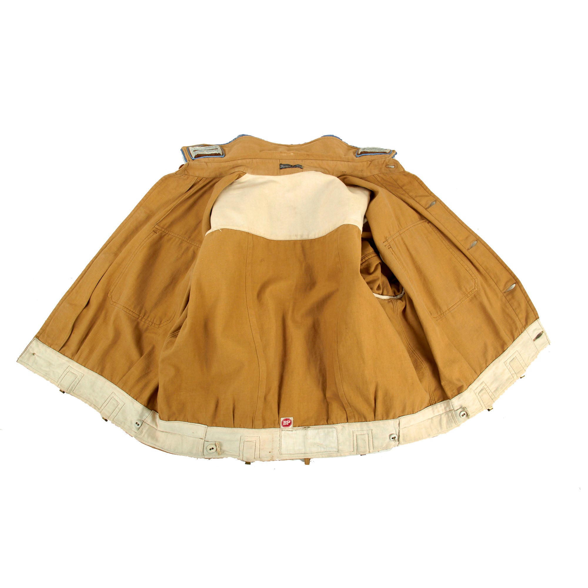 The tunic still has an original maker label in the collar, however it is torn and rolled up, so we cannot read it entirely. As best we can see it says Indanth ??? farbi ?. There is also a small circular red (BP) logo on the inside on the rear waist, and some small numbers stamped that look to be size markings. The tunic features a 5 button front closure, with three gold NSDAP Reichsadler buttons in the middle, and plastic waist and collar buttons. It has two pleated chest pockets with scalloped flaps, also retained by the same gold buttons, and the buttons are all retained by clips on the interior. The interior is unlined except for the rear shoulder area, which has some white cotton lining.