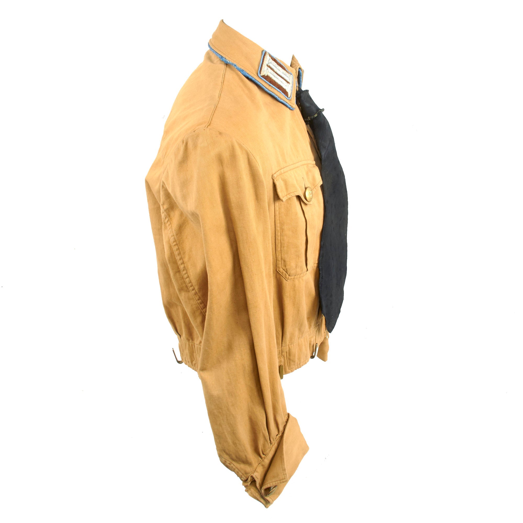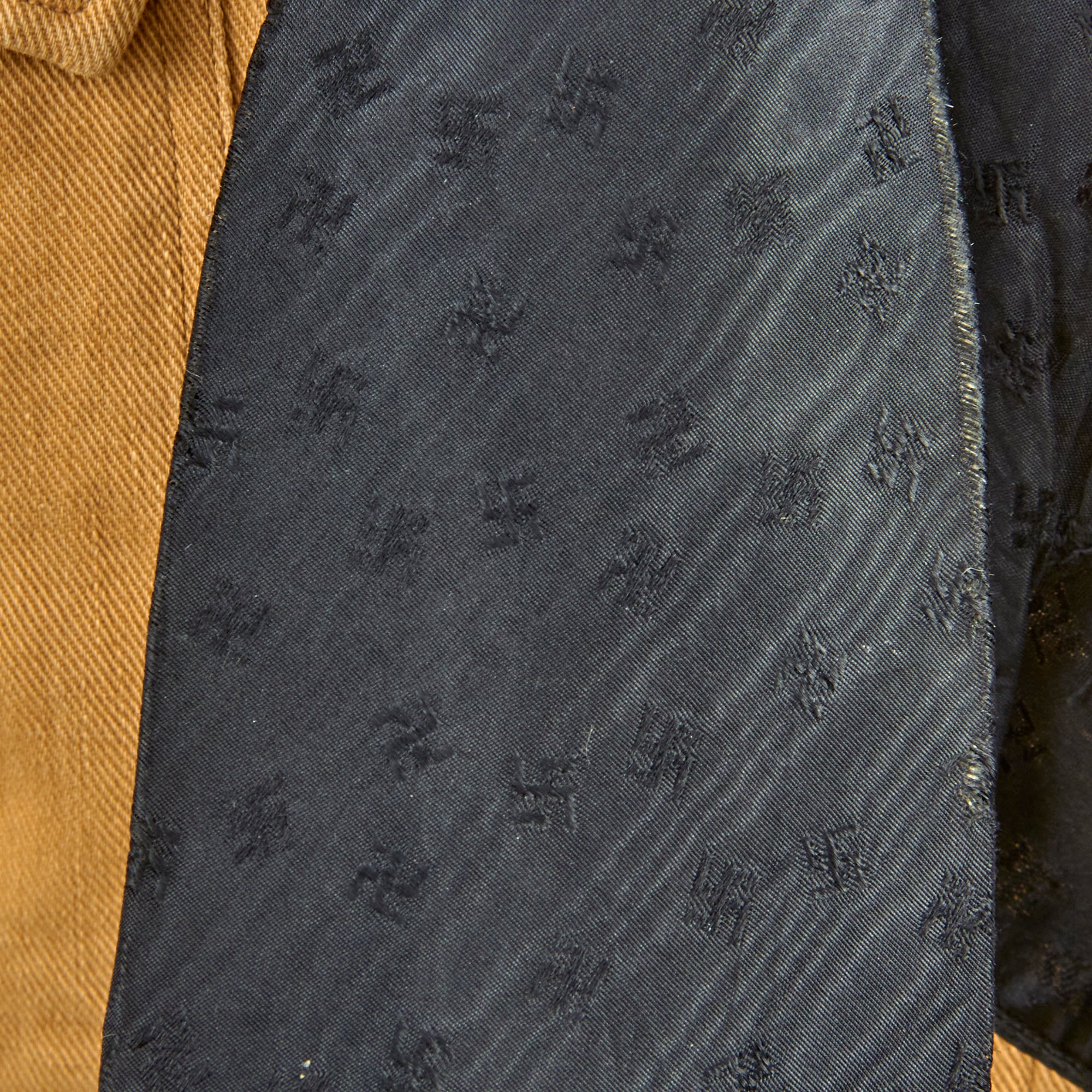 Overall condition is very good,, though it definitely saw long service during the NSDAP period. The insignia around the collar are all worn, and there is wear to the fabric on the inside of the collar. There are some light stains on the exterior, but no major tears or other damage. The black tie also shows a lot of wear around the edges.
