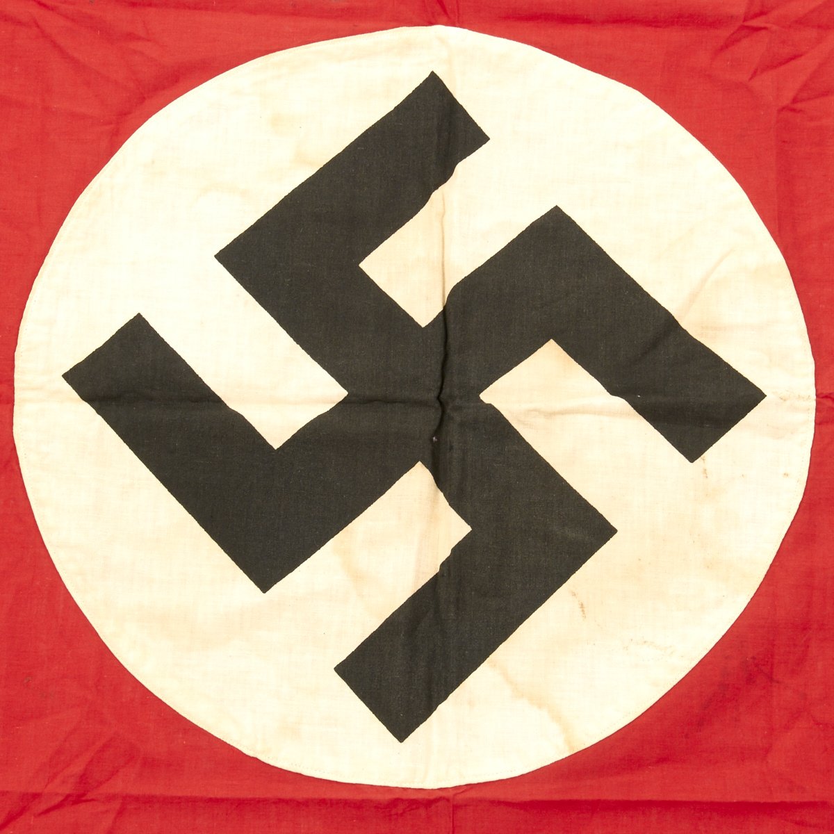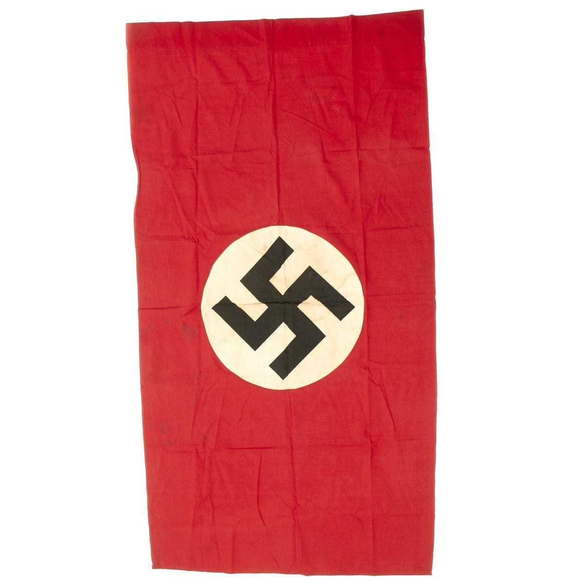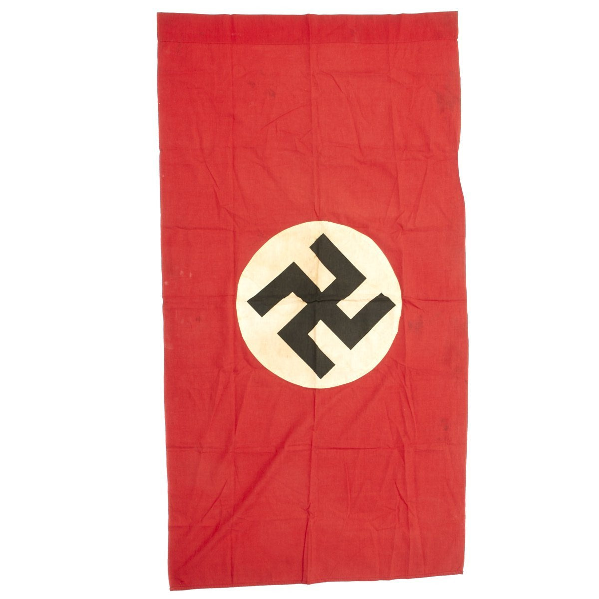 Original Item: Only One Available. This is a WWII German National Banner that measures 31 inches wide by 57 inches long. It is of all cotton construction, and is double sided with a single piece cotton white circles with black swass on both sides.