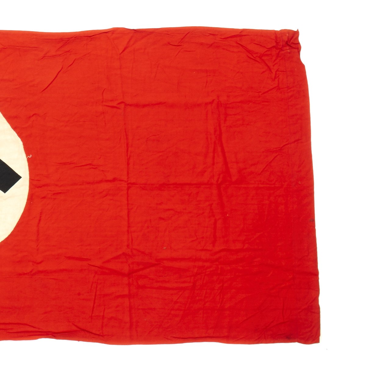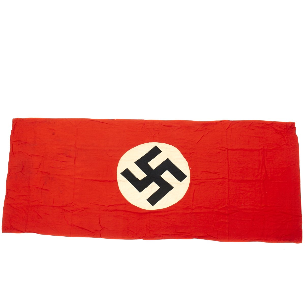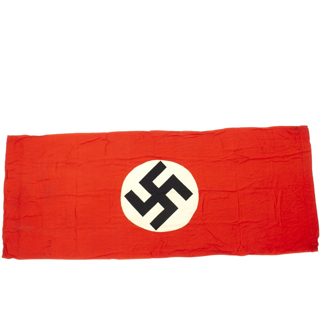 Original Item: Only One Available. This is a WWII German National Banner that measures 28 inches wide by 70 inches long. It is of all cotton construction, and is double sided with a single piece cotton white circles with black swass sewn onto both sides.