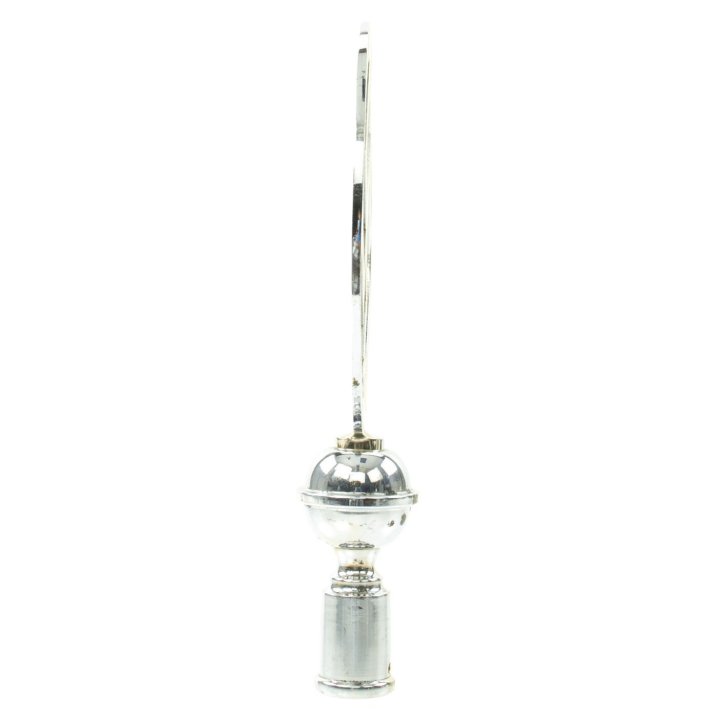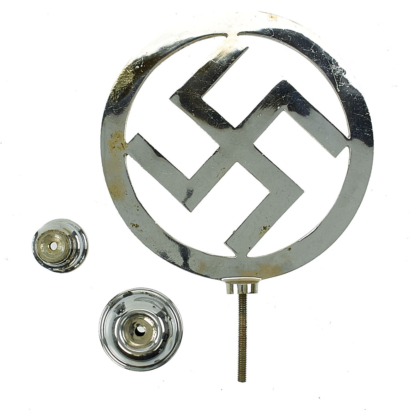 The design is the standard NSDAP mobile/canted Swas (swas) inside of a circle. It measures approximately 12 1/2 inches tall, and the top is 7 1/2 inches in diameter. There is some wear to the plating, and it has flaked off in places, showing the brass base metal. Overall it is in very good condition, with no deformation and just light scratches.