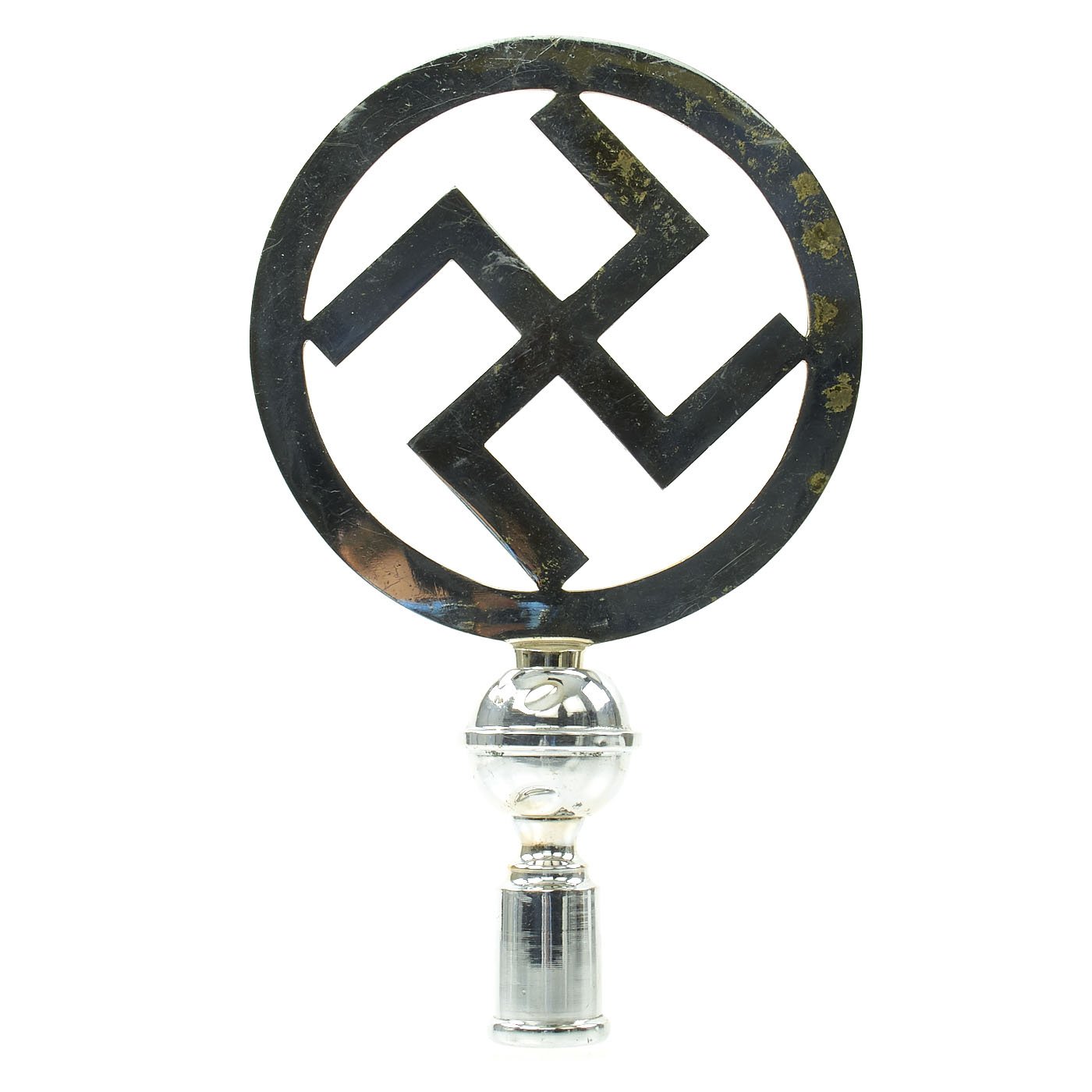 Original Item: Only One Available. This is a very nice WWII German National Socialist German Workers' Party (Nationalsozialistische Deutsche Arbeiterpartei - NSDAP) First Pattern Flag Pole Finial or Topper (Fahnenstange Endstück). It is constructed of nickel plated brass alloy, and is of multi-part construction. It includes the original pole top socket, which were often lost, as this design can be disassembled.