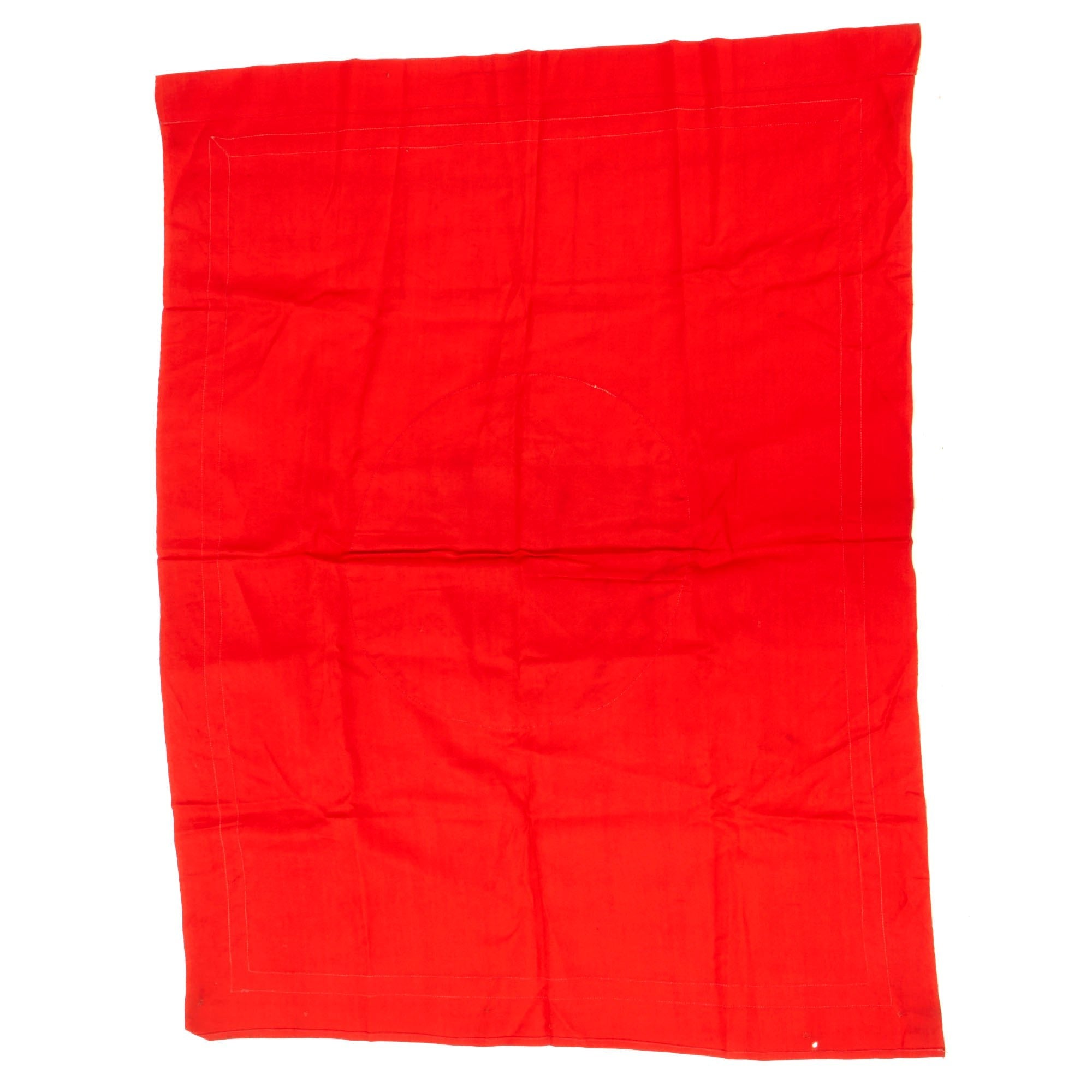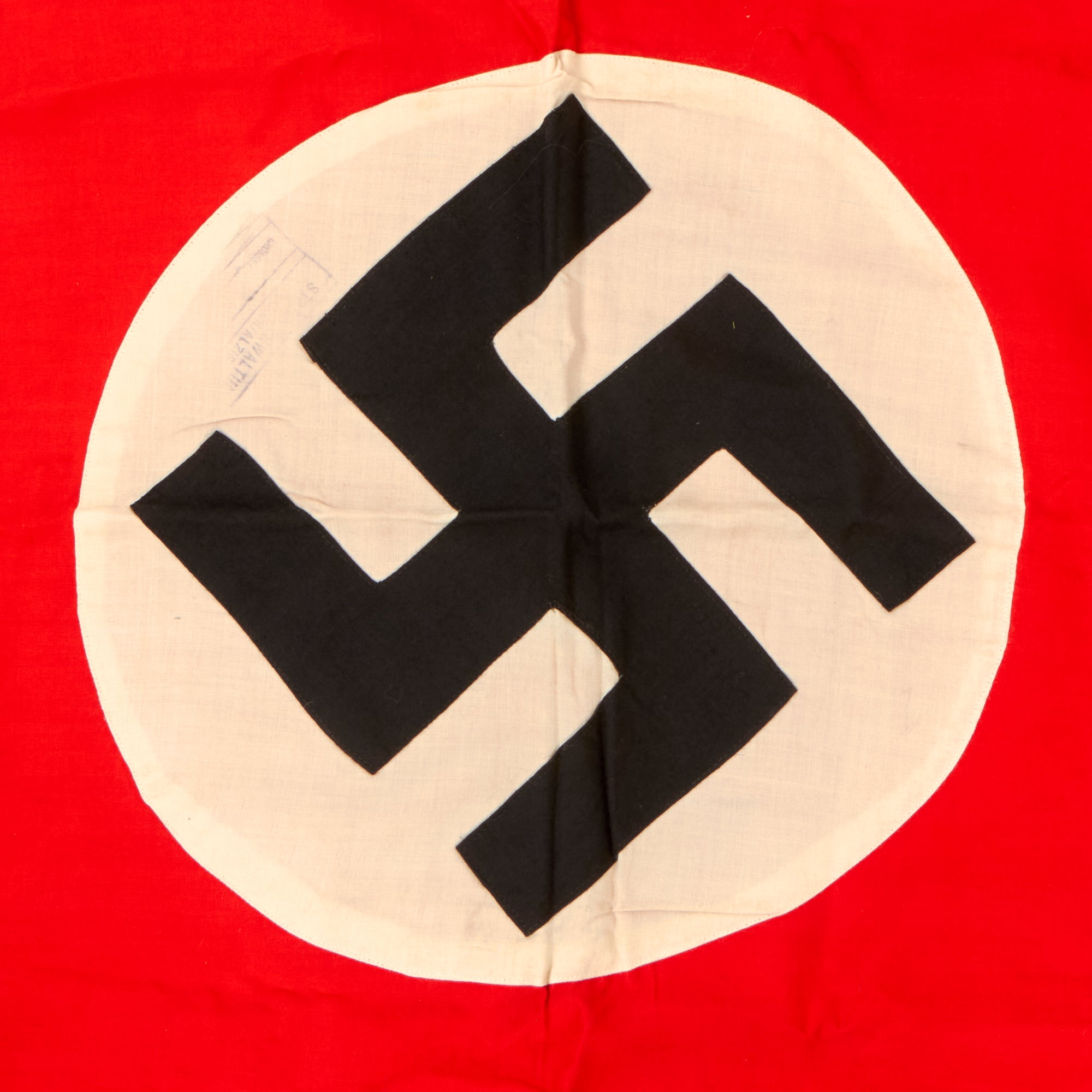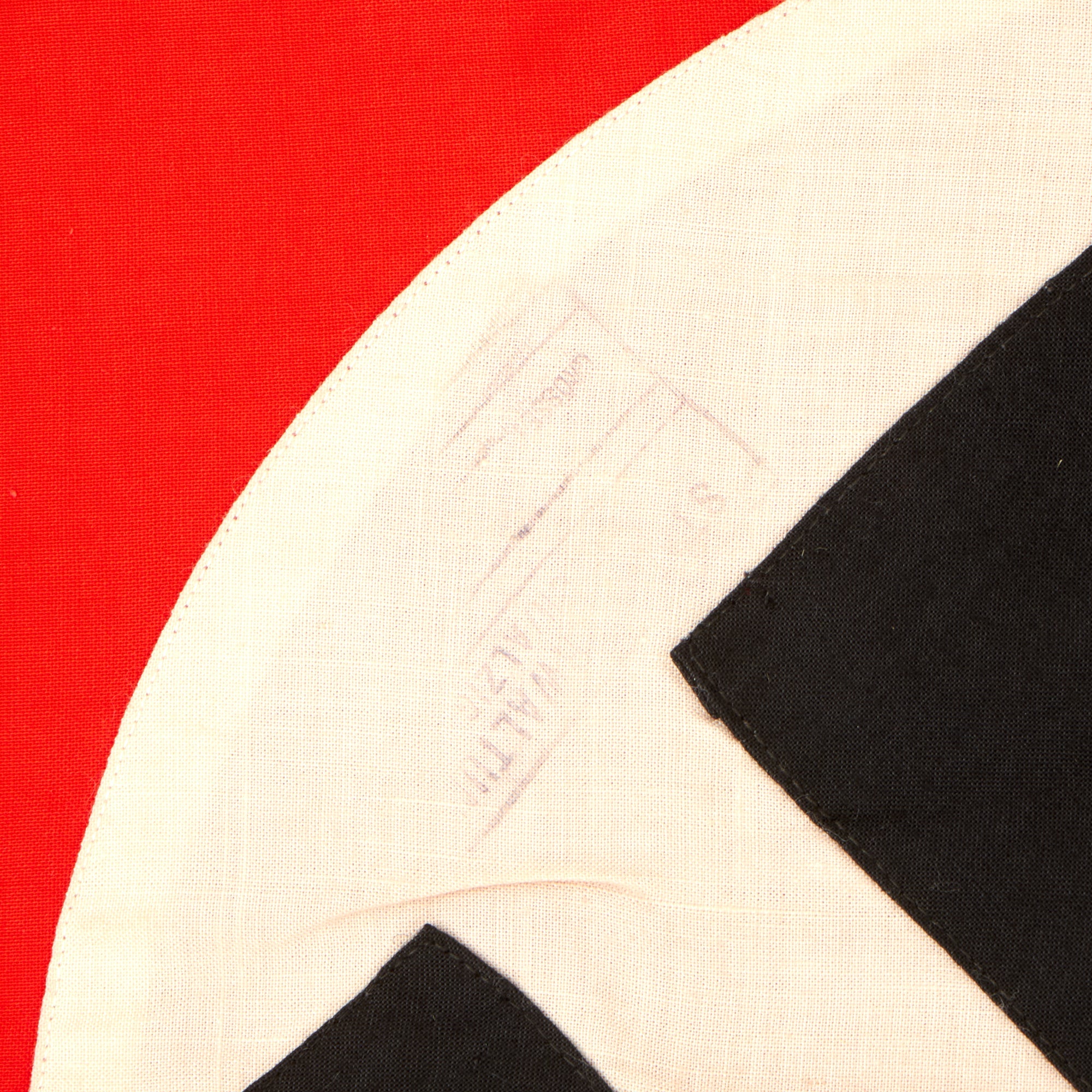 The banner is single sided and of multi-piece construction, with a black swas (hook cross) sewn on on a white canvas circle (one piece) stitched onto the red cotton background. Around this is a stitched on light canvas square white border, however unlike most we see, there is no white fringe on the bottom. It measures 39" x 31", and has a hemmed hanger sleeve at the top.