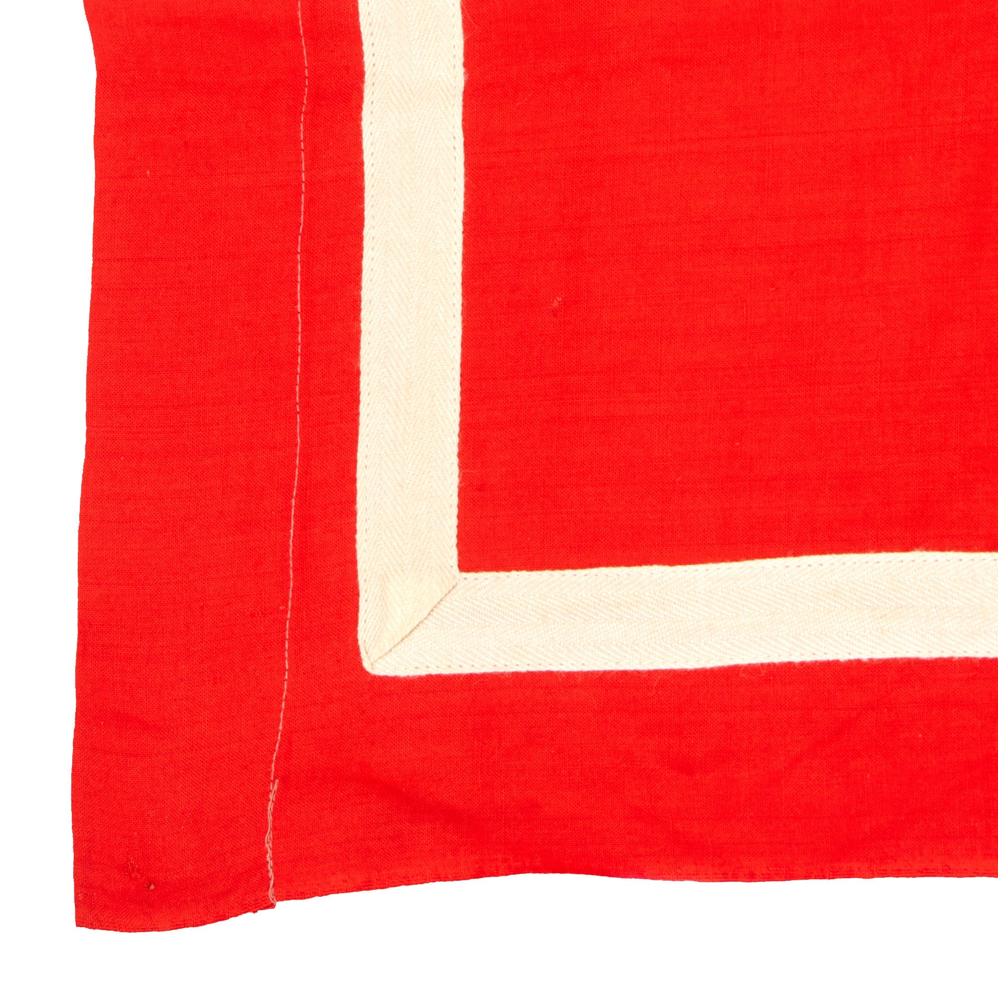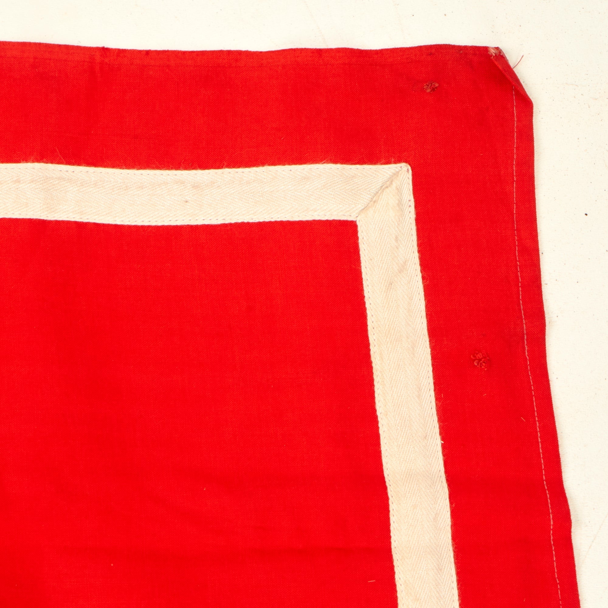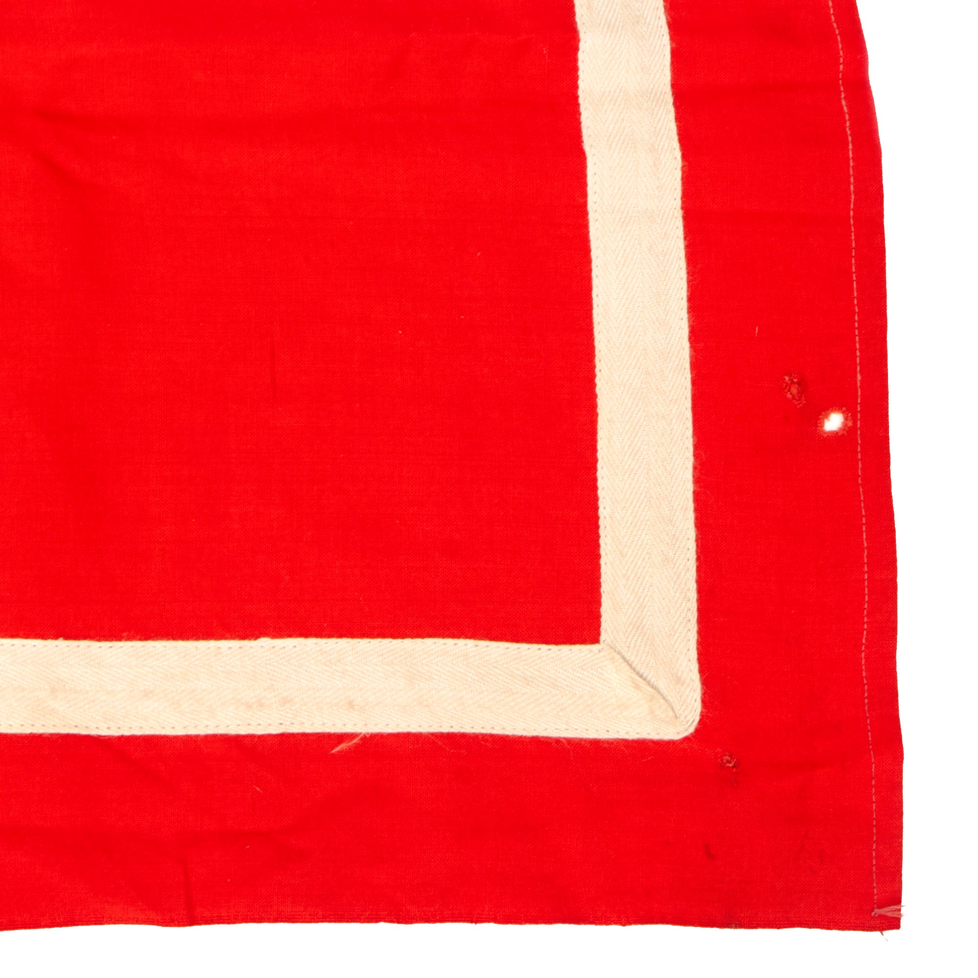 The banner is single sided and of multi-piece construction, with a black swas (hook cross) sewn on on a white canvas circle (one piece) stitched onto the red cotton background. Around this is a stitched on light canvas square white border, however unlike most we see, there is no white fringe on the bottom. It measures 39" x 31", and has a hemmed hanger sleeve at the top.
