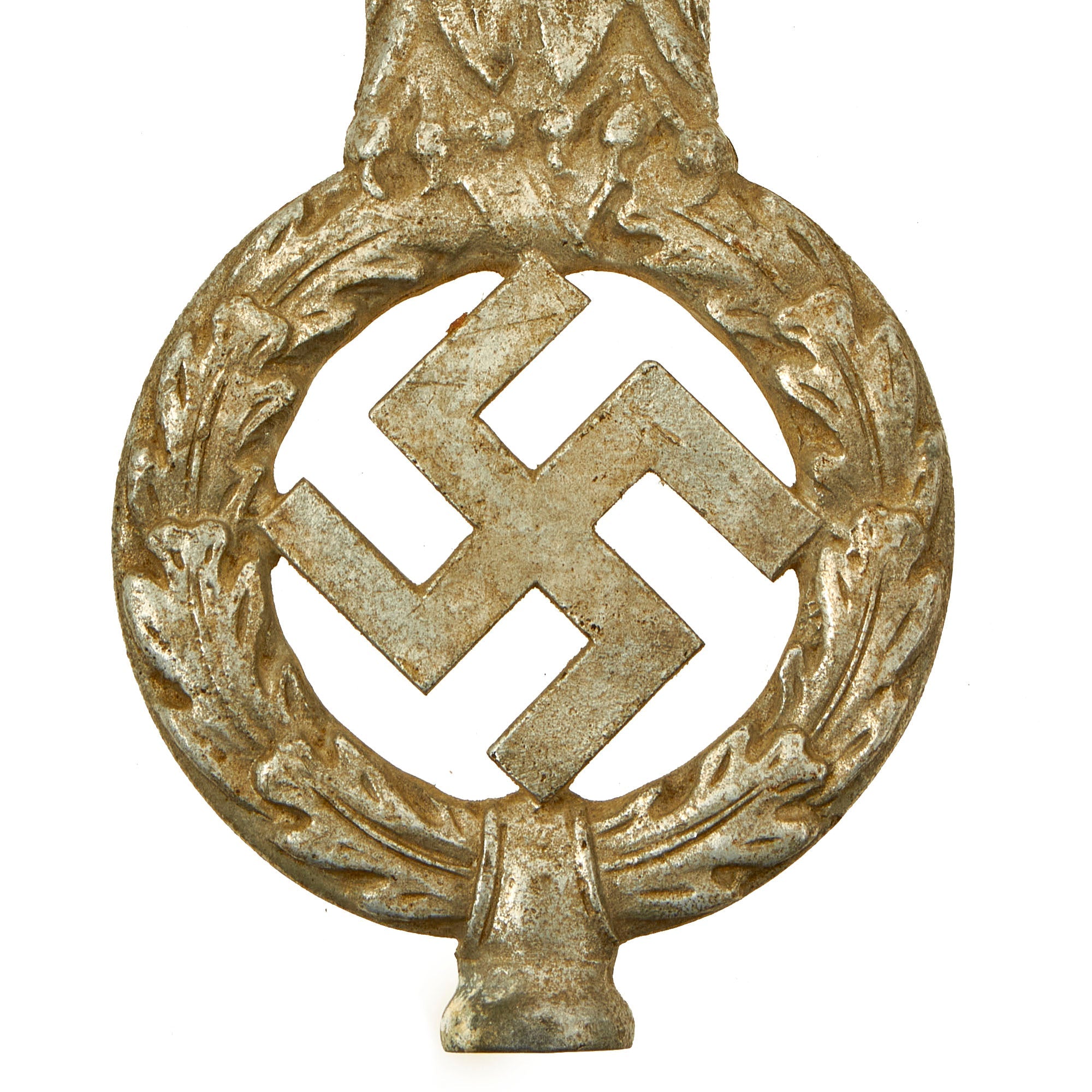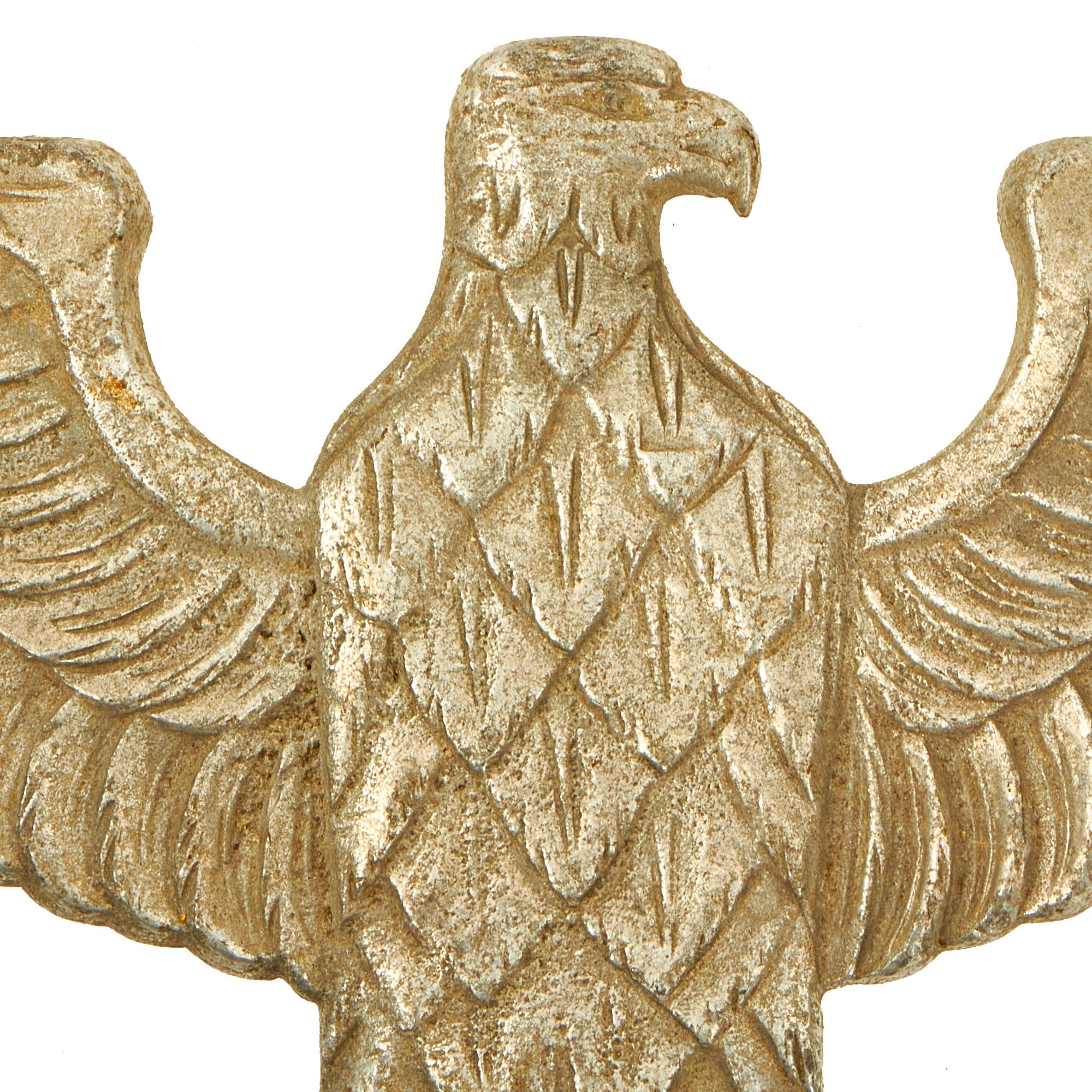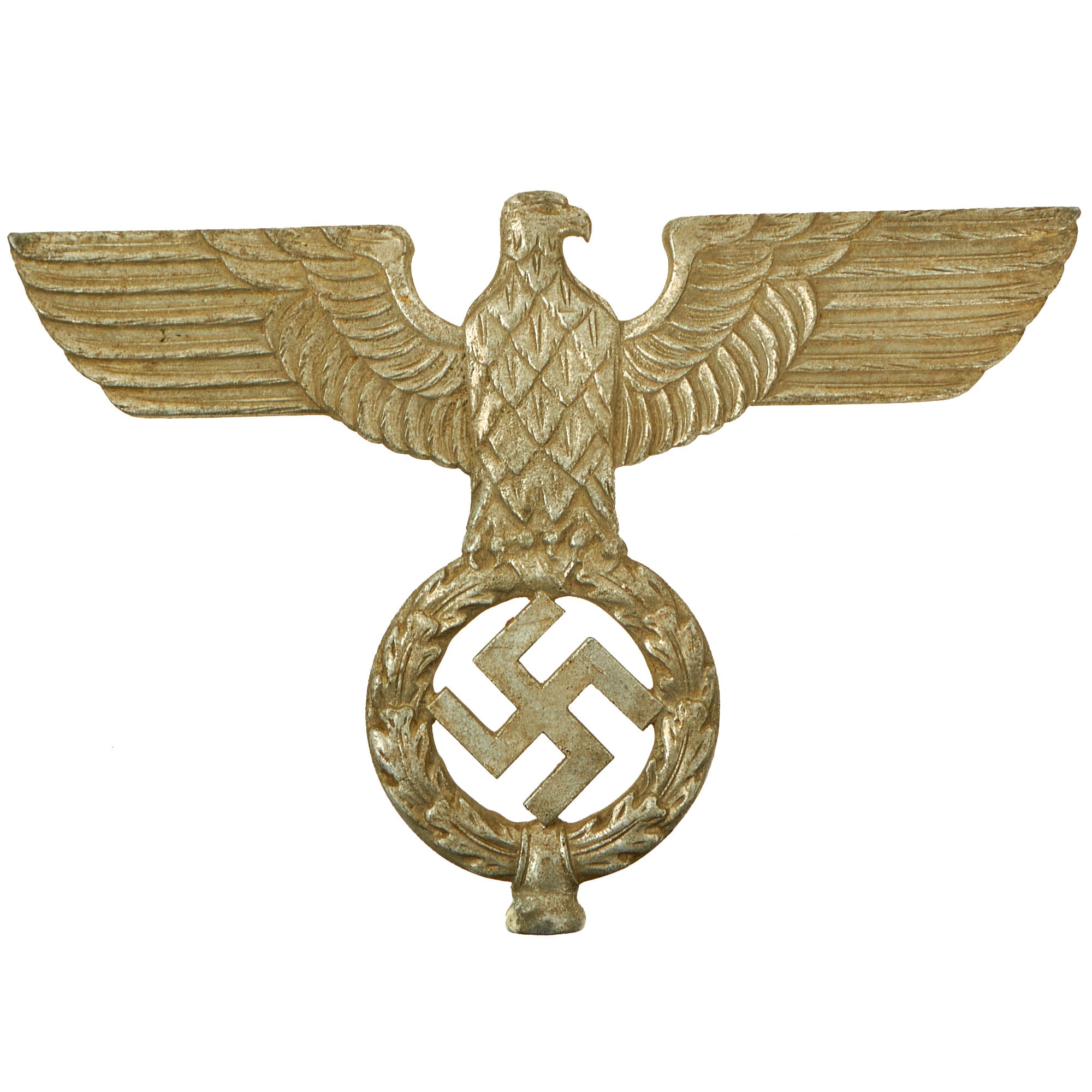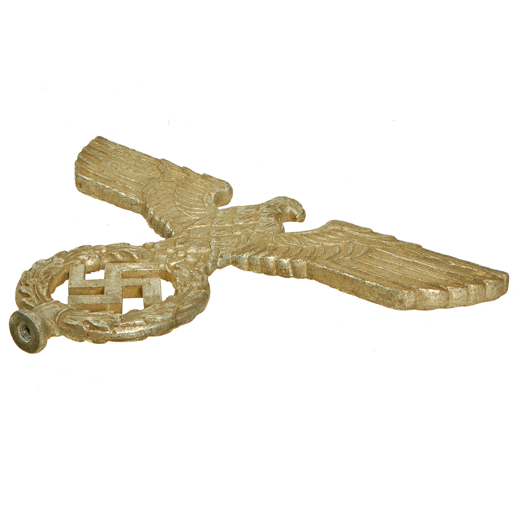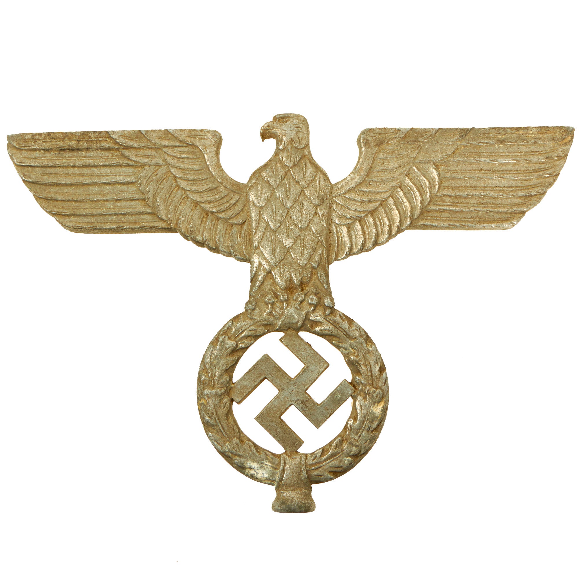 The design is the standard NSDAP "Spread Wing" Reichsadler (National Eagle), which looks to its left, and is perched on a wreath, with a mobile/canted Swas (swas) in the center. It measures 7 1/2 inches tall and is 10 3/4 inches wide at the tips of the wings. There is quite a bit of detail to the design on this transitional type, more than seen on other examples. Close examination with a 16X magnifier shows very high quality construction consistent with wartime aluminum items. We have compared it to numerous different pole topper eagles, original and replica, and it doesn't really match any known pattern, making it a fantastic research opportunity.