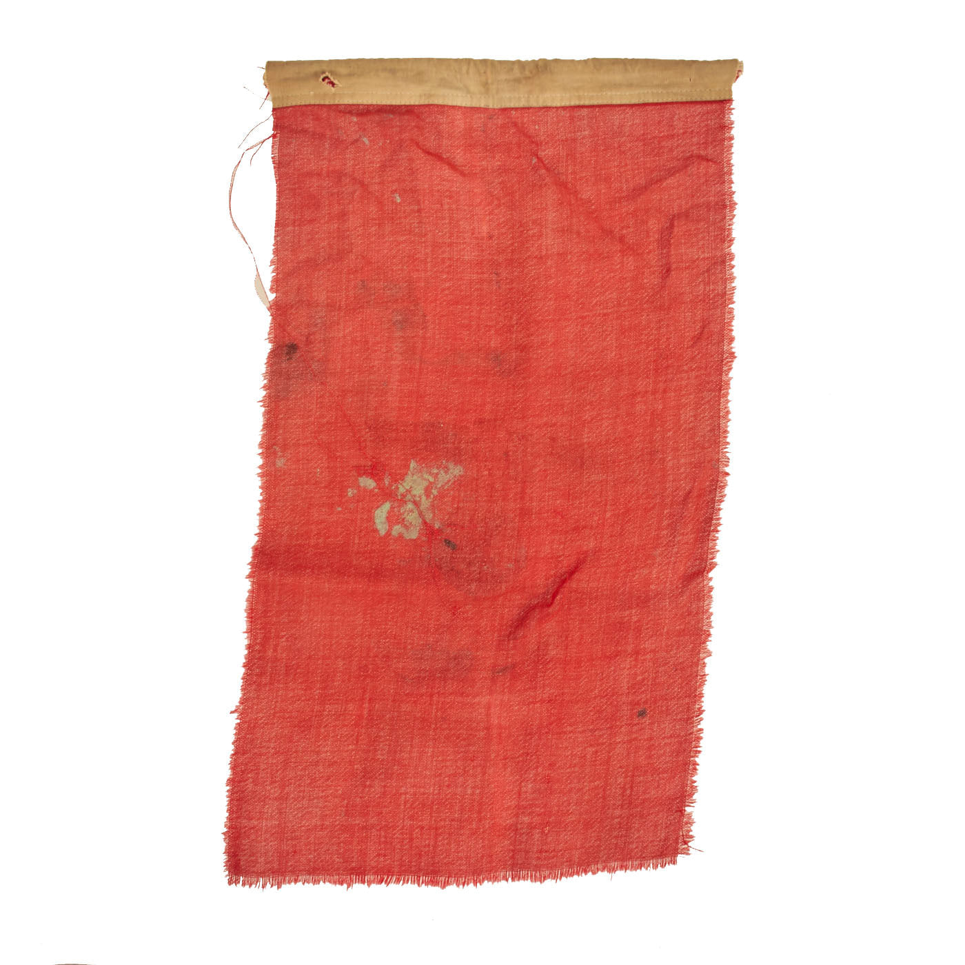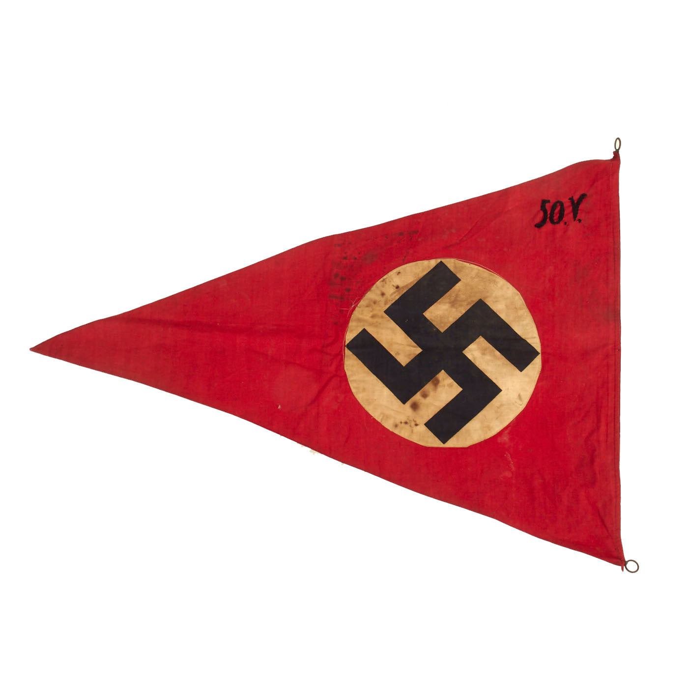 The German NSDAP National Socialist Wimpel (Pennant) is of multi-piece construction and measures about 18" in hoist and 26" in fly, with rings at the ends for suspension. It definitely shows age toning and staining, so this was definitely displayed for a long period of time. There is an embroidered 50. V. on the upper corner, but we do not understand the significance of this marking. It is very well done, and we suspect it is some type of unit marking.