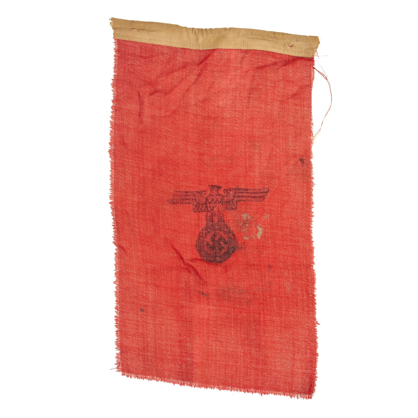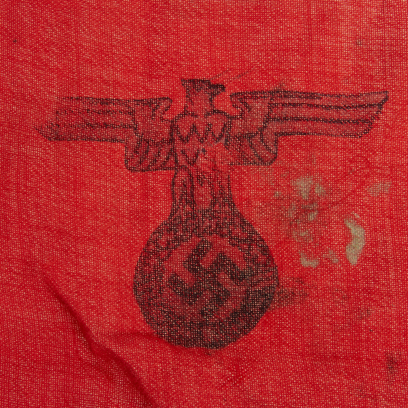 The small NSKK banner measures about 16" x 9 1/2", and looks to have been part of a larger flag or banner at some point. It may have been made from an older imperial or Weimar period flag, which was then cut up and repurposed to make small NSKK flags. It has the NSKK eagle paint stamped into the middle.