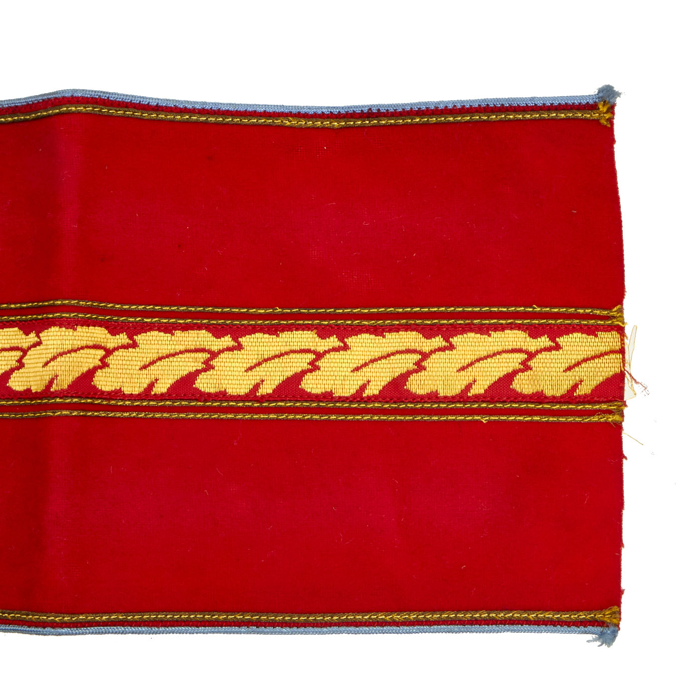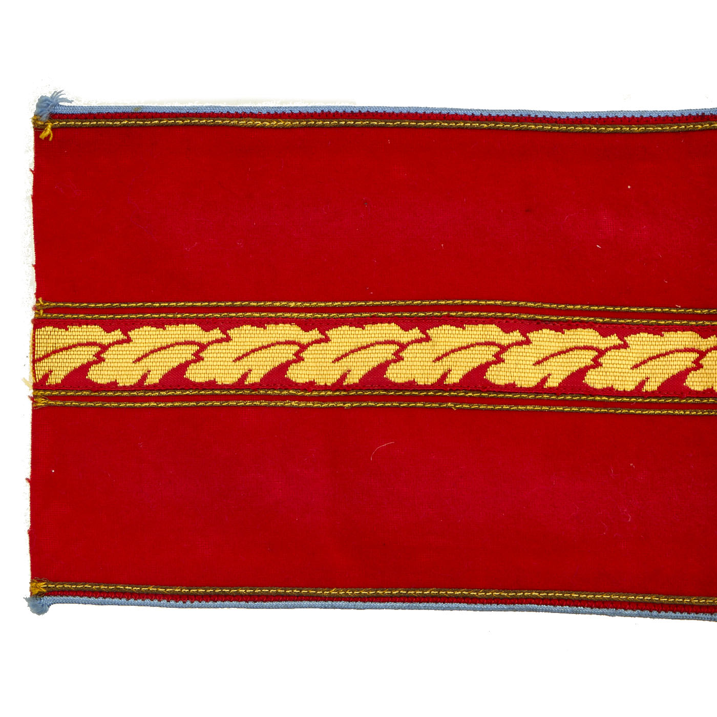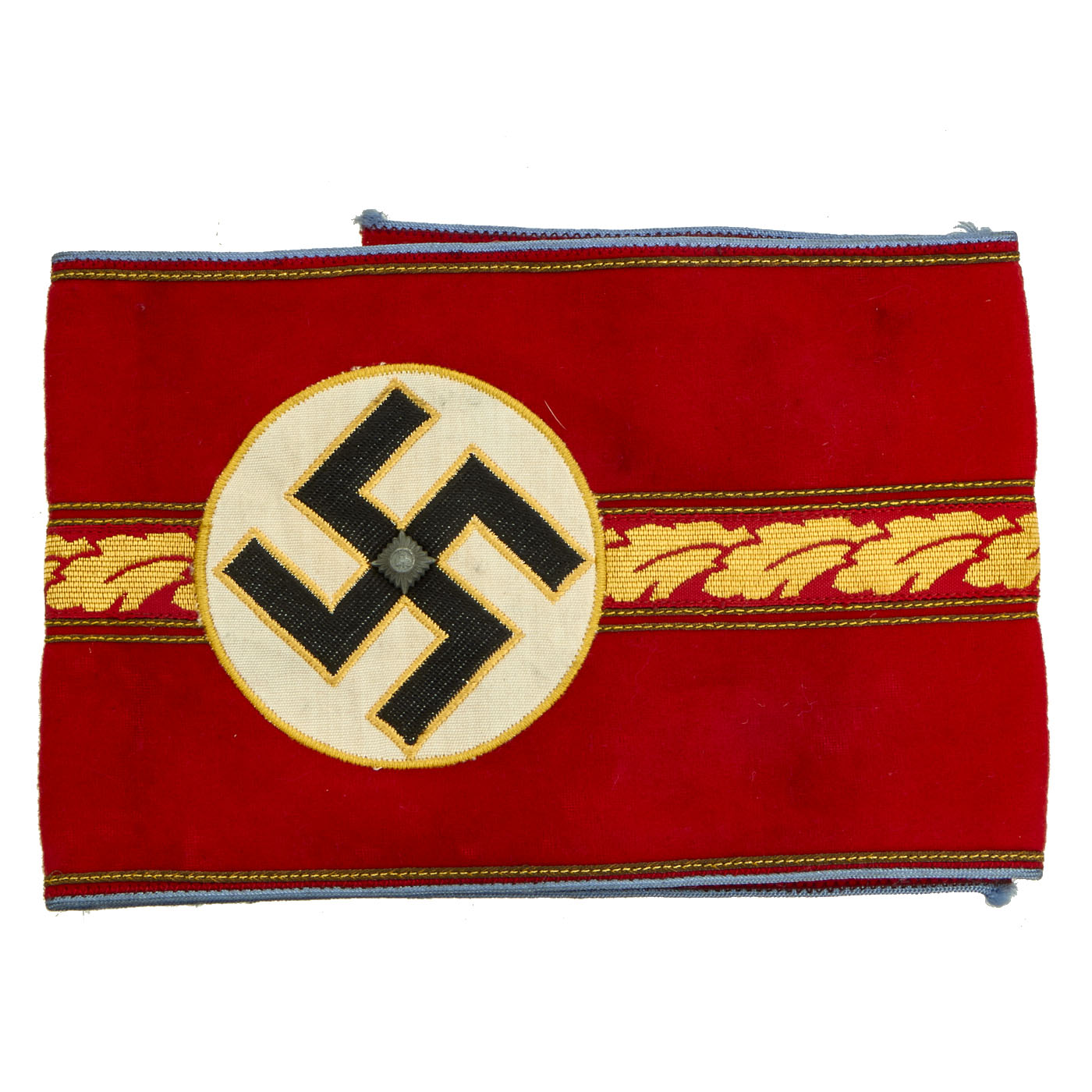 This lovely armband is constructed of a red wool/cotton blend cloth with a central black swas on a white rayon field, all bordered by yellow/gold cotton thread. To the center is a band of gold bullion wire oak leaves with the top and bottom bordered by a single narrow band of gold bullion wire threads, the outer edges also bear narrow bands of gold bullion wire threads. Light blue piping completes the outer edges, pinned into the center of the swas is a single brass pip with a NSDAP style German national eagle. Total length is 21” with a width of 5”. The armband is in very good, unissued condition with a few expected moth nips.