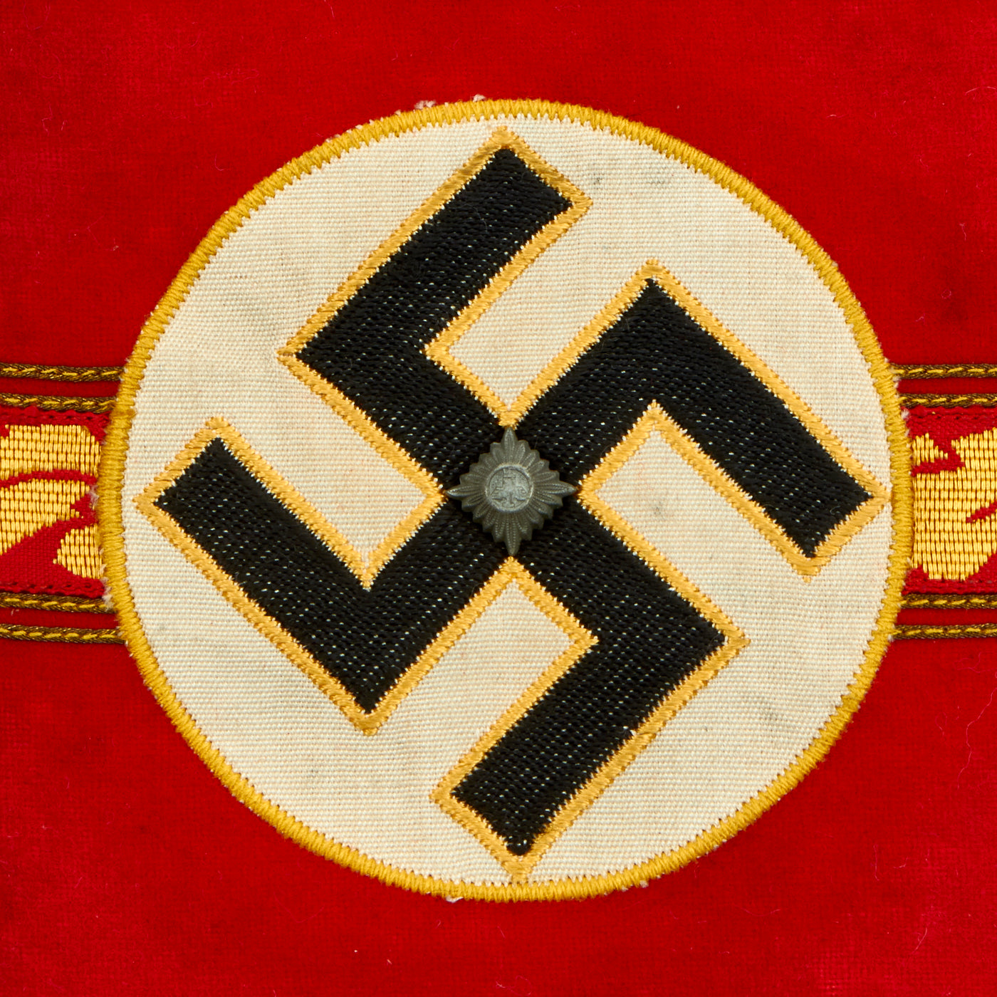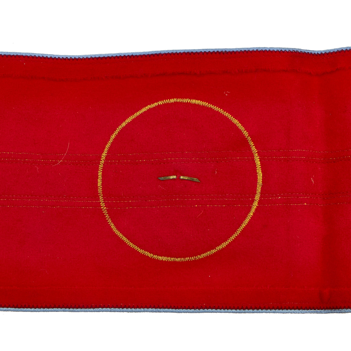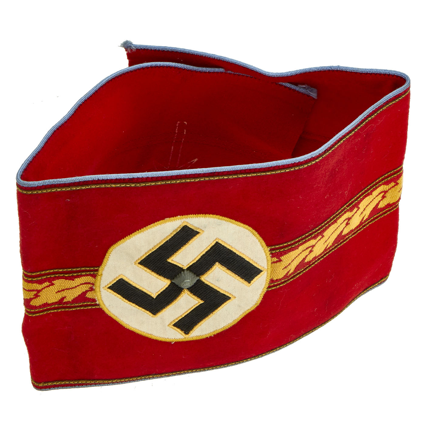 This lovely armband is constructed of a red wool/cotton blend cloth with a central black swas on a white rayon field, all bordered by yellow/gold cotton thread. To the center is a band of gold bullion wire oak leaves with the top and bottom bordered by a single narrow band of gold bullion wire threads, the outer edges also bear narrow bands of gold bullion wire threads. Light blue piping completes the outer edges, pinned into the center of the swas is a single brass pip with a NSDAP style German national eagle. Total length is 21” with a width of 5”. The armband is in very good, unissued condition with a few expected moth nips.