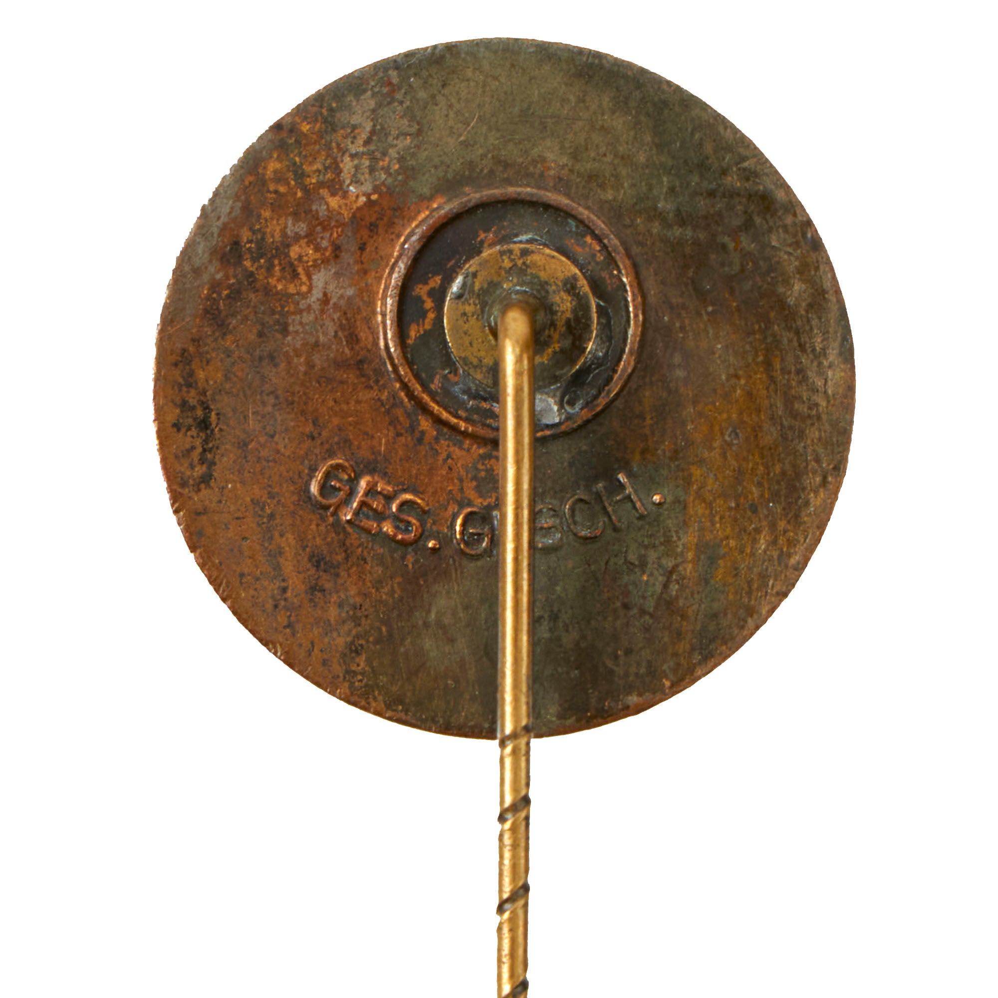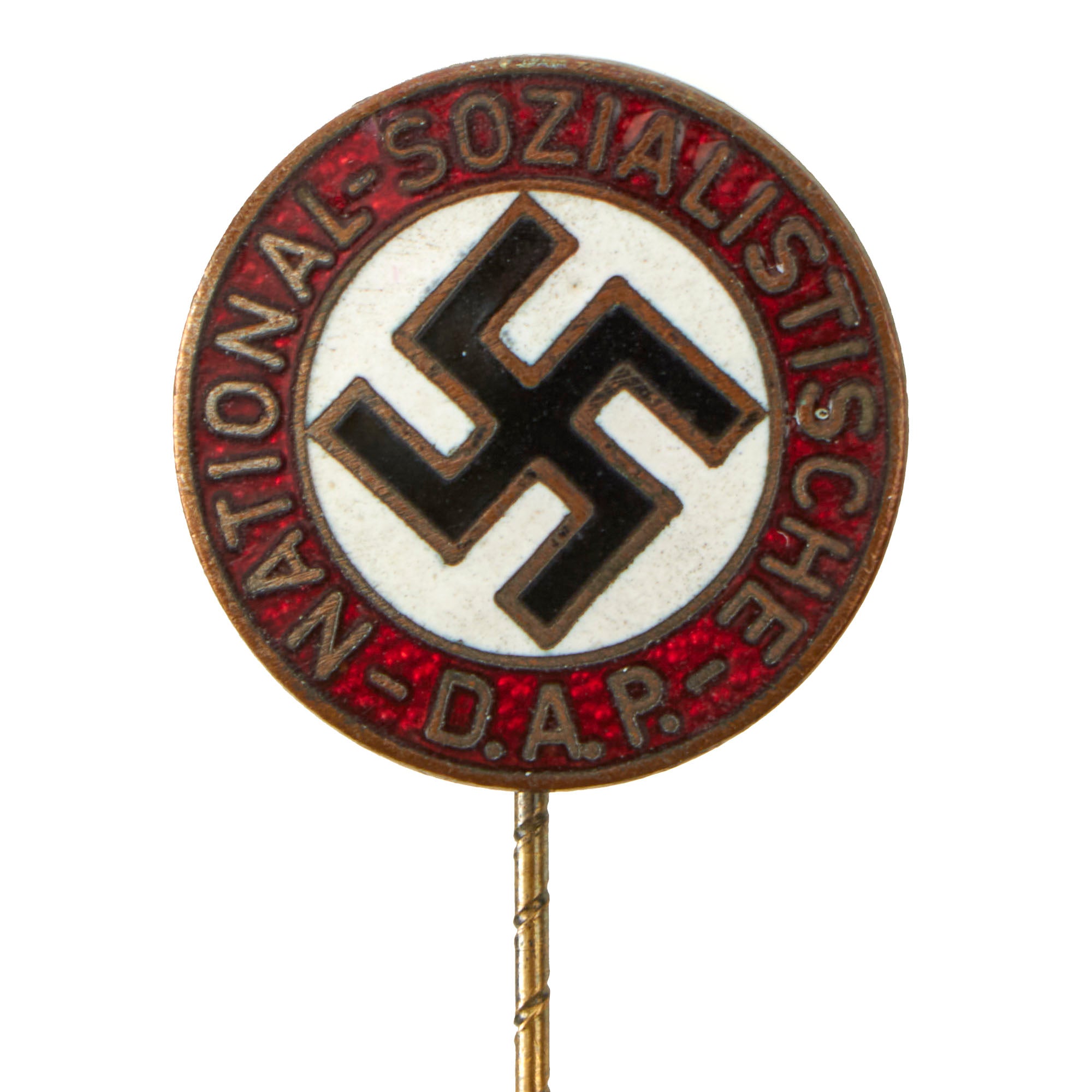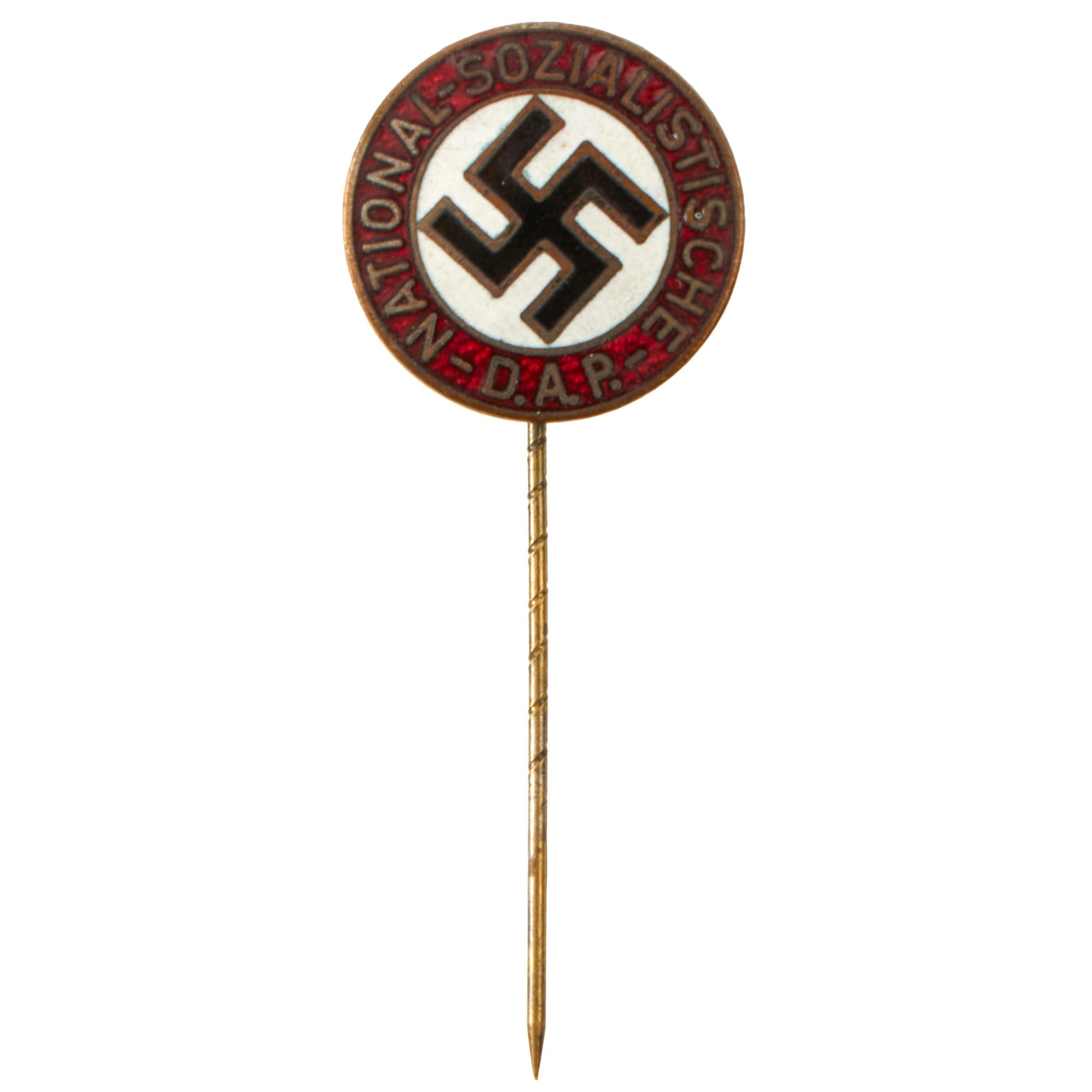 This example is measures 50mm in length, and the insignia measures 19mm in diameter, a die struck bronze alloy NSDAP membership badge with multi-colored enamel work. The badge features a translucent red, circular outer border with embossed silvered script, NATIONAL-SOZIALSTISCHE-D.A.P., encompassing a white enamel field with canted black enamel Swas. It is in very good condition, with the plating worn through on the obverse, showing the bronze alloy base metal. The rear has the plating more intact, but only about 50% or less.