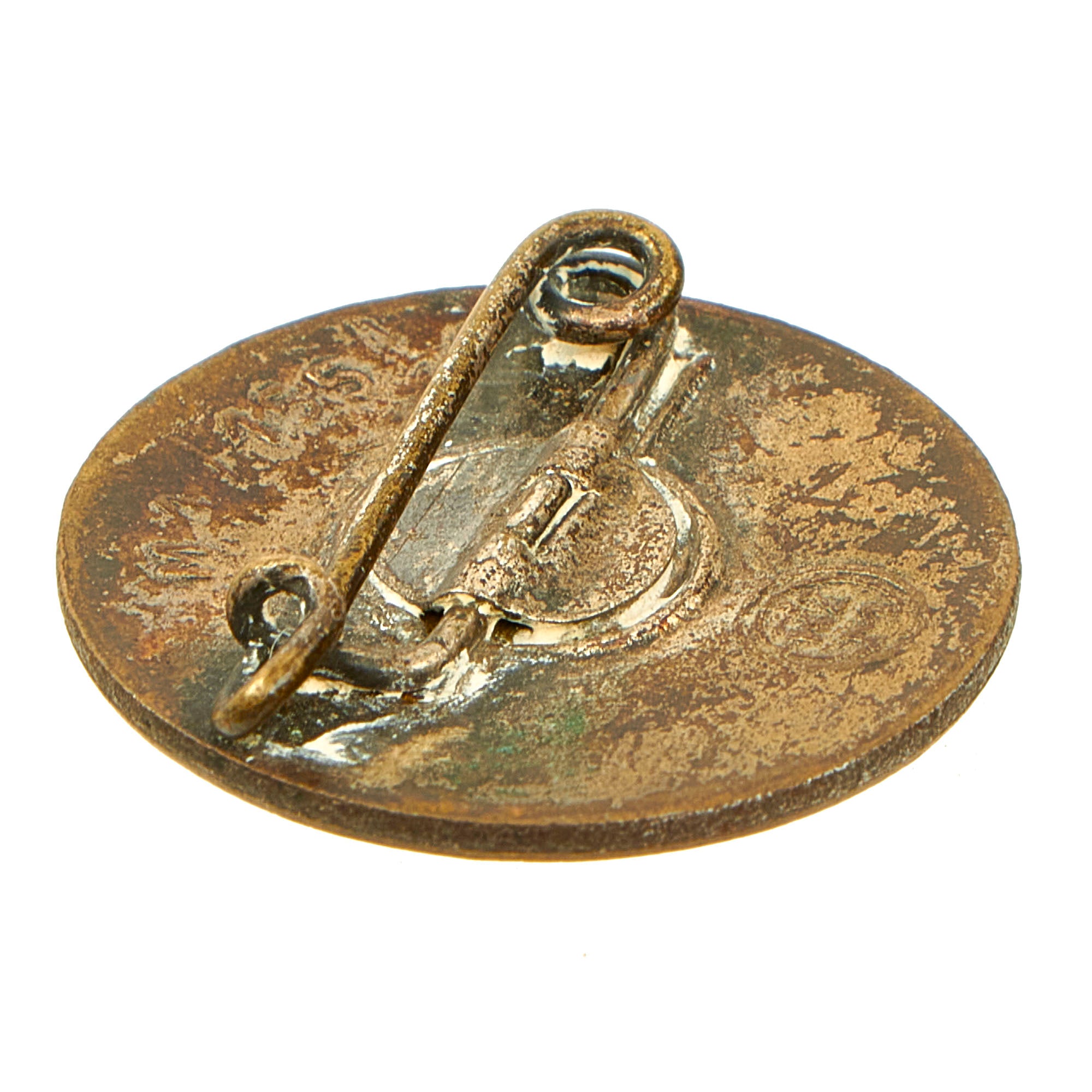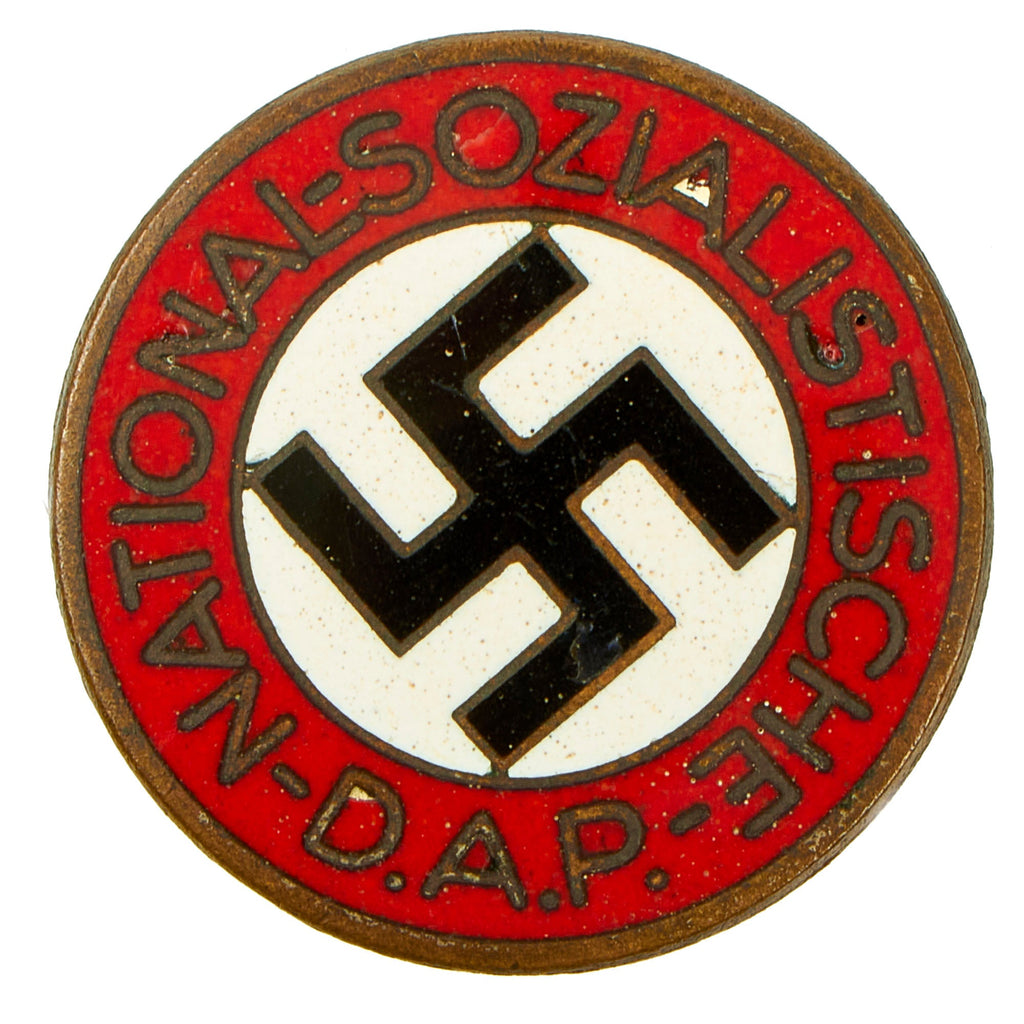 This example is a standard issue membership badge, awarded to all personnel on acceptance as an official party member. It is a 24mm diameter, die struck brass alloy badge NSDAP membership badge with multi-colored enamel work. The badge features a translucent red, circular outer border with embossed silvered script, NATIONAL-SOZIALSTISCHE-D.A.P., encompassing a white enamel field with canted black enamel Swas (hook cross). In very good condition, with the plating well retained on the back, while the front is partly worn away to the base metal. Overall good condition with good enamel, which just has a few tiny scratches and a chip near the S. The back has a very nice functional "safety pin" style attachment, which would work on any type of clothing.
