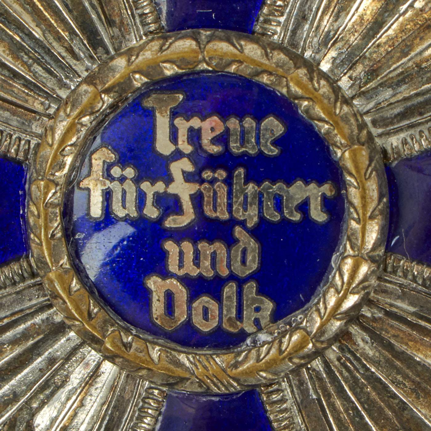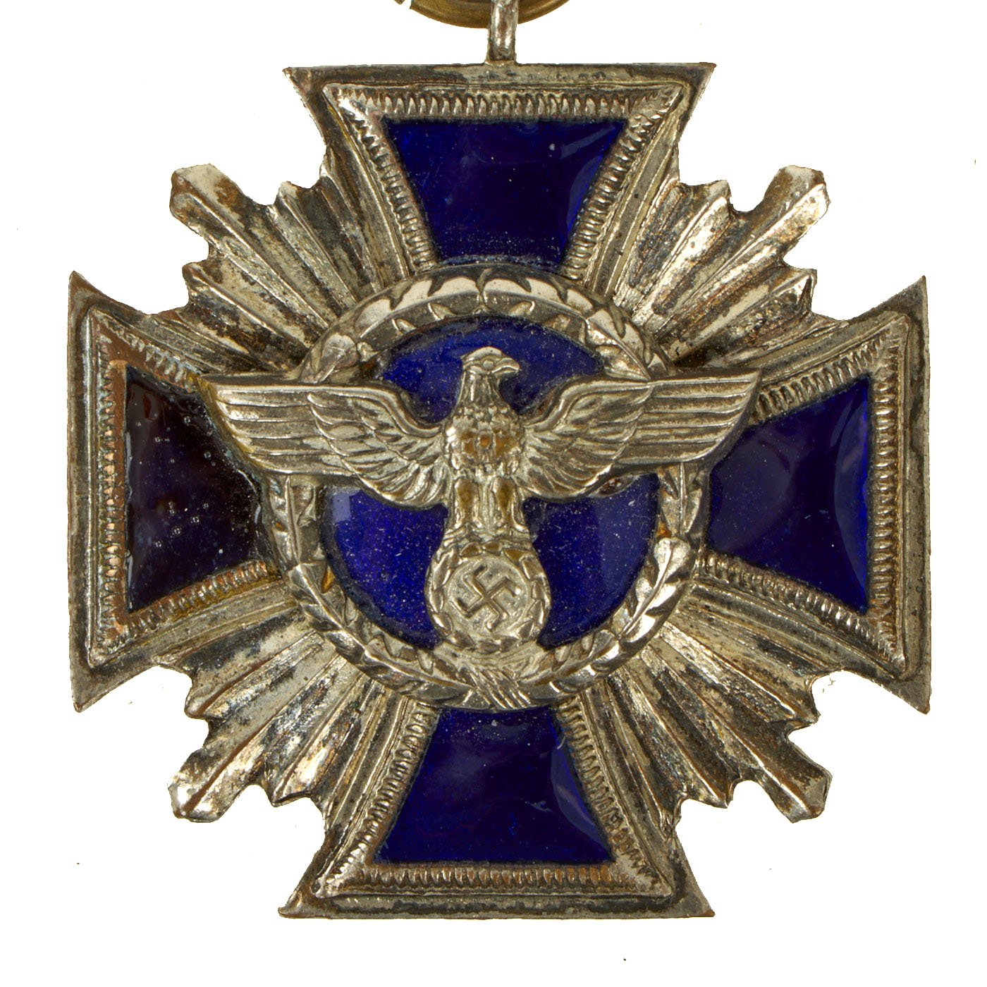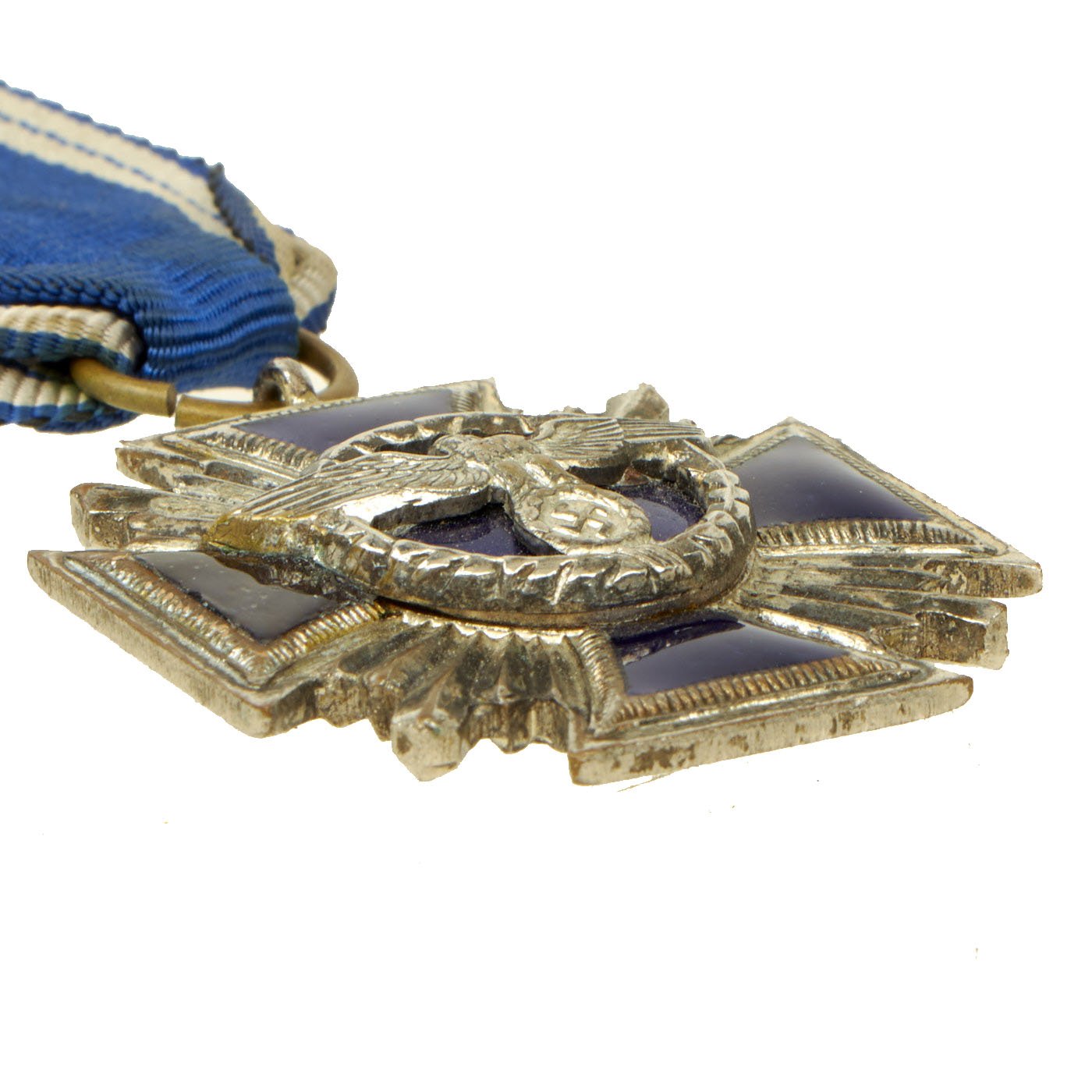 This is a very nice example of the Second class award, for 15 years of service to the NSDAP. It is silver plated with dark blue enamel on the arms of the four-pointed cross and for the center section inside of the oak leaf wreath. It comes complete with the dark blue ribbon with two gray stripes towards each edge. There is a bit of wear on the wreath around the inscription, as well as some light staining to the ribbon. The silver has a lovely patina, and the enamel is very well retained.