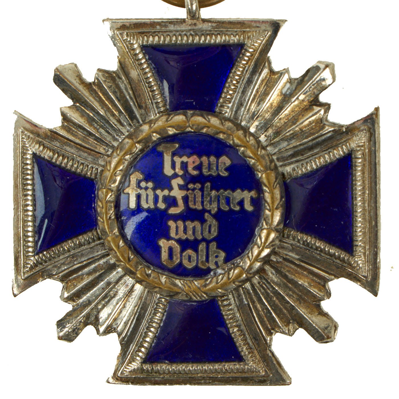 Original Item: Only One Available. The NSDAP Party Long Service Award (Die Dienstauszeichnung der NSDAP) was a political award in the form of a badge awarded during the Third Reich era. The award was given in three grades of ten years, fifteen years, and twenty-five years of service. On its reverse side, each award had emblazoned the inscription, in German: Treue für Führer und Volk (Loyalty to Leader and People). The service award was a four-pointed cross (Ordenskreuz) cross with slightly curved arms. In the center of the cross is the national eagle with an oakleaves wreath. Between the arms were rays, which was suspended from a 30mm ribbon. On 2 April 1939, AH ordered its institution for male and female members of the NSDAP who met certain qualifications. The award was first given out on 30 January 1940.