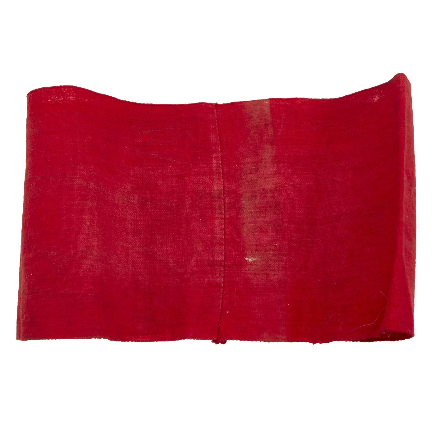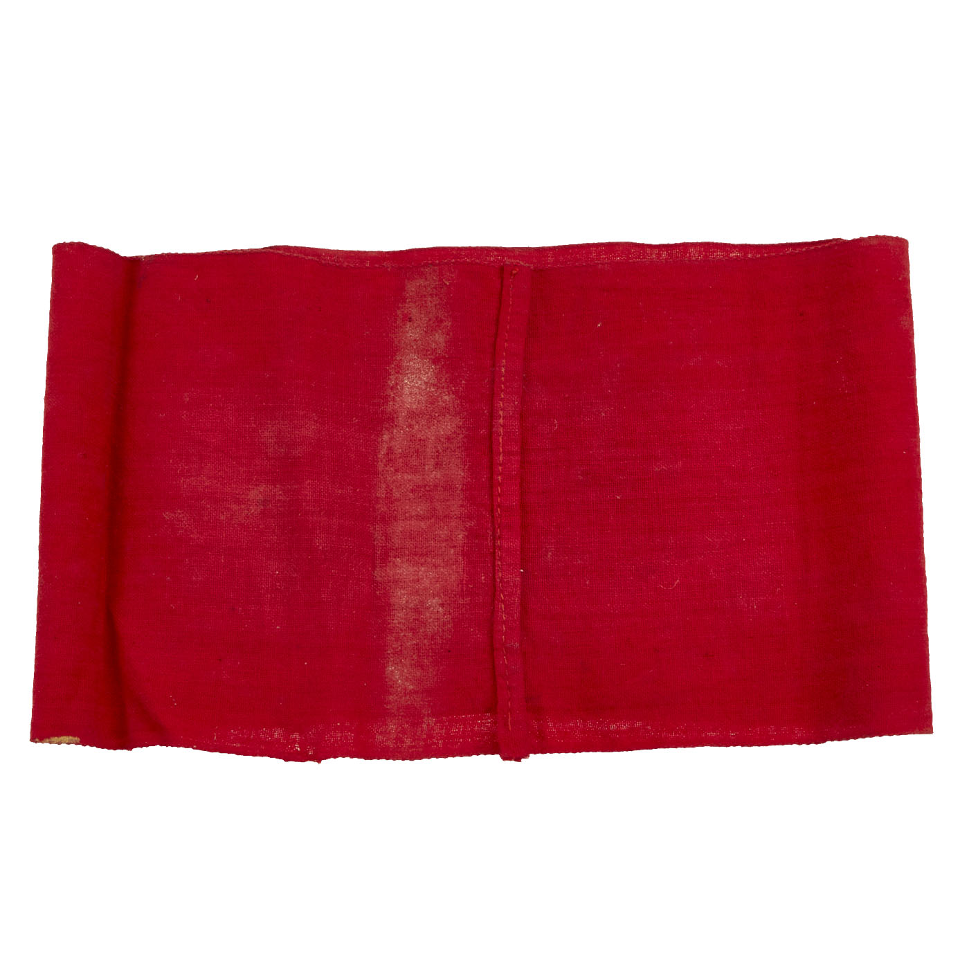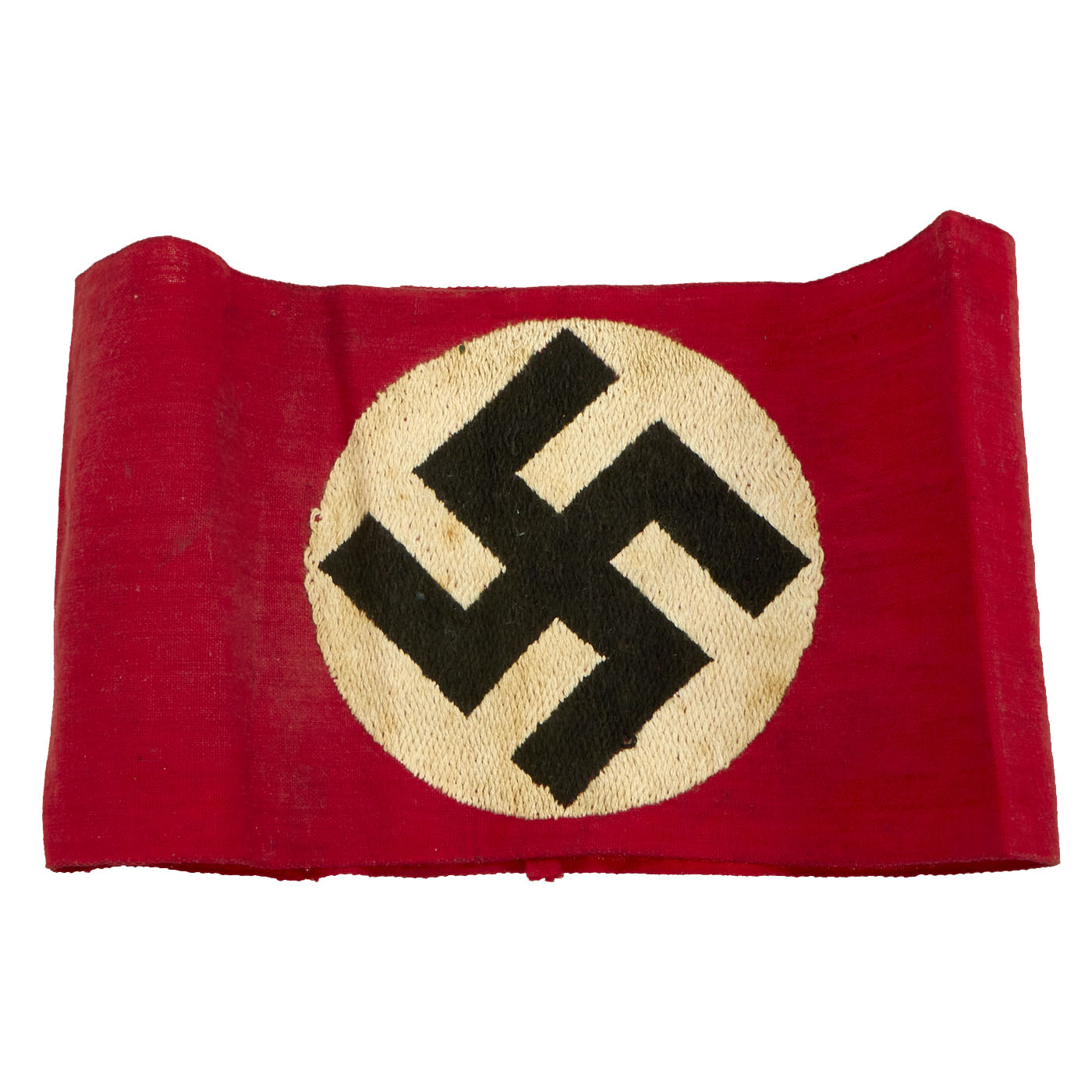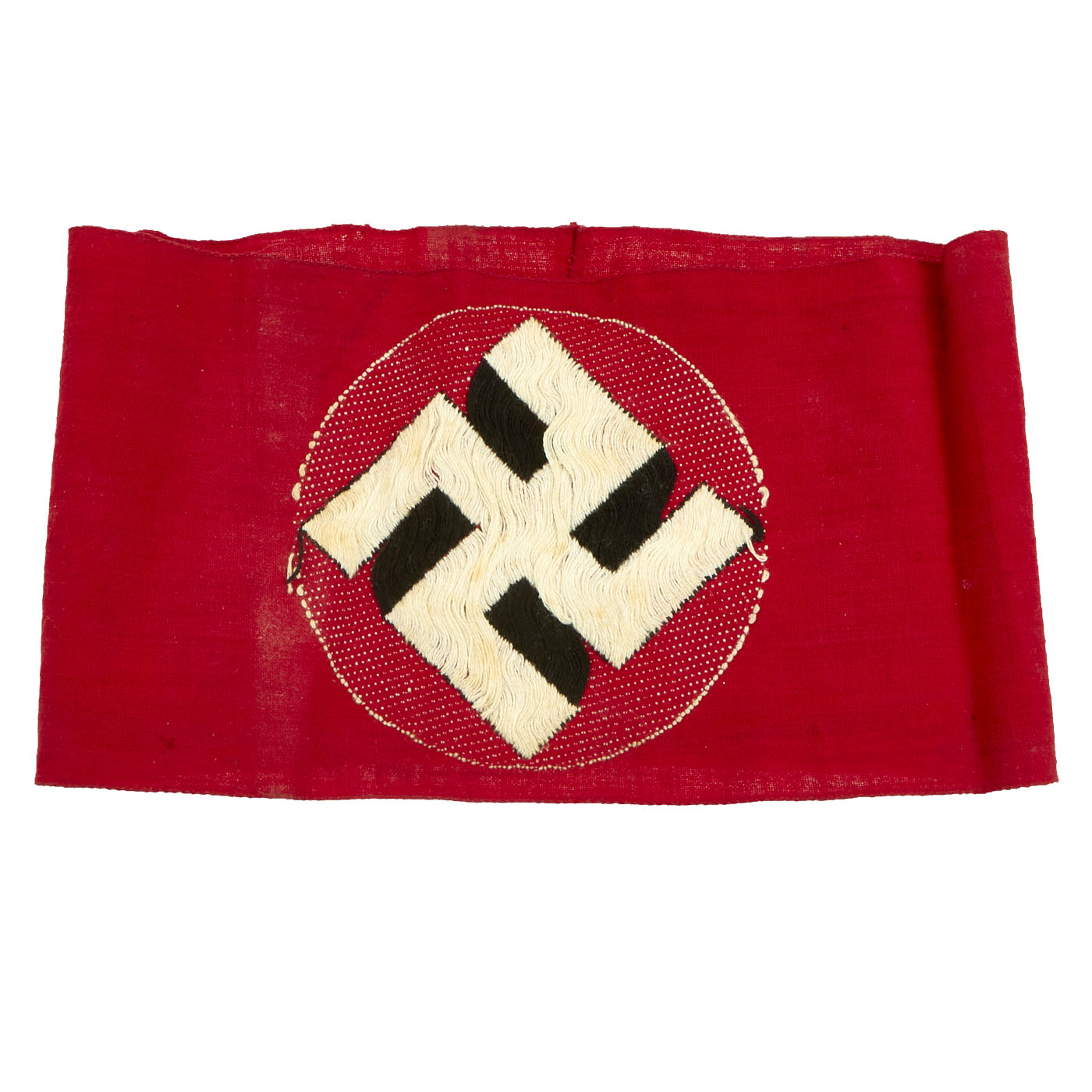 This standard armband was worn by party members, and was also worn by many service members and other personnel during the war. It is in very good condition, showing light wear and staining from service. It measures approximately 14 3/4" x 3 7/8", with the ends sewn together. It is definitely one of the rarer types, with a red band that has the insignia machine embroidered directly onto the band with white and black thread.