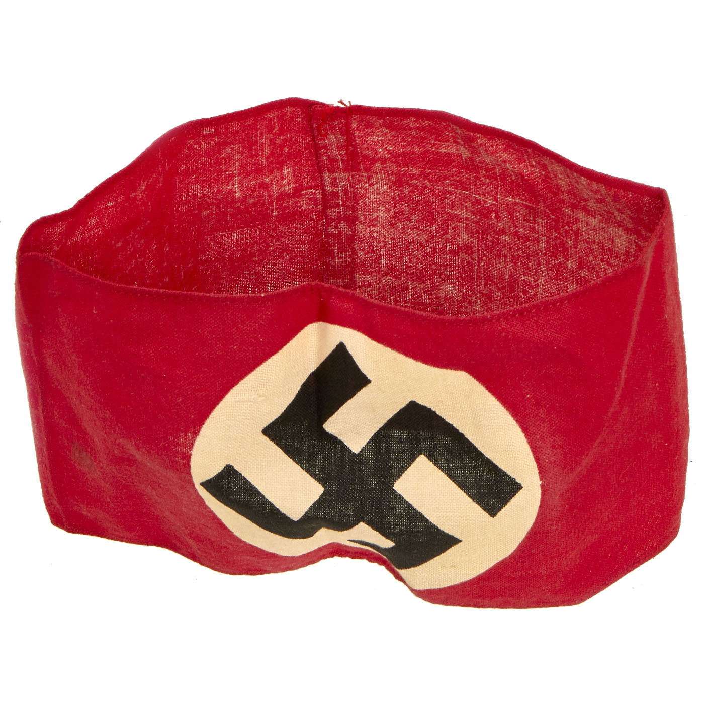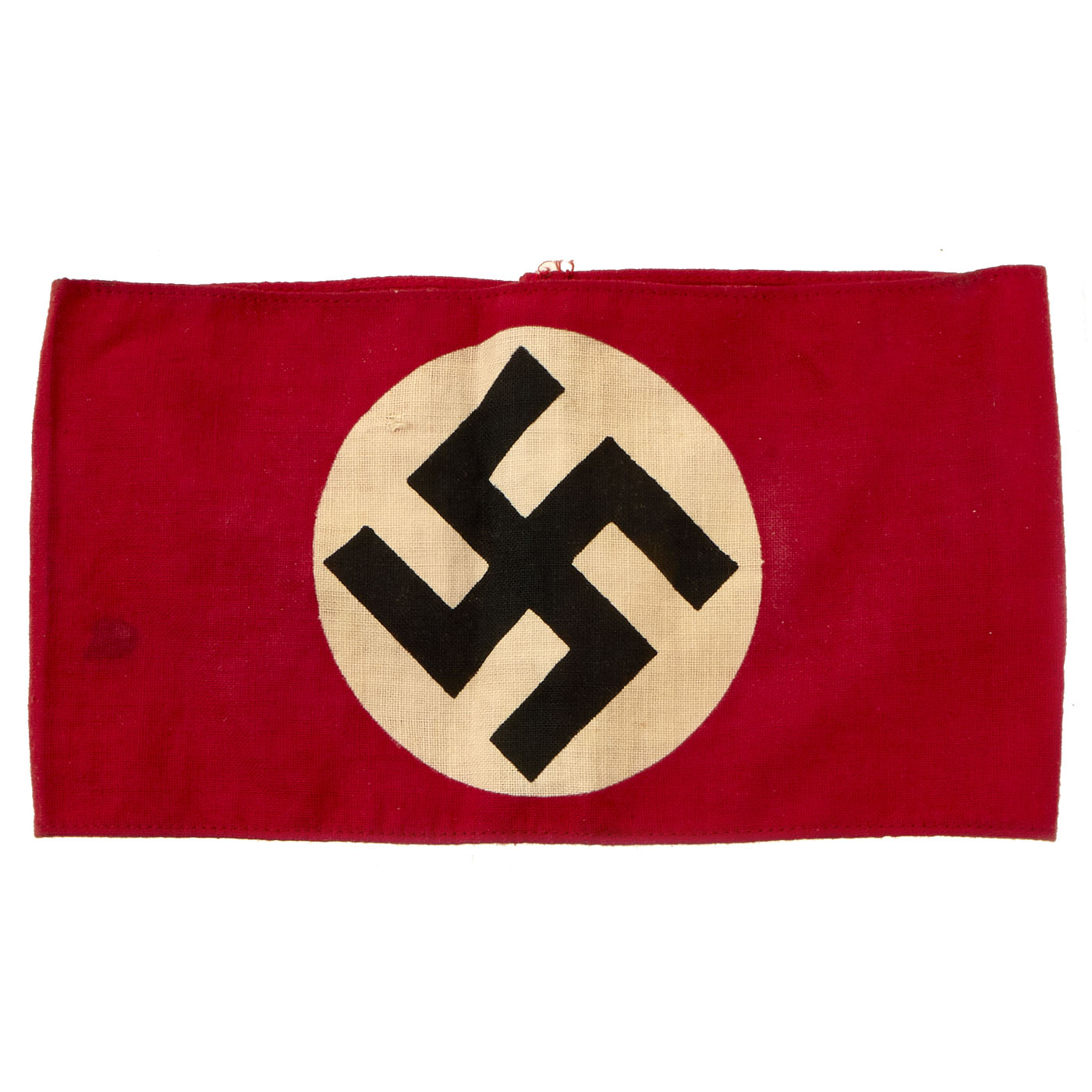 This standard armband was worn by party members, and was also worn by many service members and other personnel during the war. It is in very good condition, showing light wear and staining from service. It measures approximately 15 1/2" x 4", with the ends sewn together. It is made from cotton with the insignia printed onto the outside.