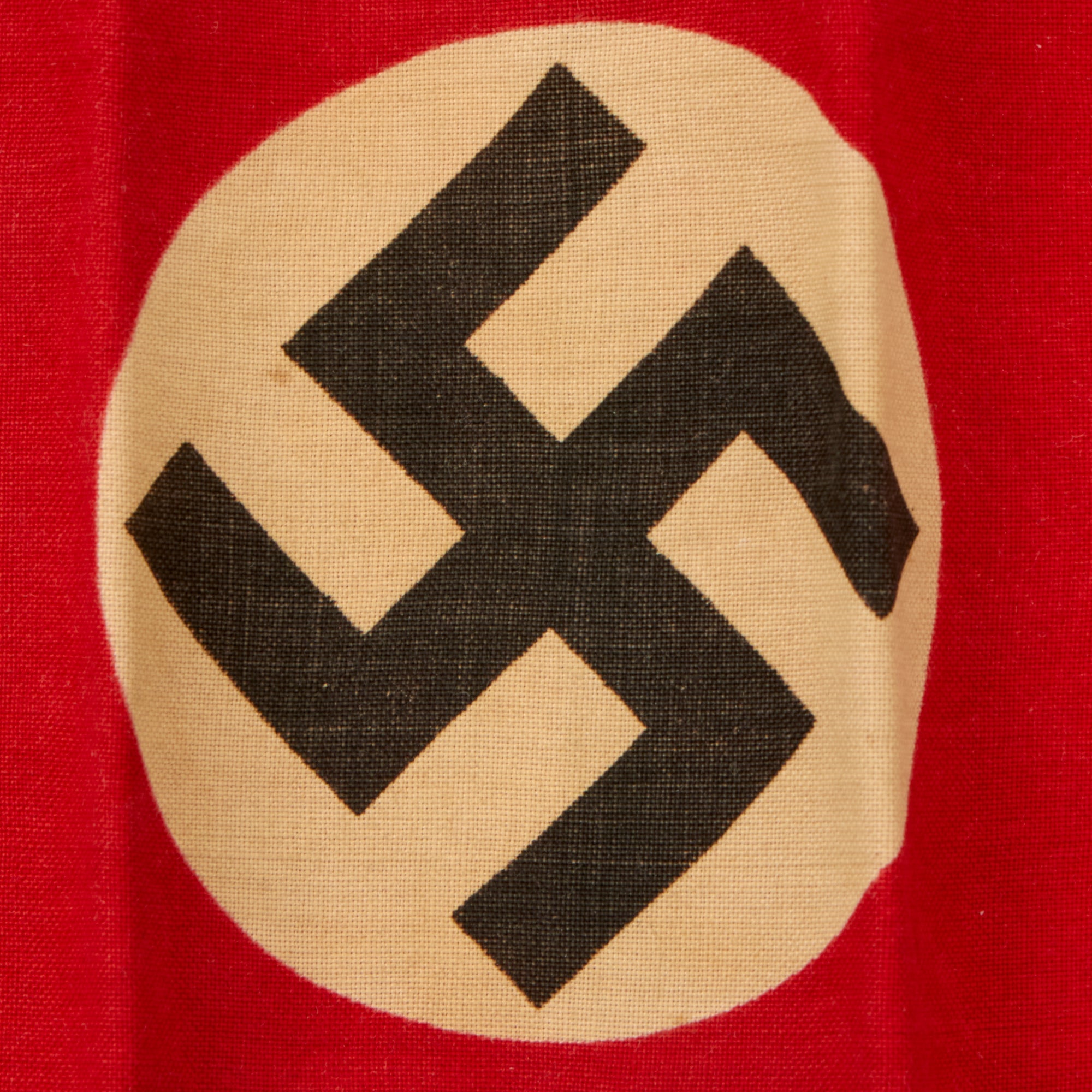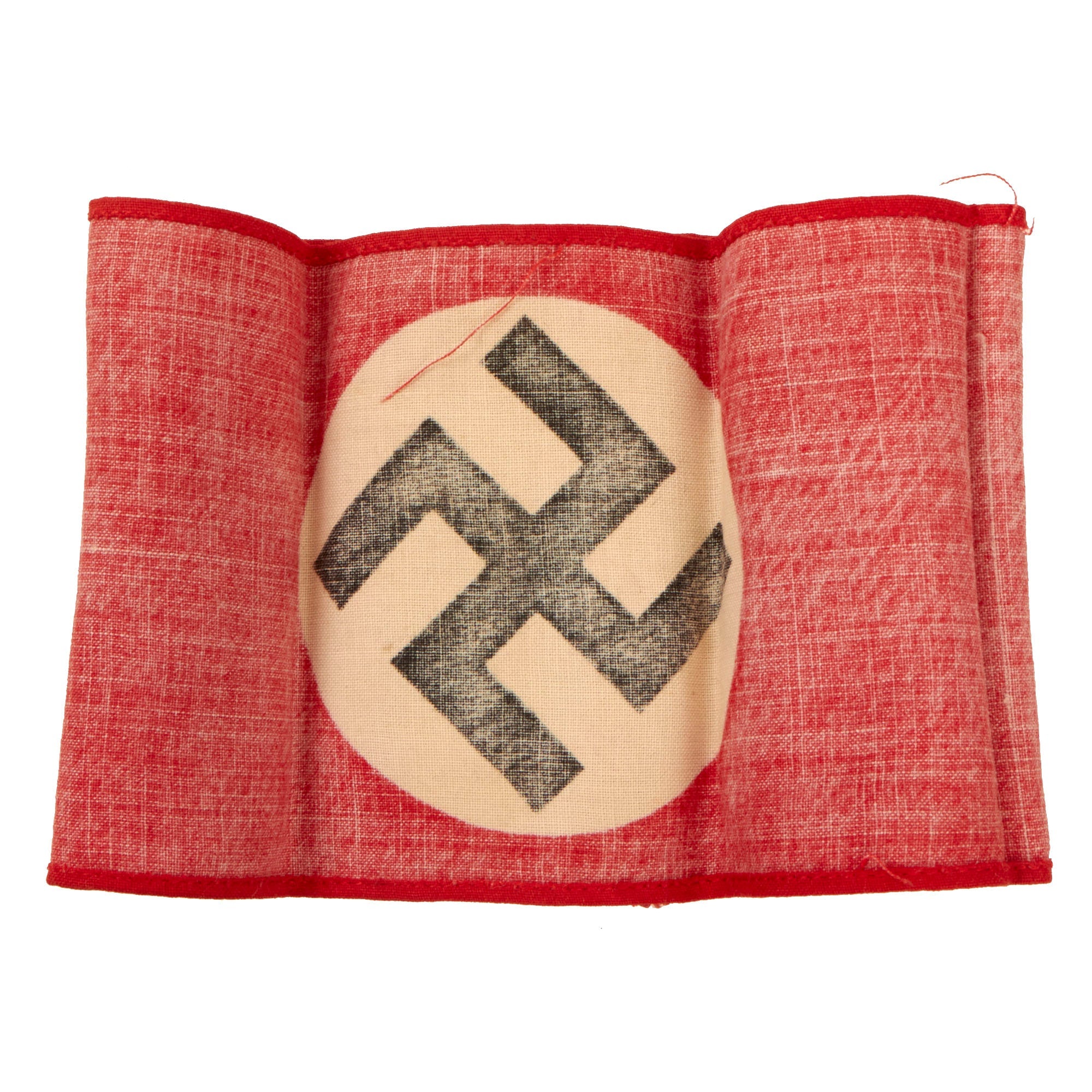 This standard armband was worn by party members, and was also worn by many service members and other personnel during the war. It is in very good condition, showing light wear and staining from service. It measures approximately 15" x 4 1/4", with the ends sewn together. It is made from cotton with the insignia printed onto the outside.