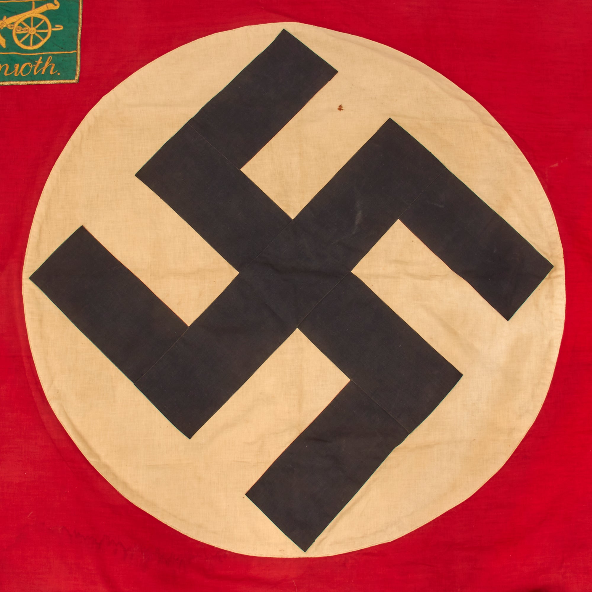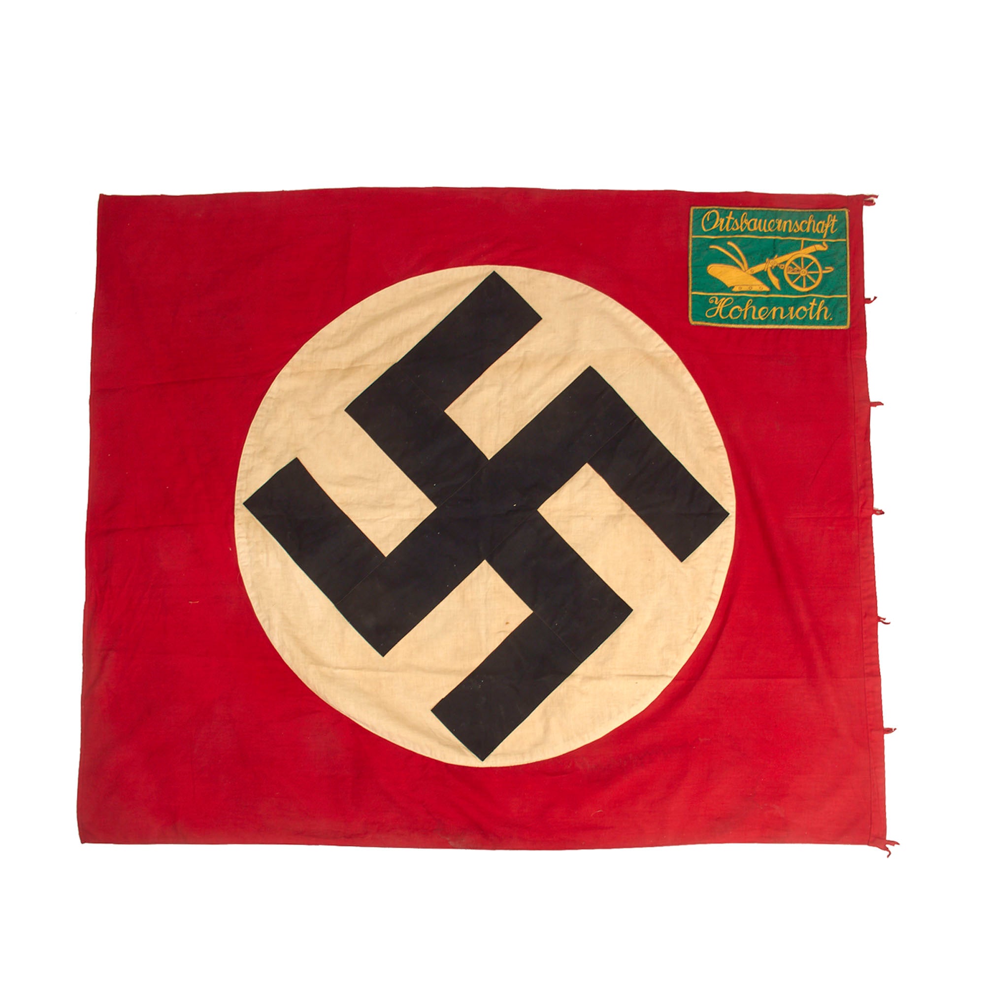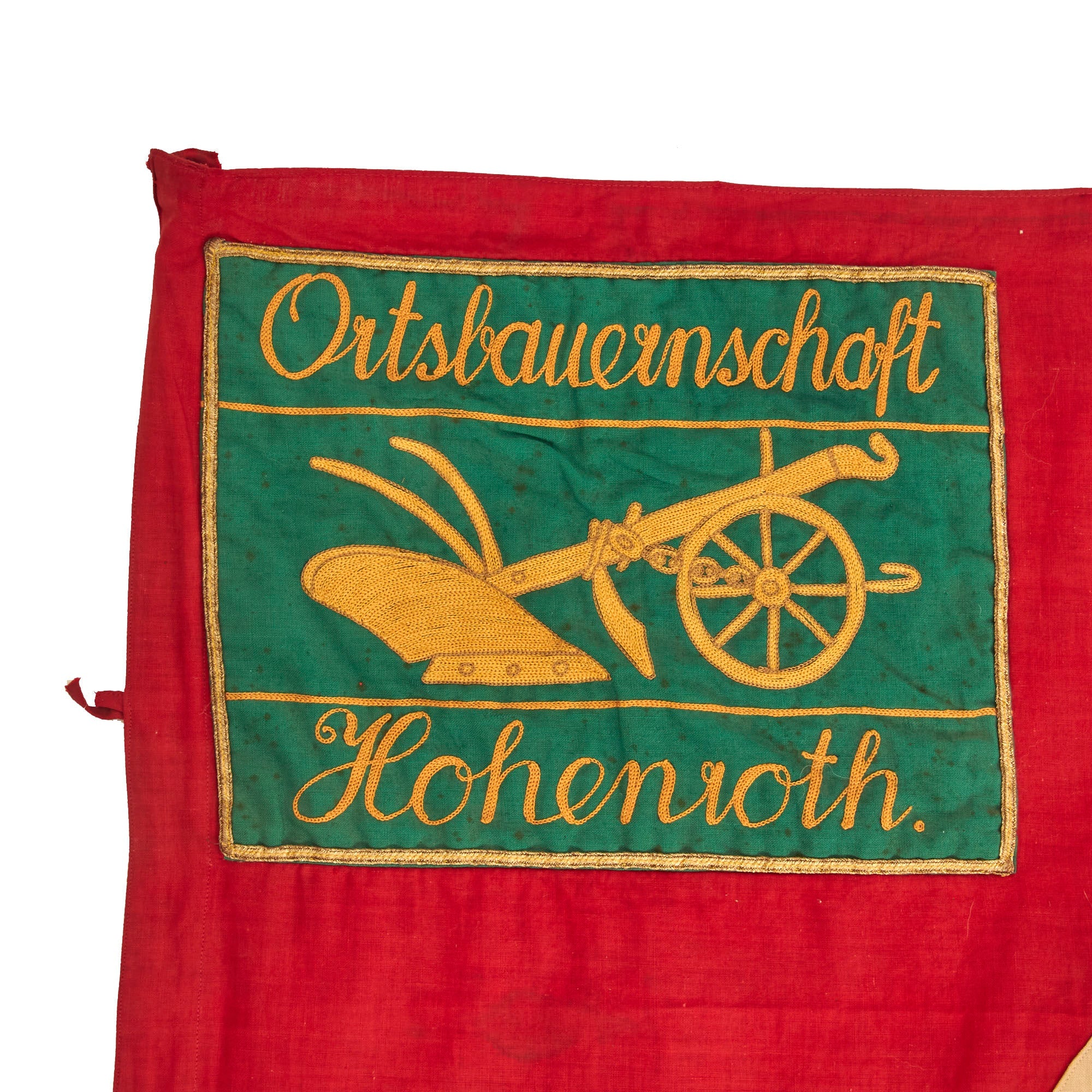 The flag itself is very similar to the NSDAP standard, with a red cotton canvas background, and it is double sided, with white circles bearing sewn on black NSDAP swas (hook cross) emblems on each side. The flag measures 45" x 54" overall, and the canton bears and 8 3/4" x 11 3/4" green rectangular patch with a gold bullion border, for Bauernschaft (agriculture). It bears yellow / gold chain stitched embroidery, showing a plow in the middle, with Ortsbauernschaft (local agriculture) above, and the location of Hohenroth below. This is a rural area in the Bavarian area of Germany.