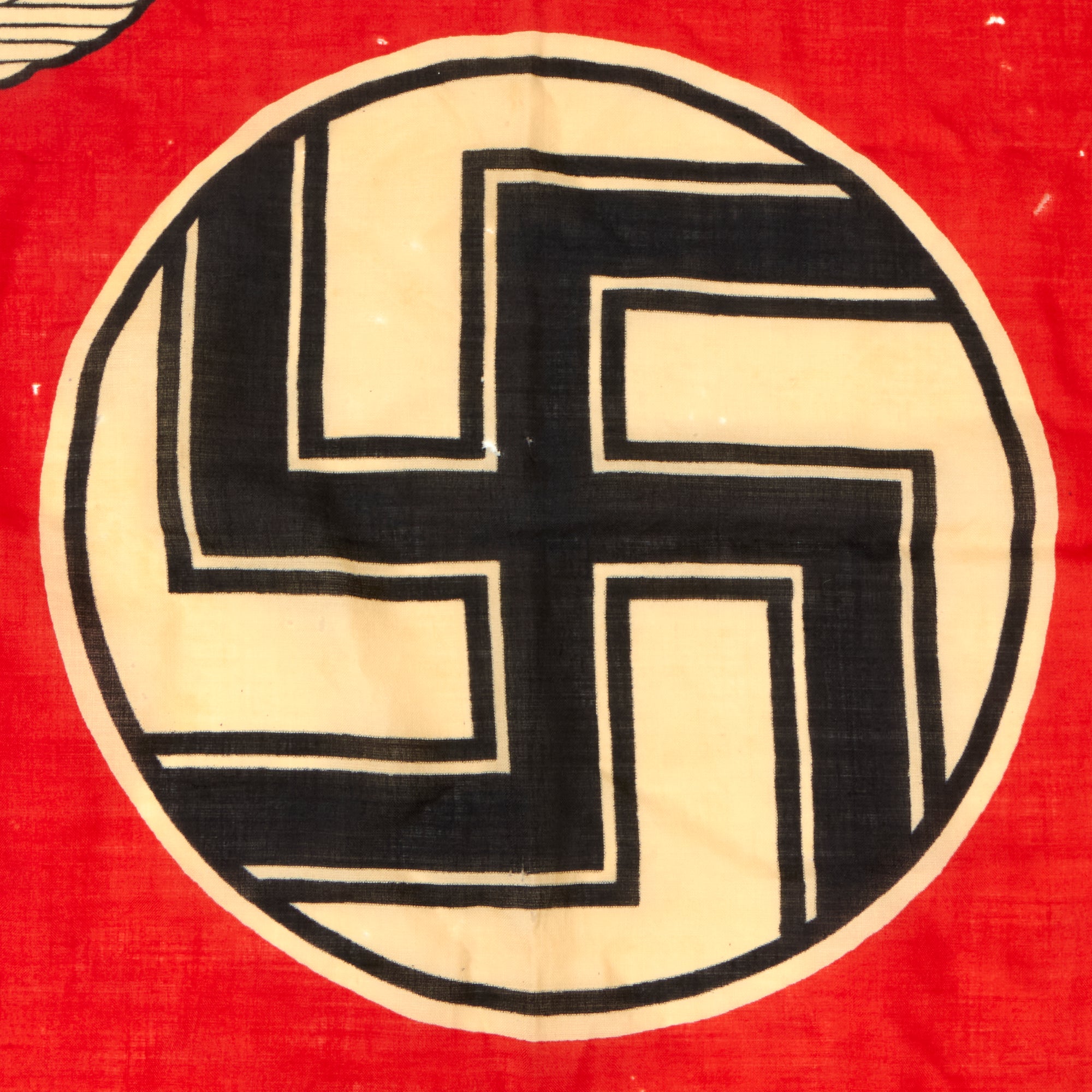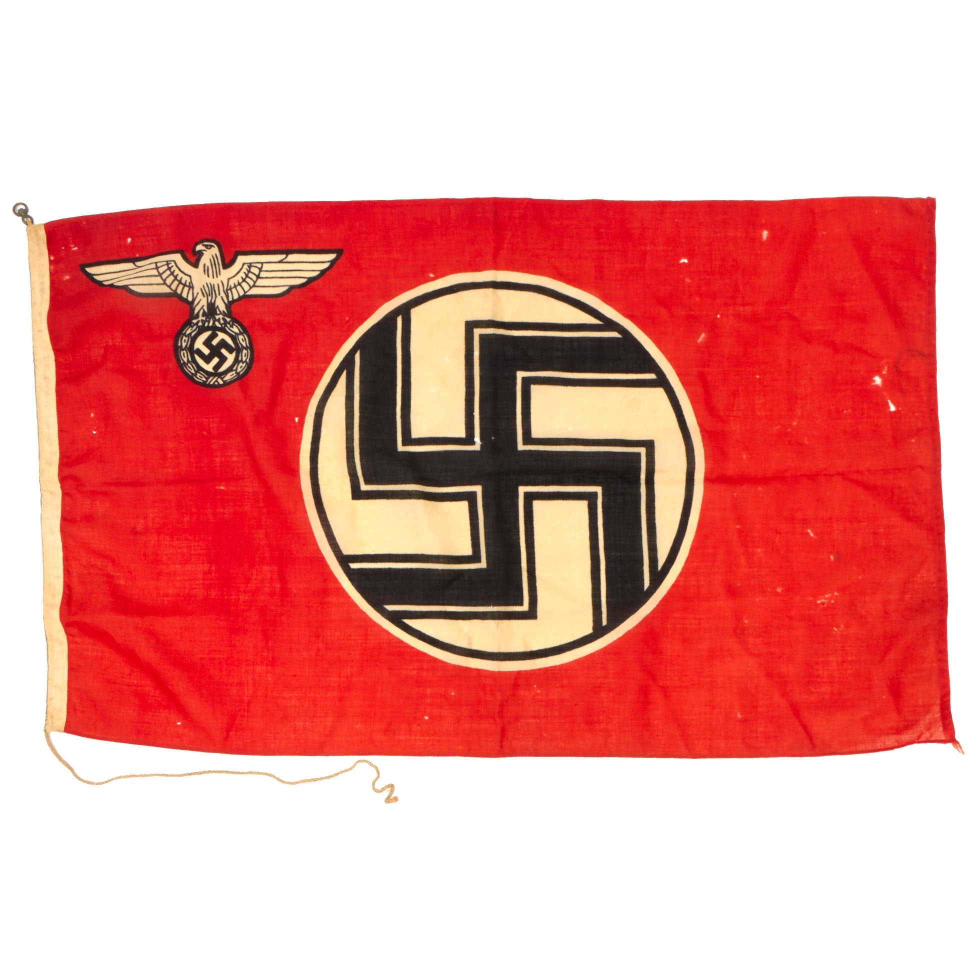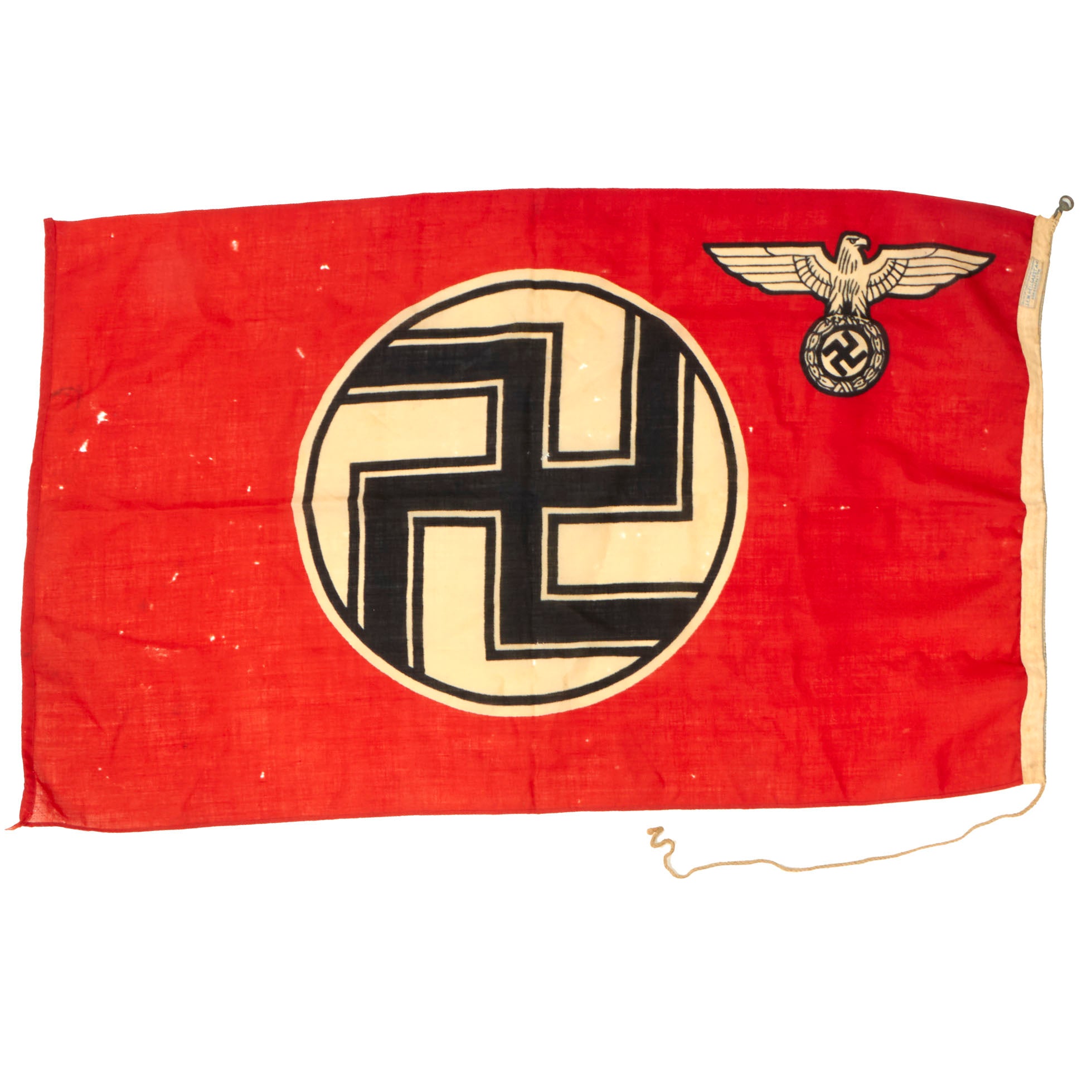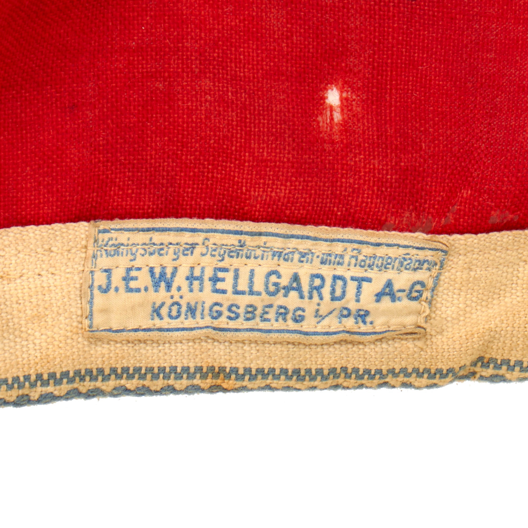 Original Item. Only One Available. This is a tremendous example of a WWII German NSDAP Reichsdienstflagge (State Service Flag)., measuring 28 by 45 inches. There is a tag attached to one edge that reads, Königsberger Segeltuchwaren - und Flaggenfabrik, J.E.W. HELLGARDT A.-G. KÖNIGSBERG i./PR. identifying the manufacturer. Following WWII, East Prussia was annexed by the Soviet Union, and Königsberg is today known as Kaliningrad. It has an embellished Swas (swas) in the center of the field, with the German Reichsadler (National Eagle) in the upper left corner or canton. It has a thick halyard sewn into the header, with a metal hook at one end and a rope at the other.