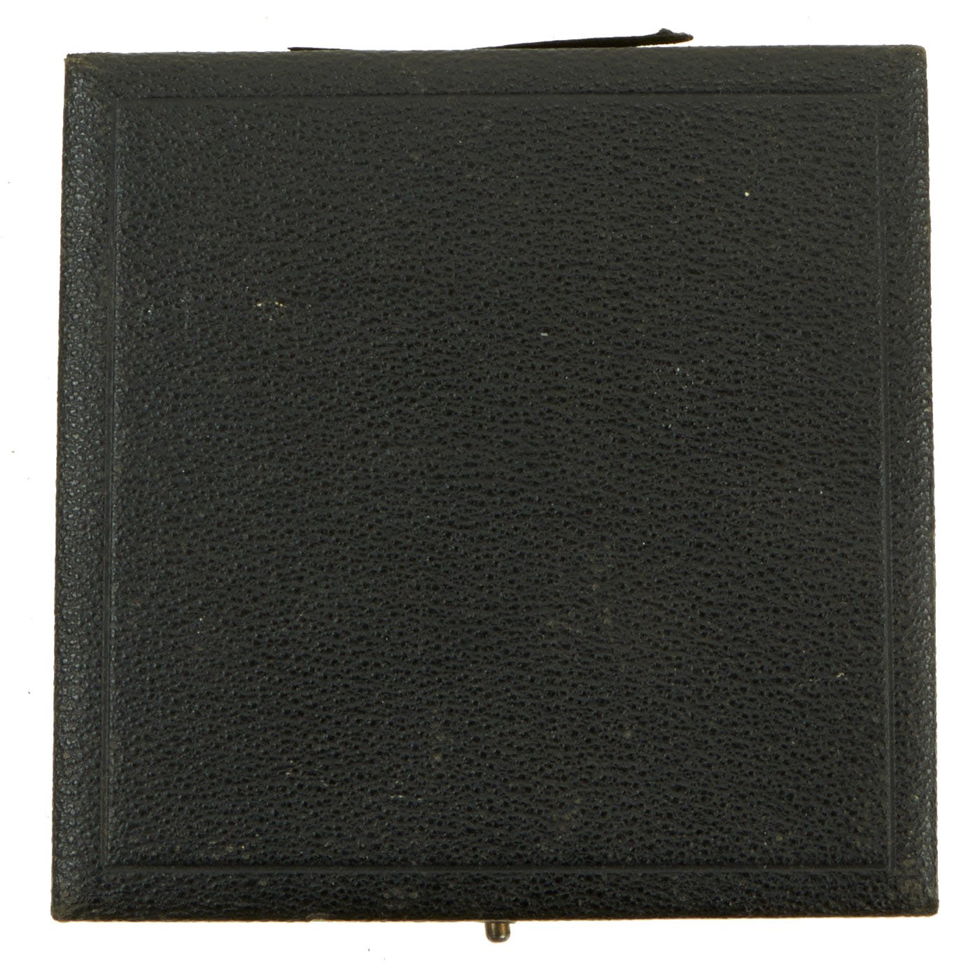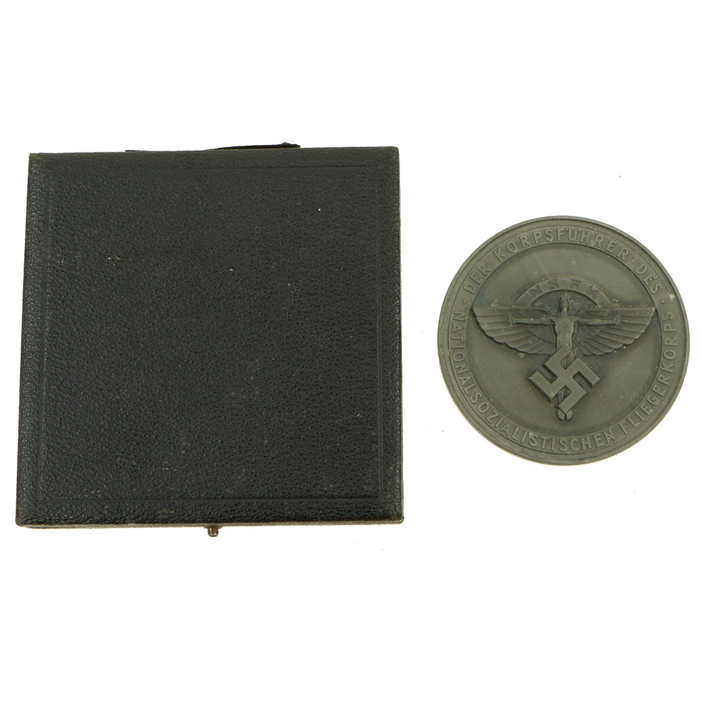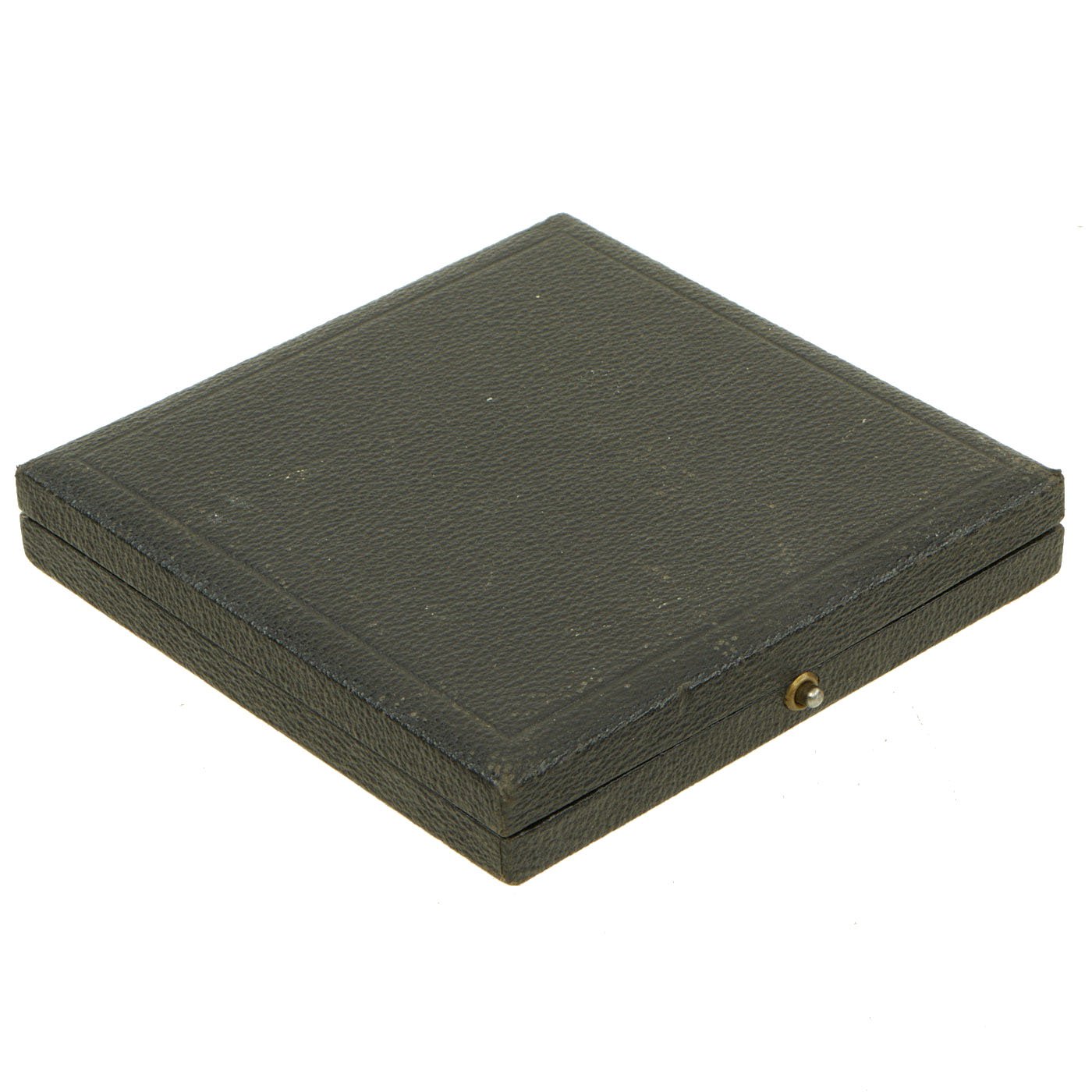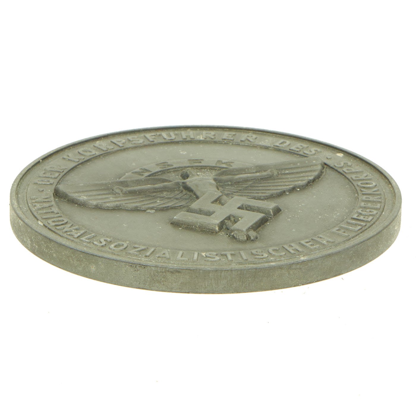 Original Item: Only One Available. This is a very nice German WWII Cased Presentation "Table Medal", a large award usually displayed on a shelf or table, as the name implies. Based on the inscription, it was awarded to the winner of the NSFK 1944 Indoor Flight Model Competition. The medal itself measures about 81mm in diameter, and is 6mm thick, made of die struck zinc alloy. It looks to originally have been silver washed, but that has since faded. It comes in a very nice satin and velvet lined case measuring about 4 3/4" square, with a functional hinge and lock.