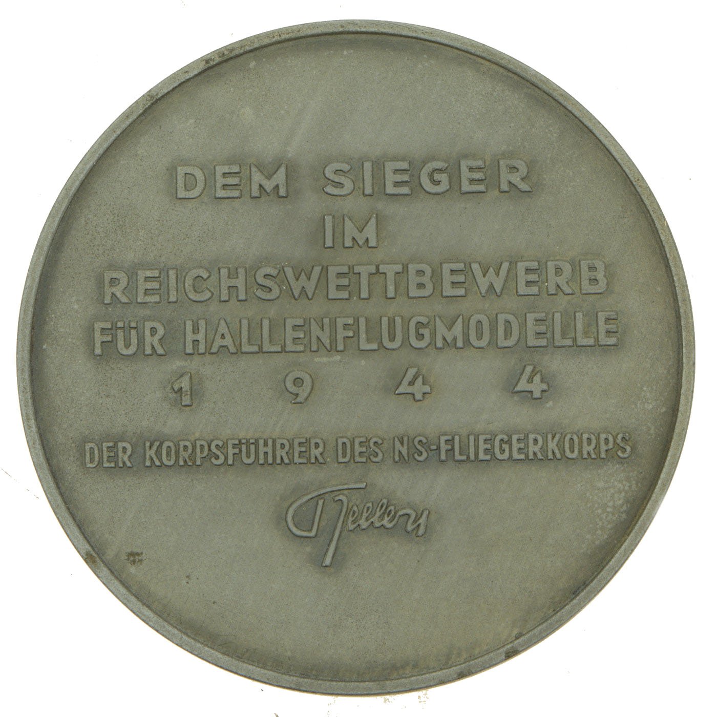 This roughly translates to "The Winner In The Reich Competition For Indoor Flight Models 1944", over the signature of the NSFK Leader Teller. We assume that this competition was one of many intended to build the aviation skills of the general population, with the intention of eventual military service.