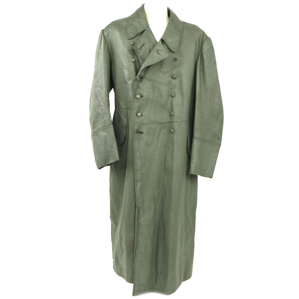 Original Item: Only One Available. This is an extremely rare blue leather overcoat or greatcoat as used by German NSKK Motorcycle riders during World War Two. It is heavy grade leather with a satin style internal lining, manufactured with excellent quality and offered in very good condition. Pebbled aluminum buttons are removable and maker marked. Internal snaps indicate that a heaver lining could be connected but it is missing. Appears to have had shoulder boards at one point.