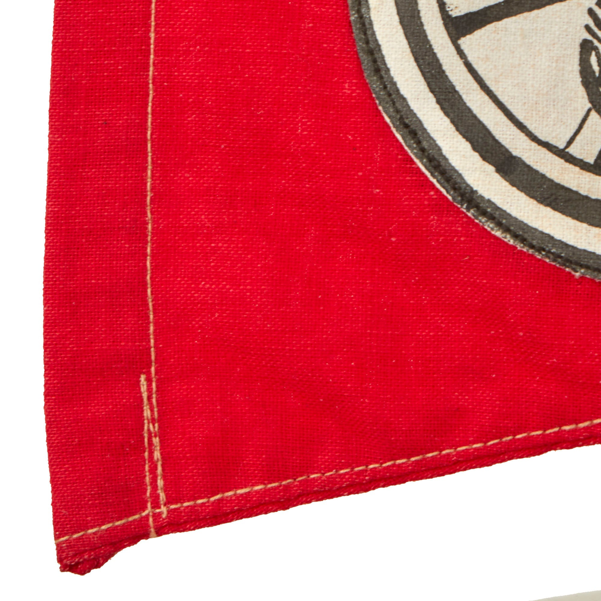 The overall condition of this extremely attractive NSKK vehicle pennant is good to very good. It is constructed from two triangular pieces of red wool cloth on the exterior, which have NSKK organizational insignia sewn onto both sides. These are sewn together around a red cotton center layer, and there are some stitched reinforcements at the tip. The hoist side has a sturdy red header, and there is no halyard attached.