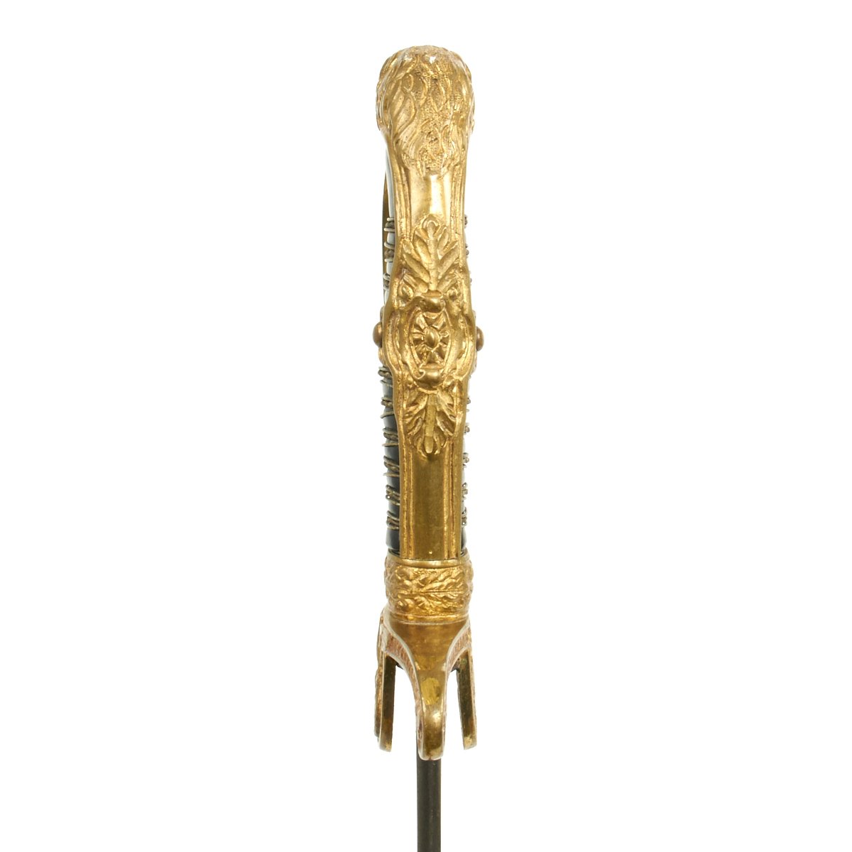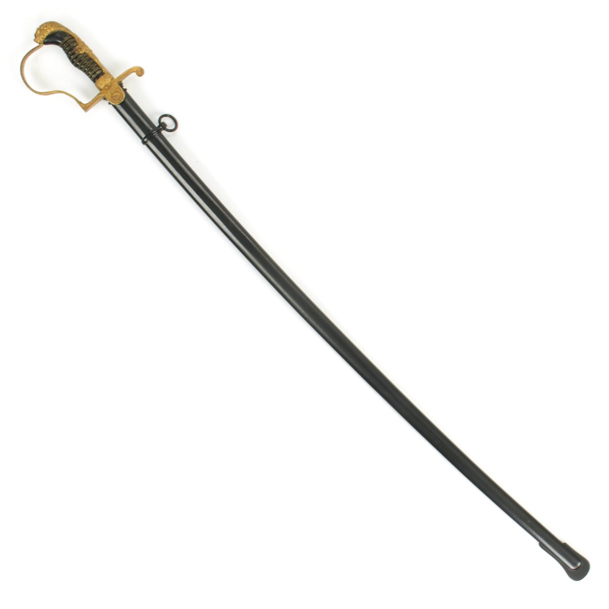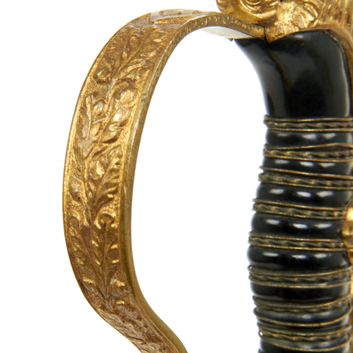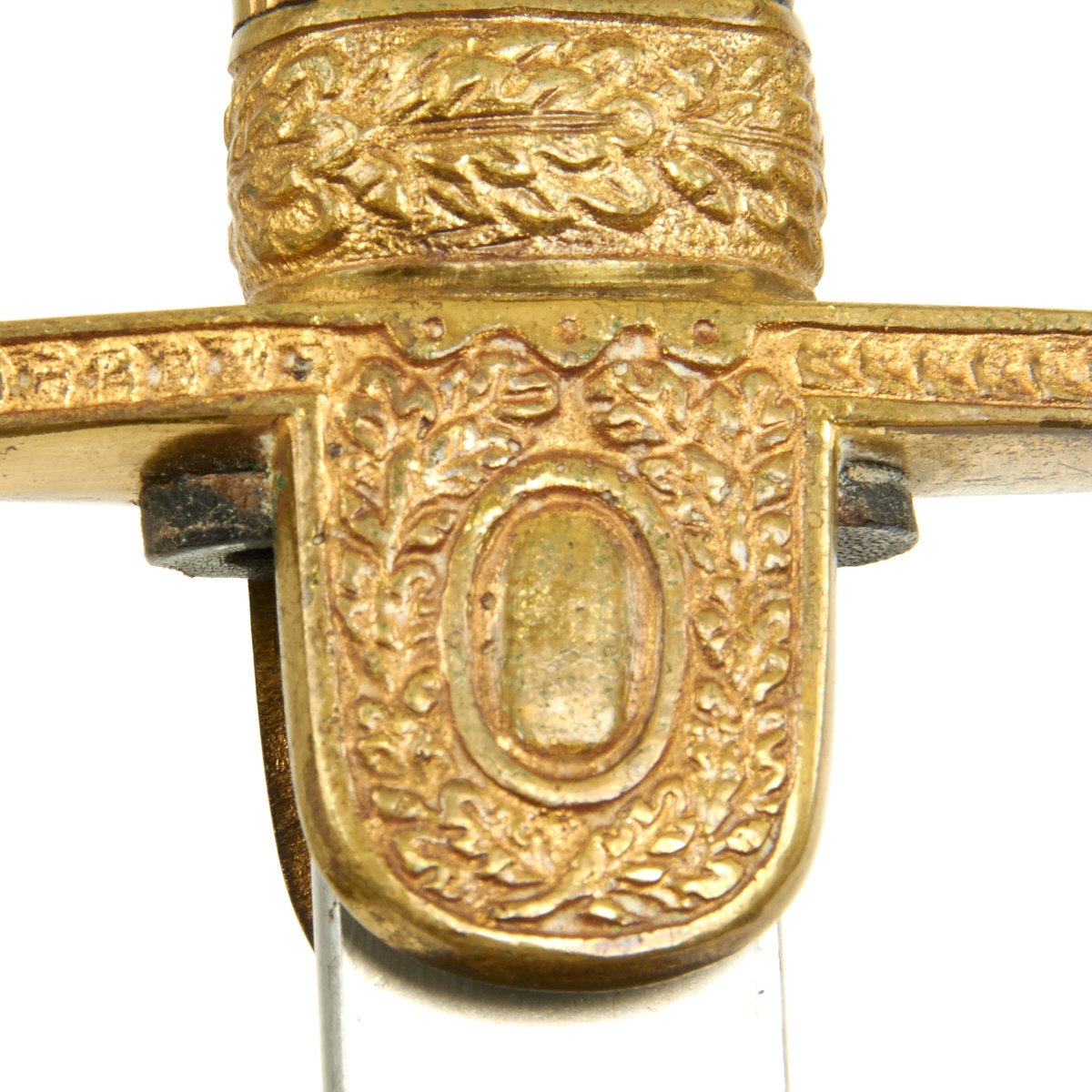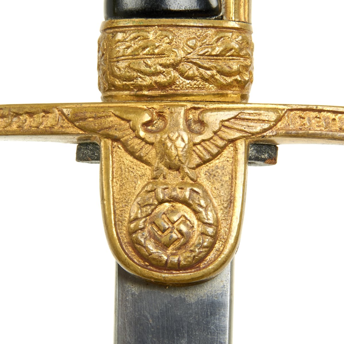 The crossguard has an open winged eagle which looks to the viewer's left. The breast area of this eagle, as well as the legs and the wreath enclosing the swas, have all been hand enhanced. The brass alloy hilt still has a good degree of the original gilded finish, making it very attractive.