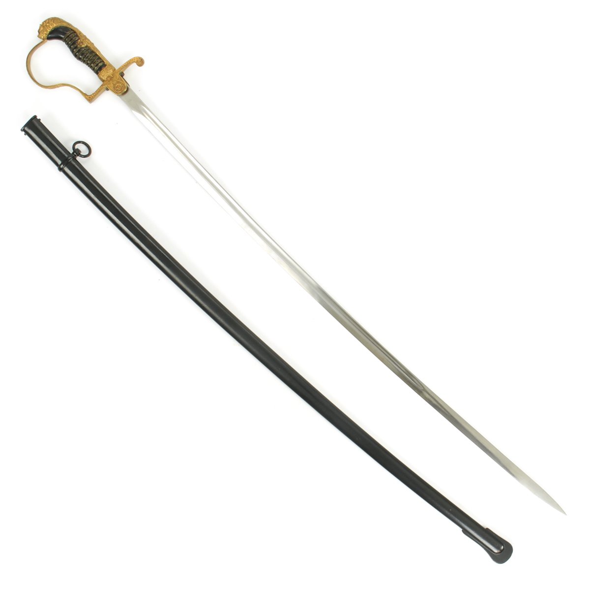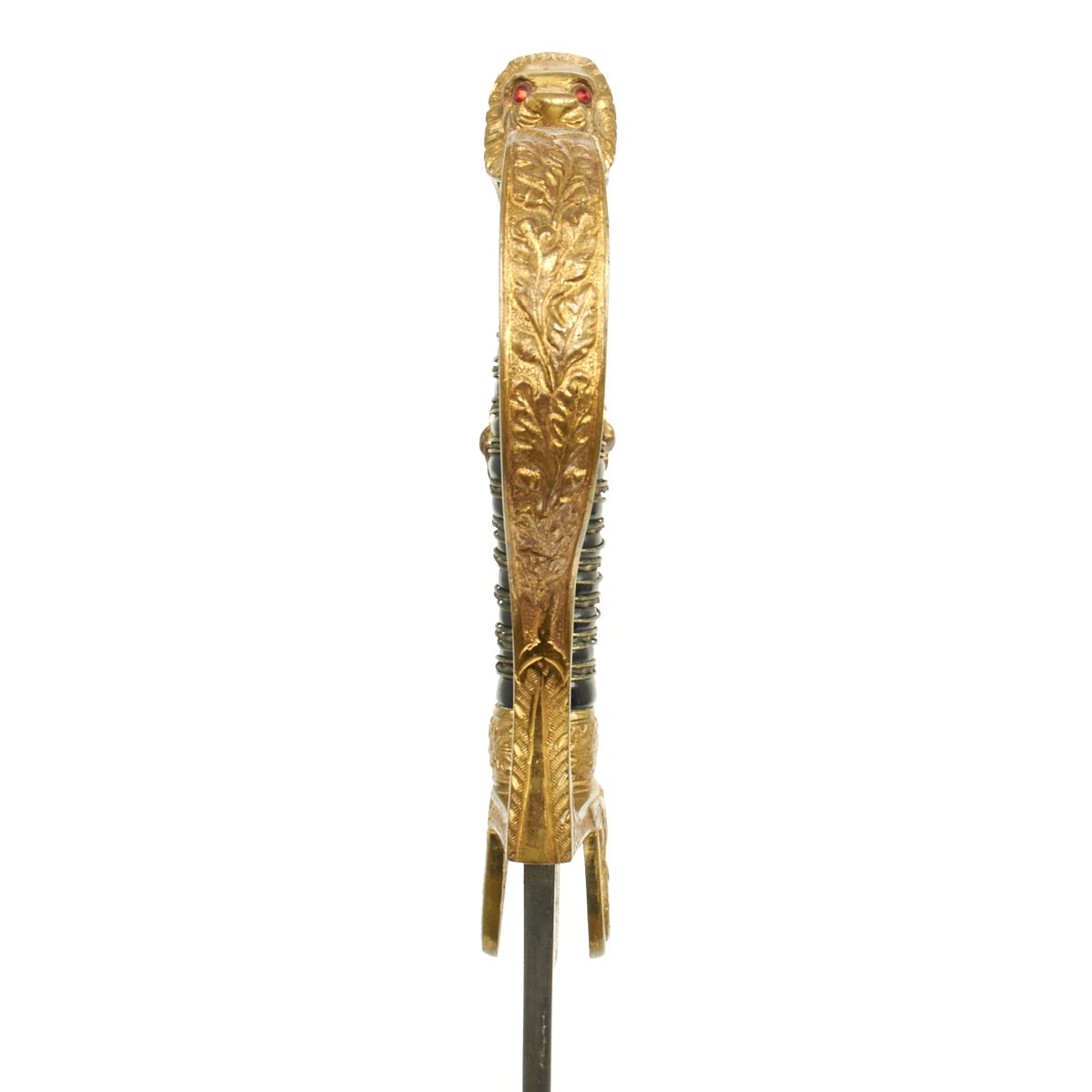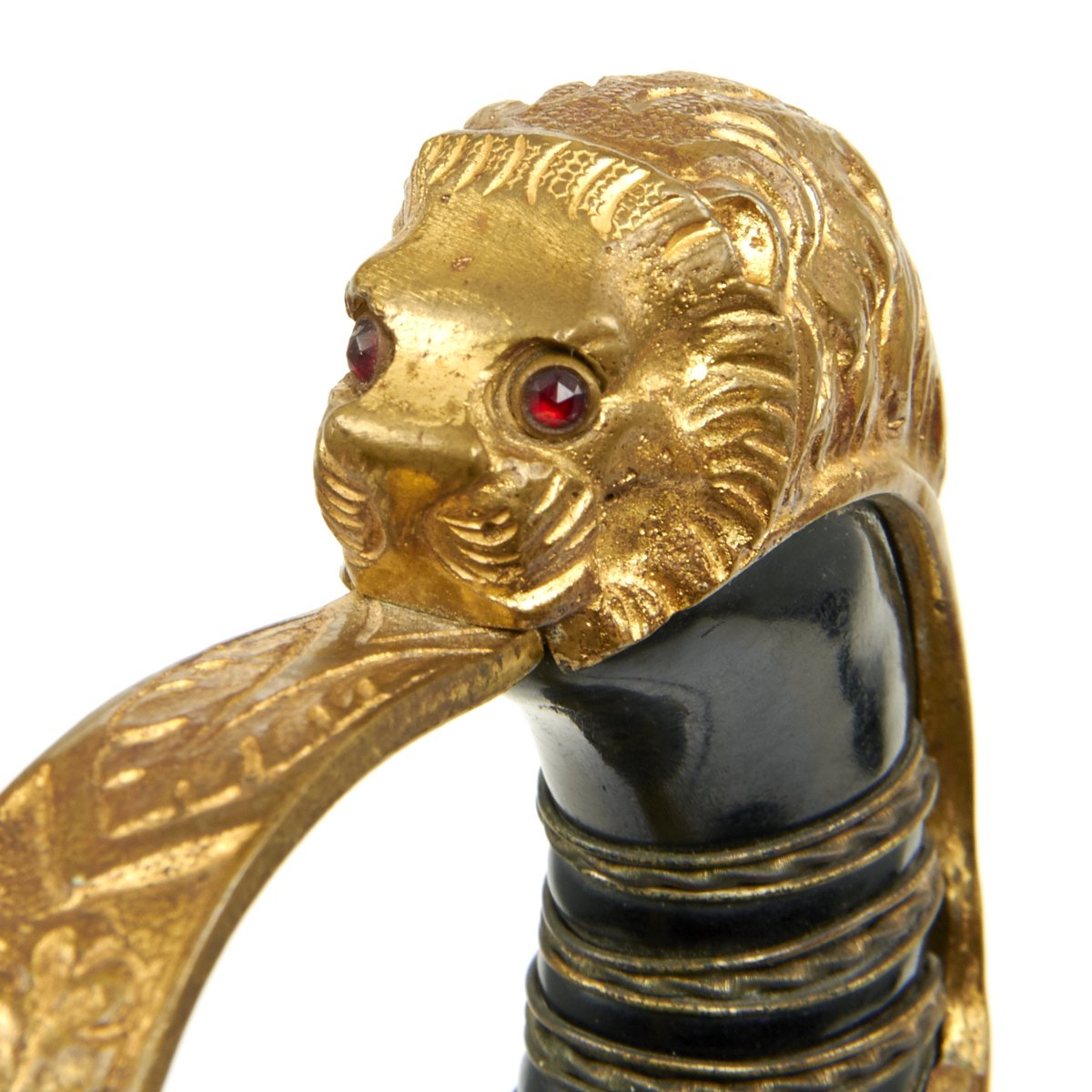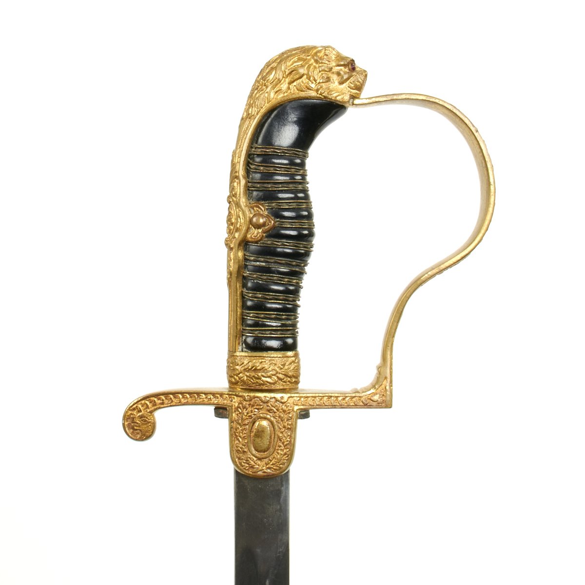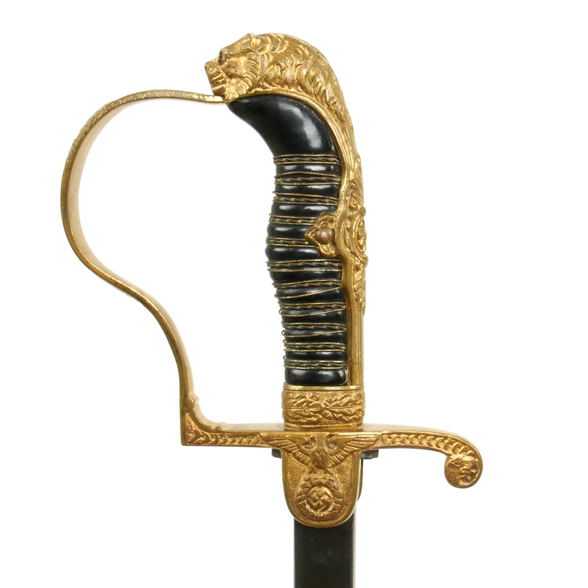 Original Item: Only One Available. This is a beautiful classic Lionhead German WWII Officer sword. The all brass hilt consists of a finely detailed lion head cat with oak leaf backstrap and "P" guard. The cat is fitted with blood red faceted "jewel" eyes. Nice detail throughout his whiskers, chin, and muzzle. The handwork is beautifully rendered throughout this brass. The backstrap consists of raised out oak leaves with double leaves flowing into the side tabs. The "D" guard has raised out oak leafing as does the ferrule.