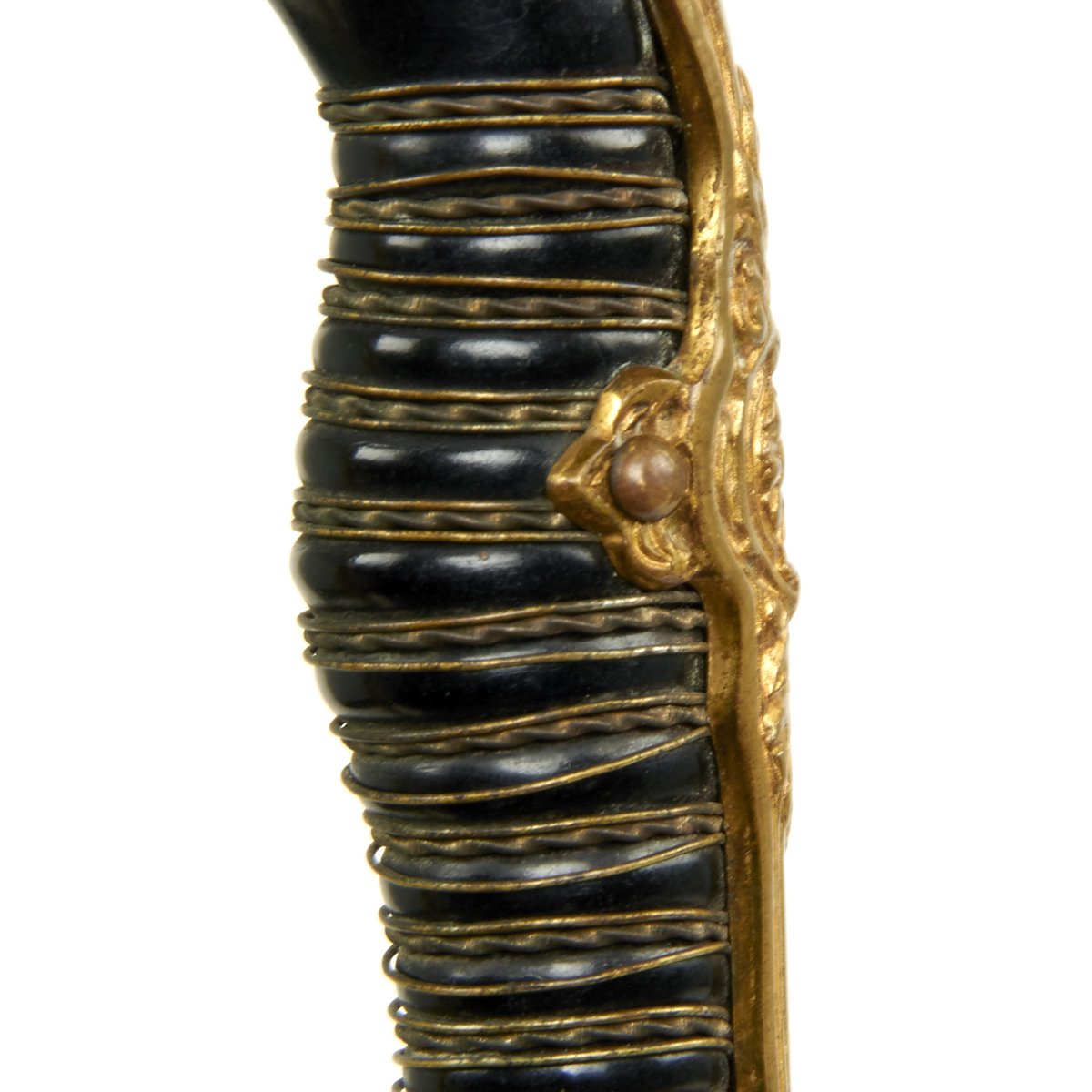 The grip is an outstanding black celluloid-over-wood base. It is wrapped with triple-twisted brass wire, the center being larger. The wire is all present but is la bit loose in a few places.