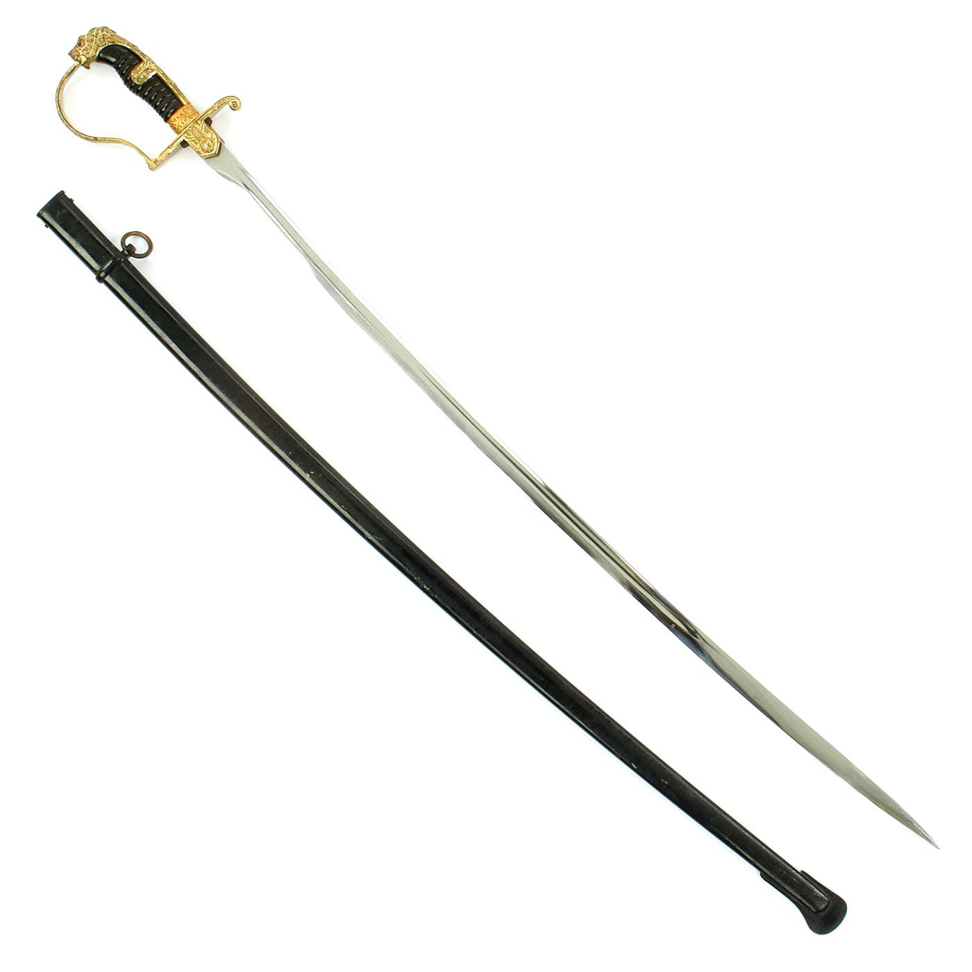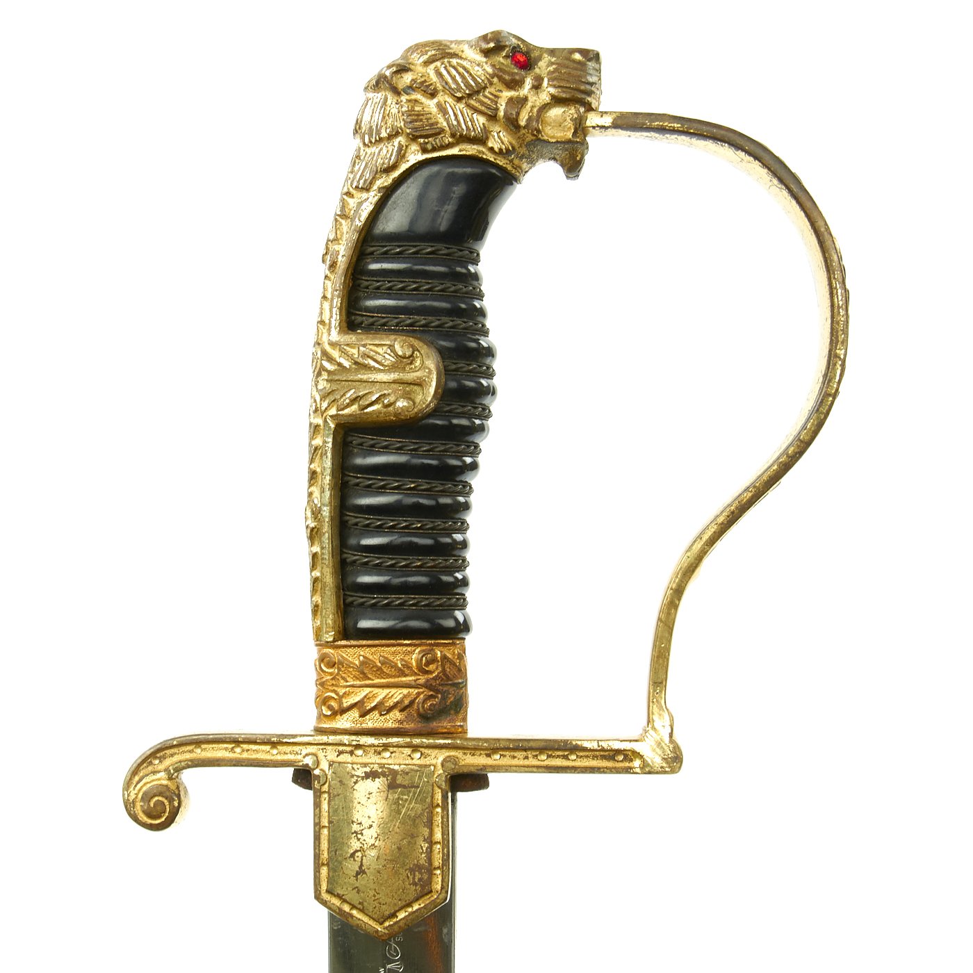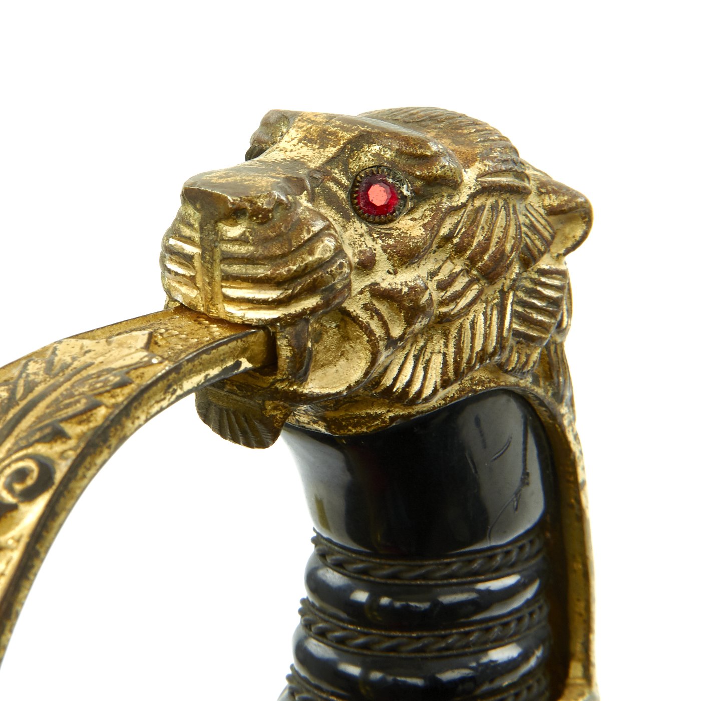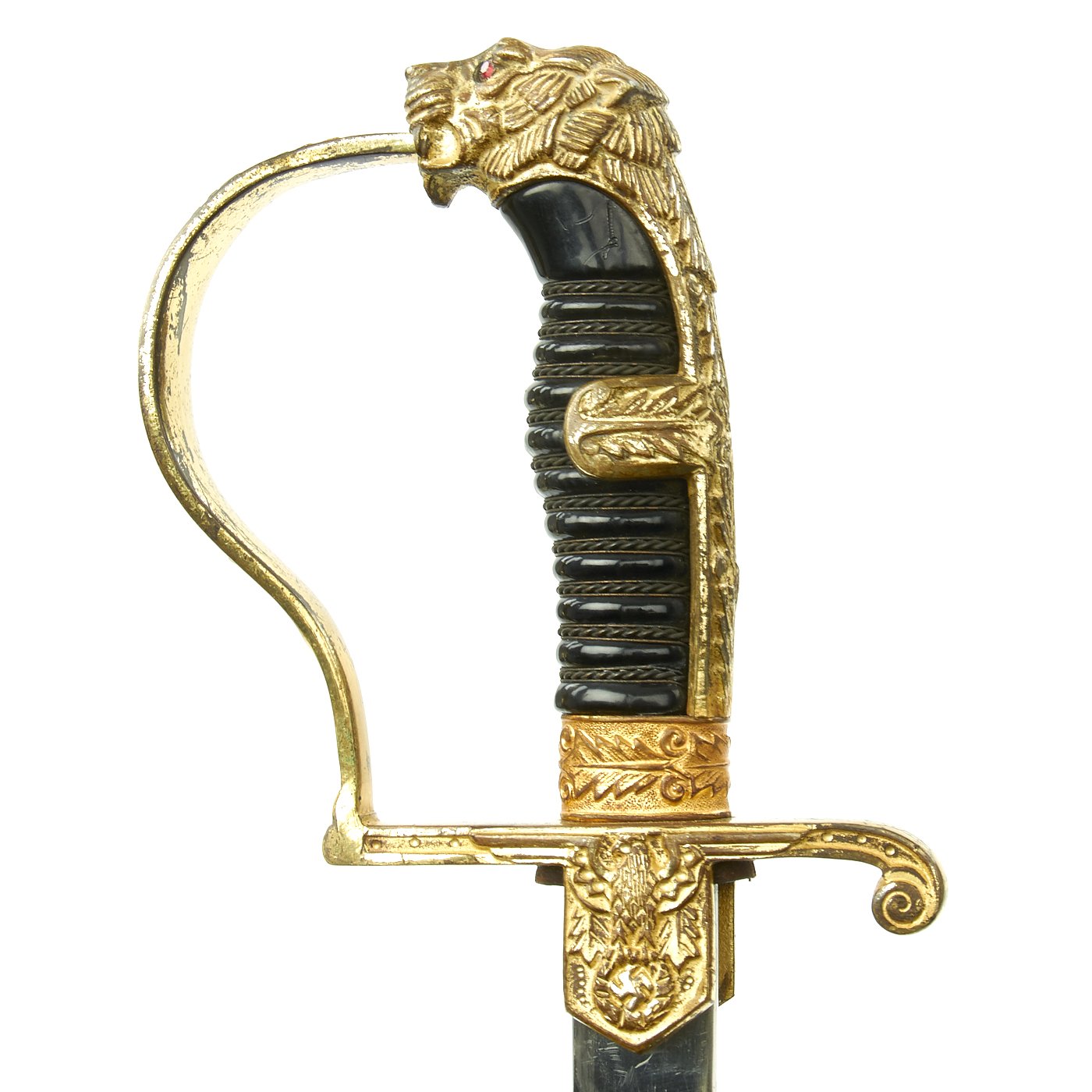 Original Item: This is a beautiful classic Lionhead German WWII Officer sword, made by the well-known firm of Alcoso Werke in Solingen, Germany. The all brass hilt consists of a finely detailed lion head cat with art deco leaf backstrap and "P" guard. The cat is fitted with blood red faceted eyes. Nice detail throughout his whiskers, chin, and muzzle. The handwork is beautifully rendered throughout this brass. The backstrap consists of raised out leaves with double leaves flowing into the side tabs. These may be oak leaves, but they are quite angular compared to the standard ones used.
