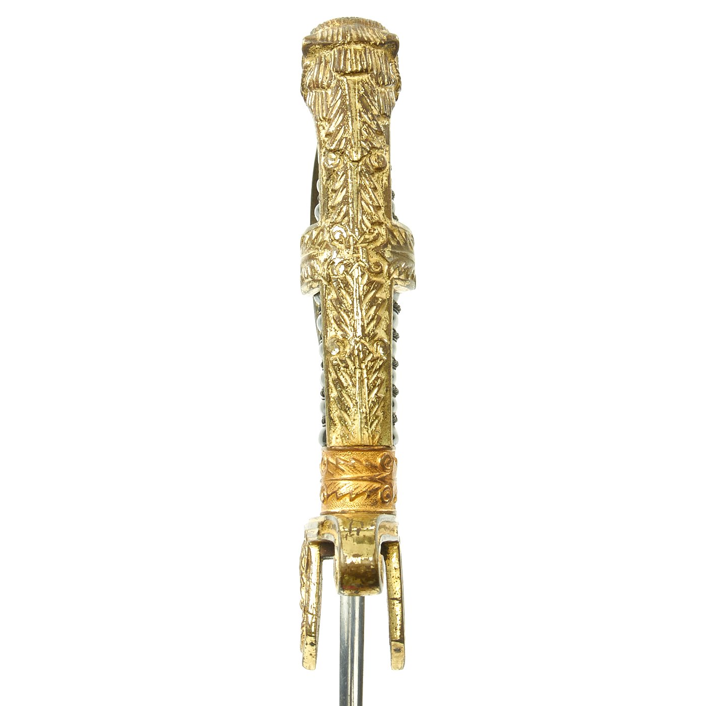 The crossguard langet has a typical Alcoso style open winged eagle which looks to the viewer's left. The breast area of this eagle, as well as the legs and the wreath enclosing the swas, have all been hand enhanced. The reverse langet is blank, but would often be personized with a monogram. The brass alloy hilt still has a good degree of the original gilded finish, making it very attractive, one of the best Alcoso-made swords we have seen.