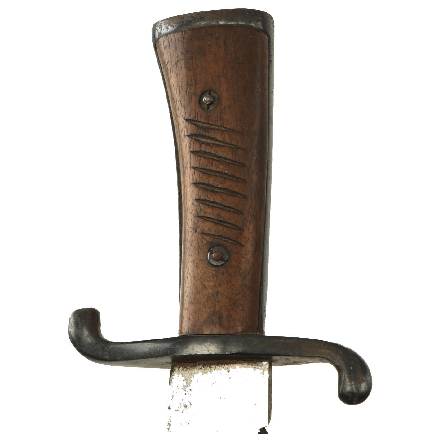 The construction of this machete matches the others we have seen, with a leave heavy "falchion" shaped machete blade, an "S" shaped crossguard, and a comfortable wooden ribbed handle. Overall the condition is very good, with some light rust peppering on the blued areas of the handle. The grip wood is still very nice, showing only light wear, with no cracks, chips, or stains.