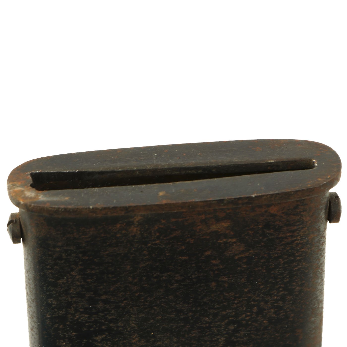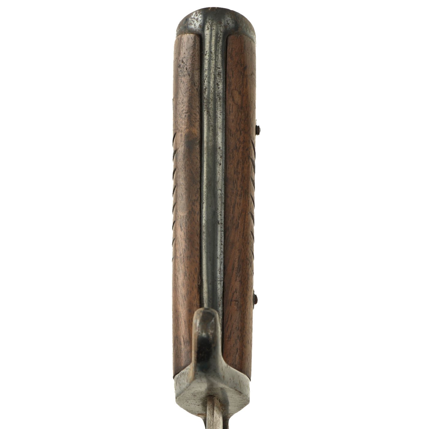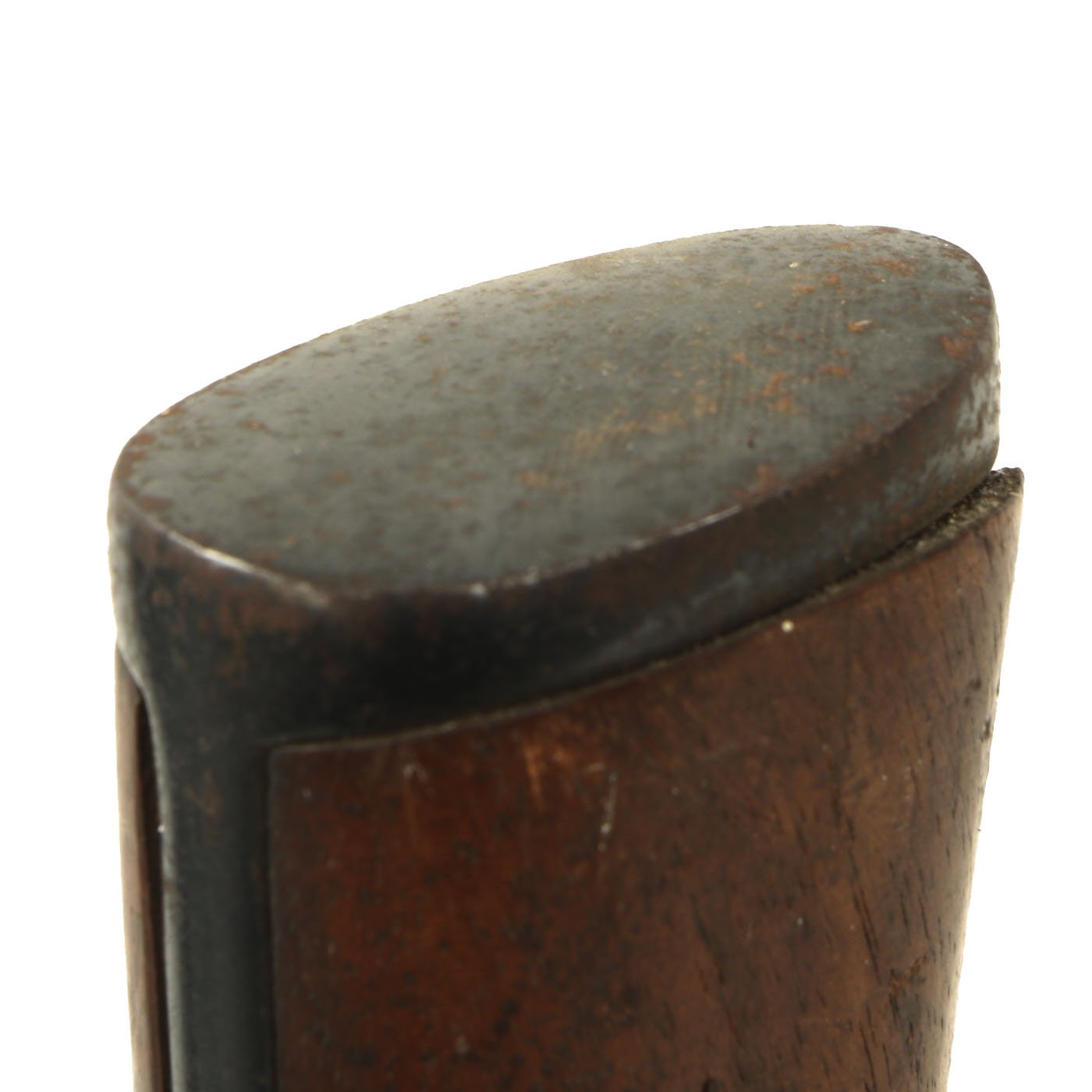 The heavy blued scabbard still retains most of the original finish, with light rust peppering. It still shows the original factory texture from being ground clean after one side was welded together, as well as the usual rolling marks. It still has the frog button and an intact throat.
