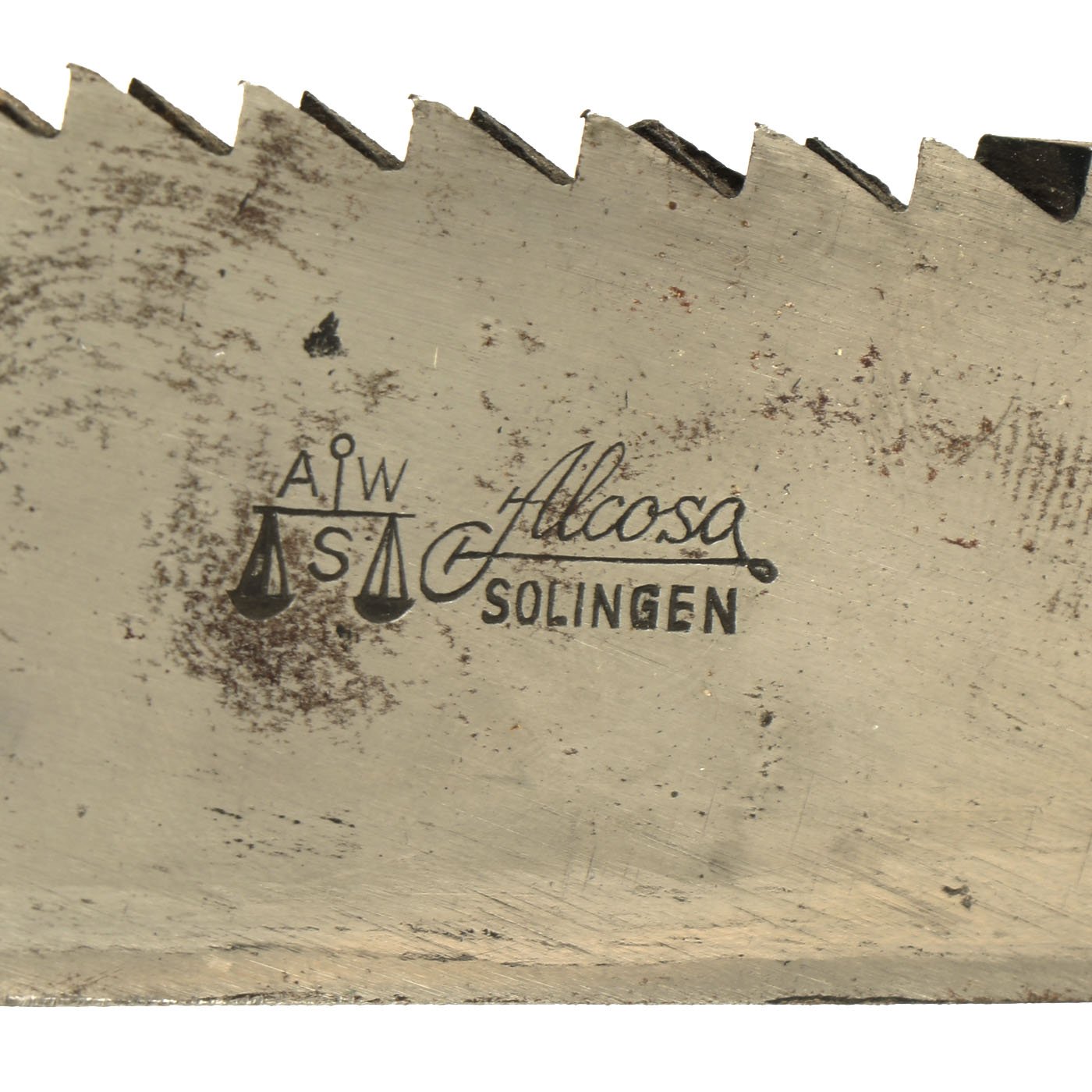 The trademark on the back of the blade is one of the trademarks that Alcoso used from 1940-1943. It depicts the scales with the firm's initials, AWS interspersed. Next to this is the firm's name in cursive script, Alcoso, and below the town of business, SOLINGEN, the legendary "City of Blades" in Western Germany.