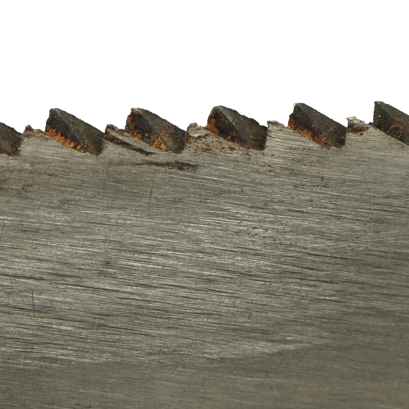 The blade still shows much of the original factory grinding, as well as sharpening and use. There is some light oxidation in areas, and also near the edge, which looks to have remnants of plant sap on it. The sawback is still mostly sharp, showing light use and also some traces of plant sap. Many areas of the blade are still quite sharp. The blade flats has the expected wear from the runners in the scabbard.