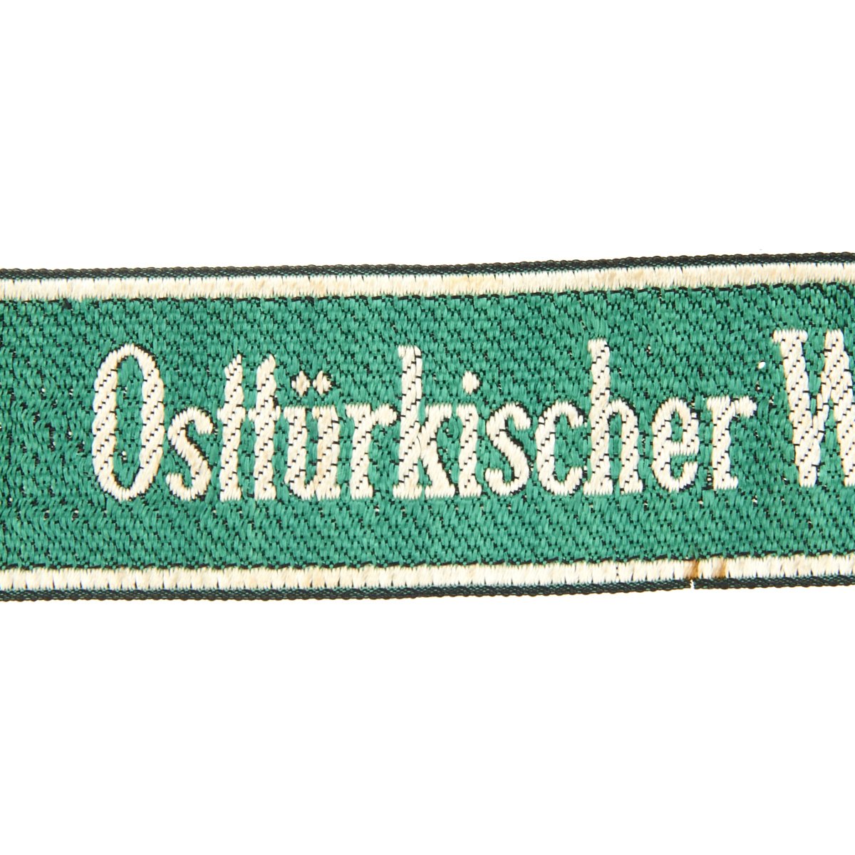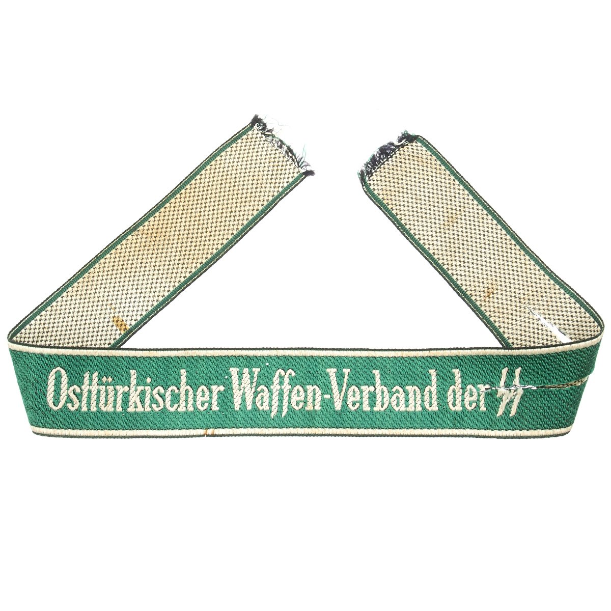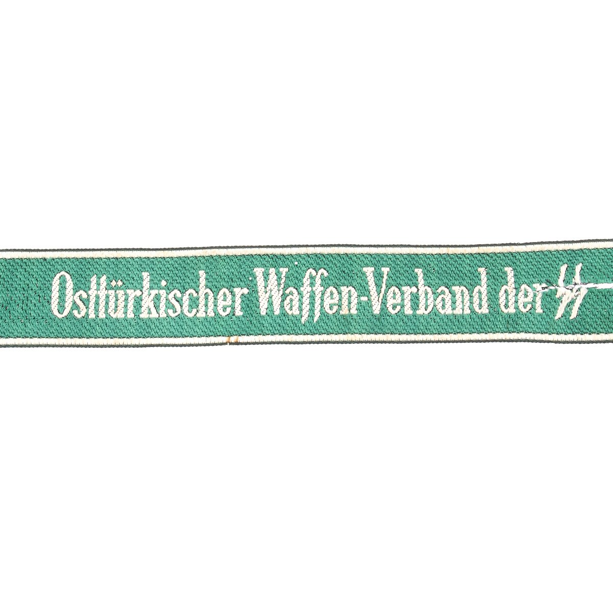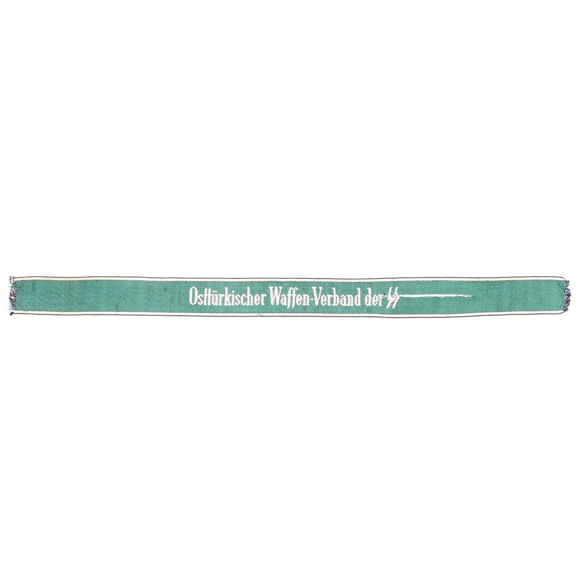 Original Item: Only One Available. CC Camp made green, white and black embroidery, inscribed "Osttürkischer Waffen-Verband der SS" in white on a green field, with black and white trim along the two lateral edges, 1 1/8 inch x 17 inches. Overall condition is excellent, with the exception of a 3 inch spit in the center of the band. It has been backed with clear fabric tape to prevent further loss. This tape can be easily removed.